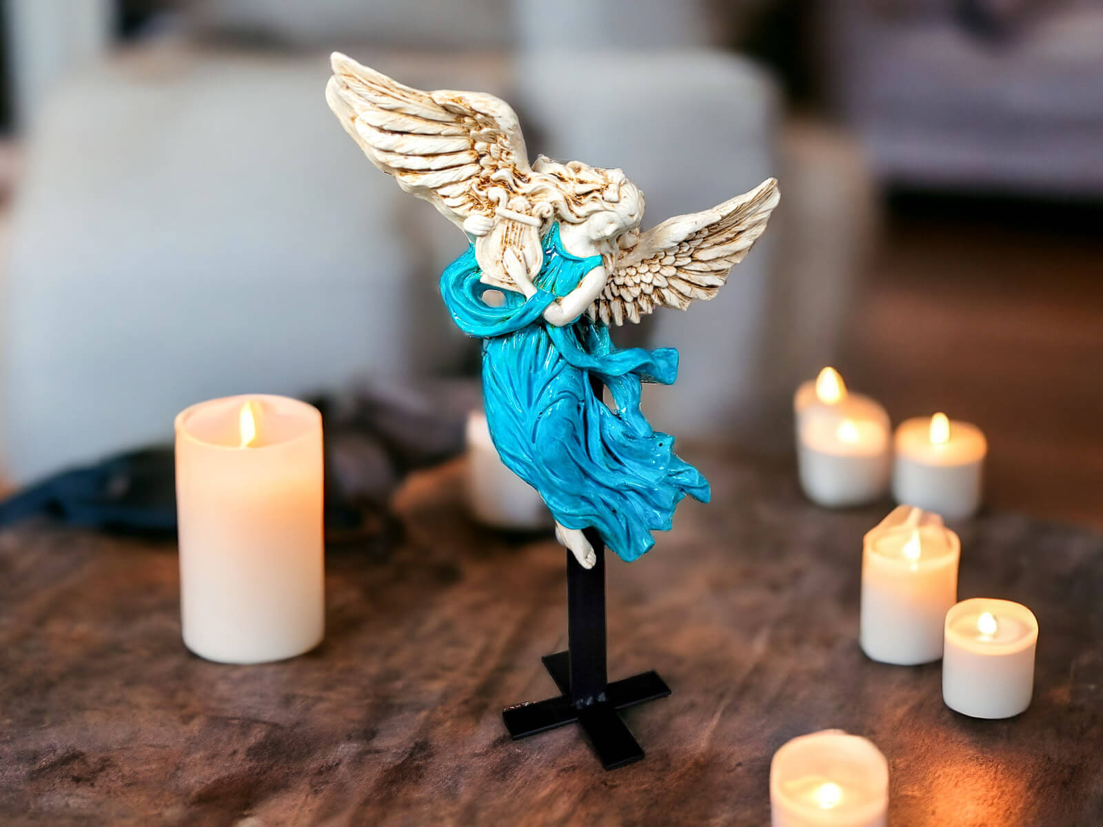 Turkusowa szata anioła jest wyrazem harmonii, spokoju i elegancji. Kolor ten nadaje postaci wyjątkowego charakteru, podkreślając jej artystyczny urok.