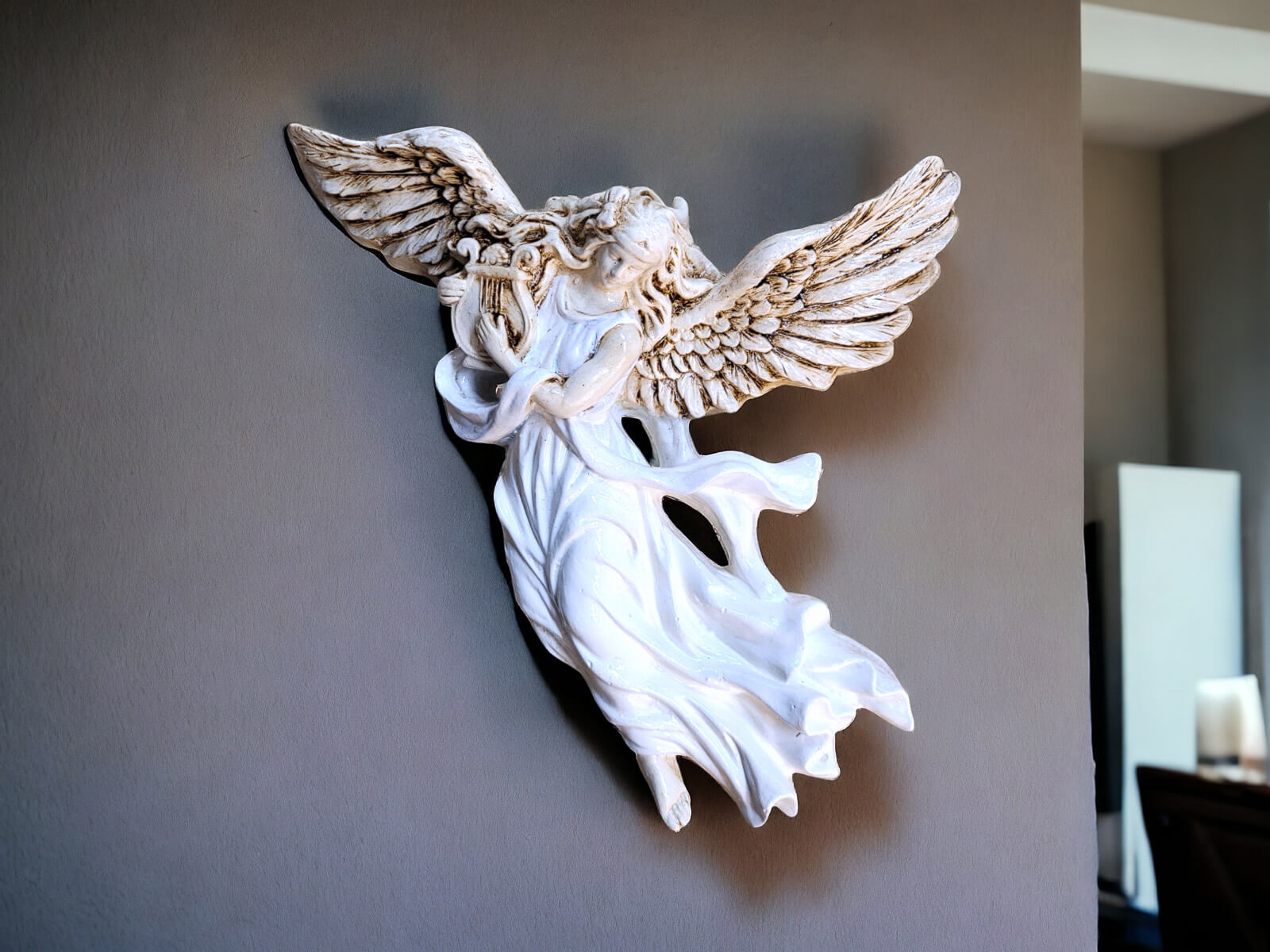 Anioł z Harfą w białej sukni to ręcznie robiona figurka do powieszenia na ścianie z możliwością personalizacji. Figurka to mistyczne połączenie piękna i rękodzielniczej precyzji, której delikatność i elegancja sprawią, że stanie się wyjątkową ozdobą Twojego wnętrza. To nie tylko ręcznie wykonana figurka, ale prawdziwe dzieło sztuki, które emanuje spokojem i pięknem.