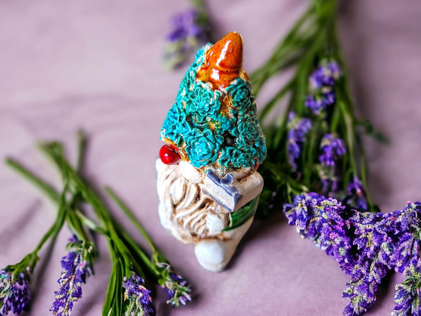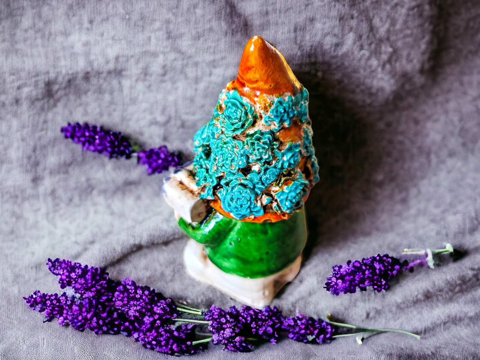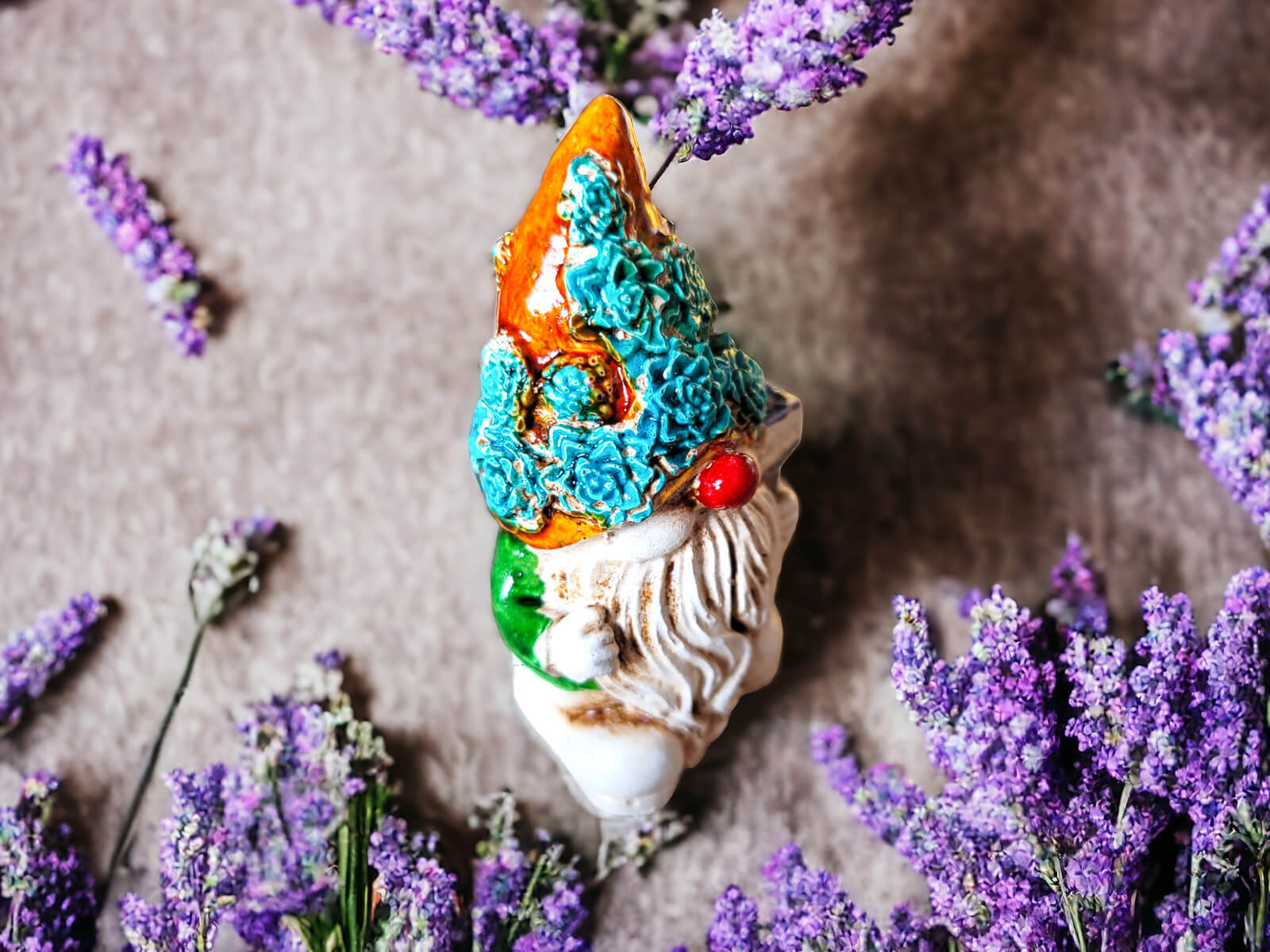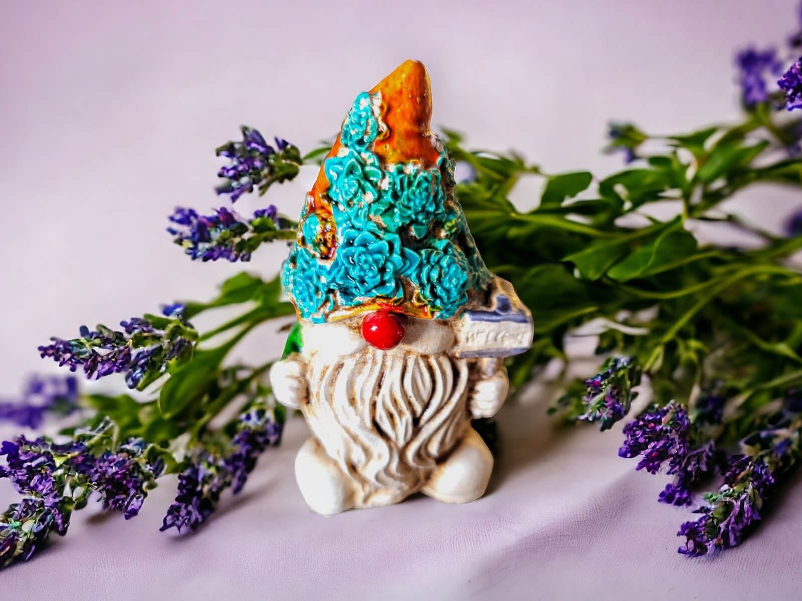 Skrzat Witaj prezentuje się w zielonym ubraniu, co nadaje mu subtelności i neutralności. Jego pomarańczowa pokryta kwiatami czapka jest modnym elementem, który Skrzat nosi z dumą. Ta długa czapka to jego nieodłączny atrybut, który nadaje mu charakterystyczny wygląd.