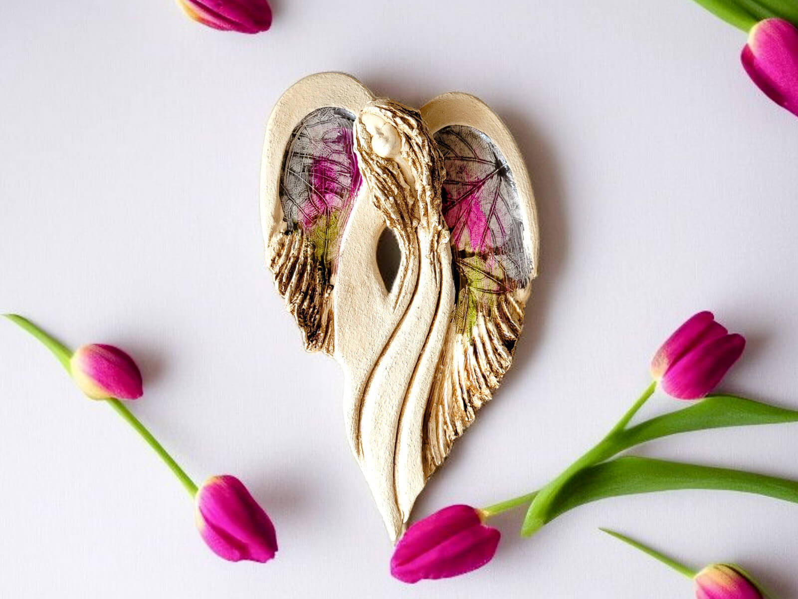 Unikalny anioł Cynthia z kolekcji Art Leaf z wzorami prawdziwych liści. Jedyna sztuka z tym wzorem. Wyjątkowa uroda, ujmująca delikatność, wielka wrażliwość, kwintesencja kobiecości, pełna miłości, porywająca, a jednocześnie zapewniająca spokój. Zobacz jak pięknie chroni miłość, jak dba i troszczy się o Ciebie i Twoich bliskich, opiekuje, obdarza wiarą dającą siłę, rozlewa radość do każdego zakątka mieszkania, przepełnia je dobrocią, sercem pełnym nadziei, sprawia, że miłość dwojga ludzi jest spokojną przystanią.