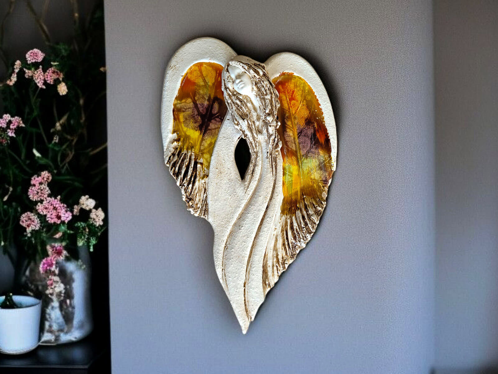 Unikalny anioł Cynthia z kolekcji Art Leaf z wzorami prawdziwych liści. Jedyna sztuka z tym wzorem. Wyjątkowa uroda, ujmująca delikatność, wielka wrażliwość, kwintesencja kobiecości, pełna miłości, porywająca, a jednocześnie zapewniająca spokój. Zobacz jak pięknie chroni miłość, jak dba i troszczy się o Ciebie i Twoich bliskich, opiekuje, obdarza wiarą dającą siłę, rozlewa radość do każdego zakątka mieszkania, przepełnia je dobrocią, sercem pełnym nadziei, sprawia, że miłość dwojga ludzi jest spokojną przystanią.