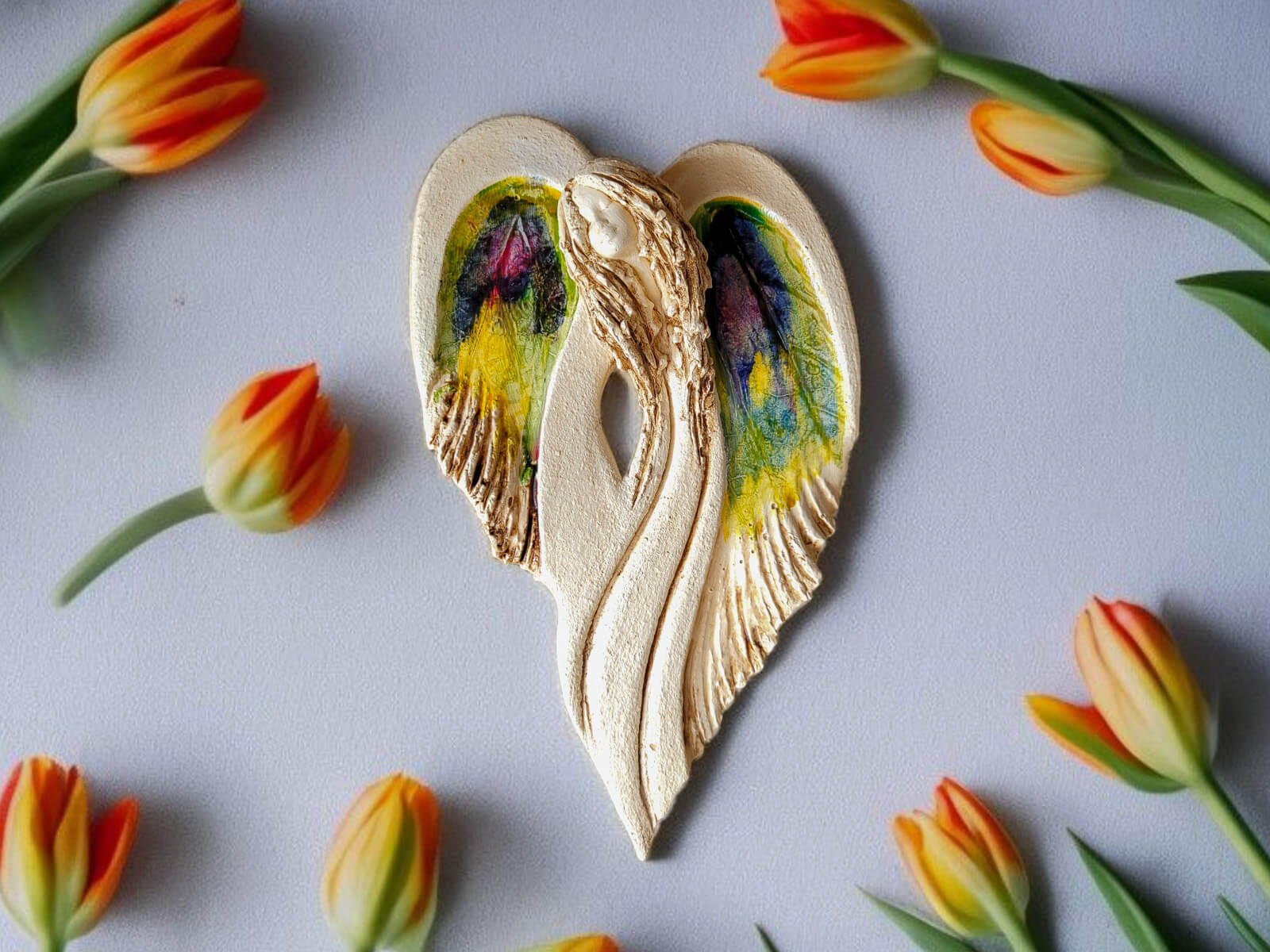 Unikalny anioł Cynthia z kolekcji Art Leaf z wzorami prawdziwych liści. Jedyna sztuka z tym wzorem. Wyjątkowa uroda, ujmująca delikatność, wielka wrażliwość, kwintesencja kobiecości, pełna miłości, porywająca, a jednocześnie zapewniająca spokój. Zobacz jak pięknie chroni miłość, jak dba i troszczy się o Ciebie i Twoich bliskich, opiekuje, obdarza wiarą dającą siłę, rozlewa radość do każdego zakątka mieszkania, przepełnia je dobrocią, sercem pełnym nadziei, sprawia, że miłość dwojga ludzi jest spokojną przystanią.