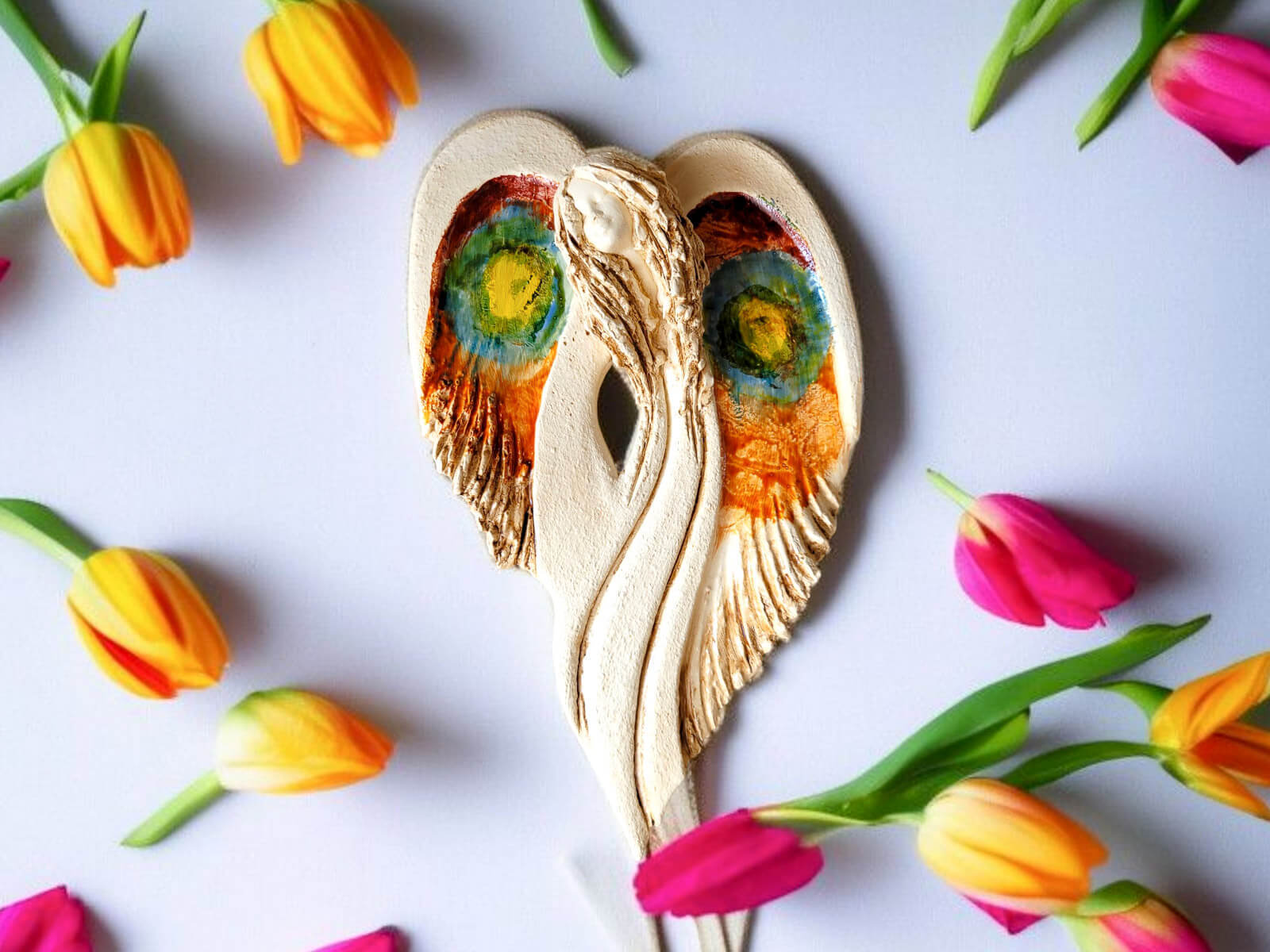 Unikalny anioł Cynthia z kolekcji Art Leaf z wzorami prawdziwych liści. Jedyna sztuka z tym wzorem. Wyjątkowa uroda, ujmująca delikatność, wielka wrażliwość, kwintesencja kobiecości, pełna miłości, porywająca, a jednocześnie zapewniająca spokój.  Zobacz jak pięknie chroni miłość, jak dba i troszczy się o Ciebie i Twoich bliskich, opiekuje, obdarza wiarą dającą siłę, rozlewa radość do każdego zakątka mieszkania, przepełnia je dobrocią, sercem pełnym nadziei, sprawia, że miłość dwojga ludzi jest spokojną przystanią.