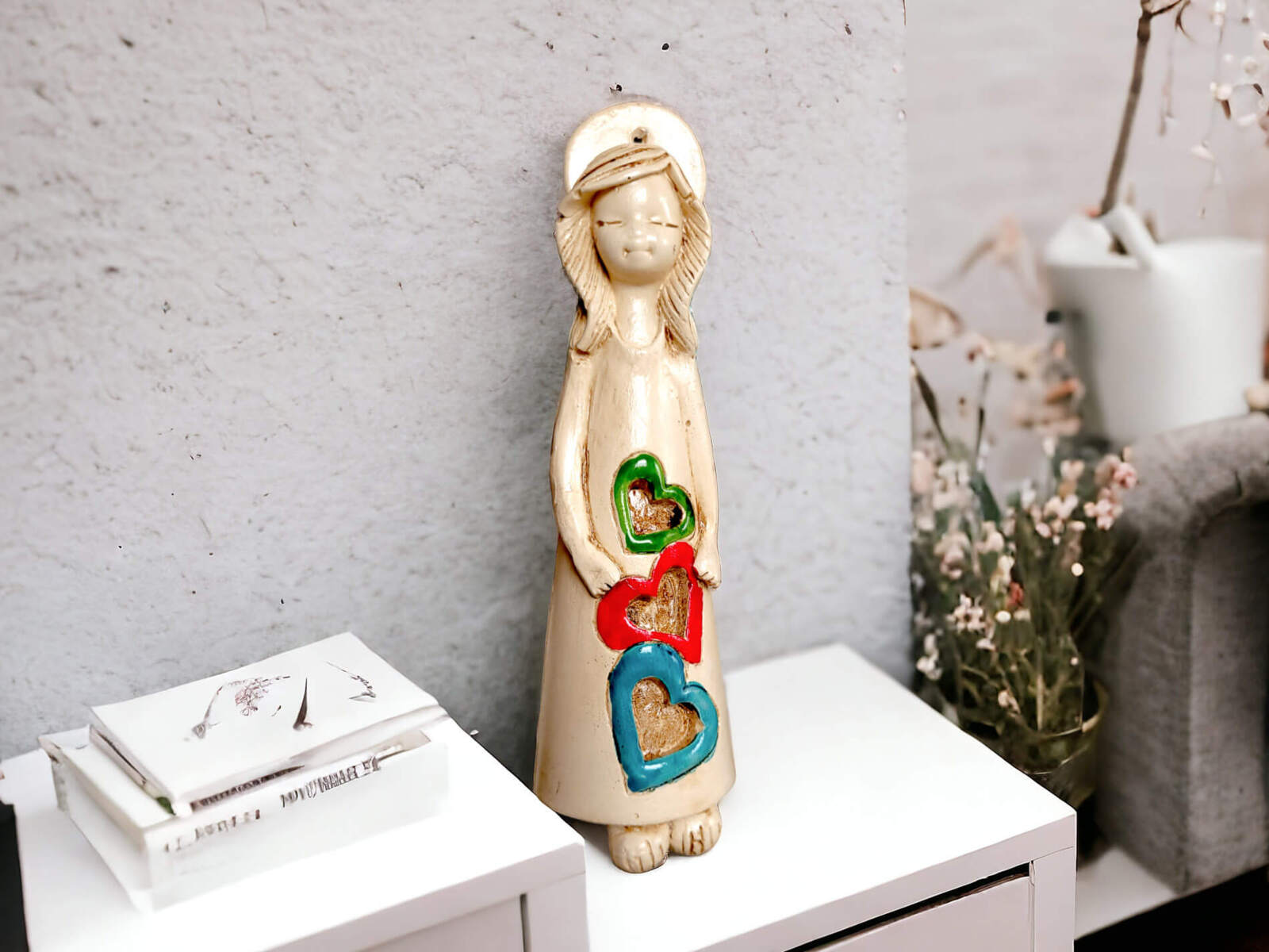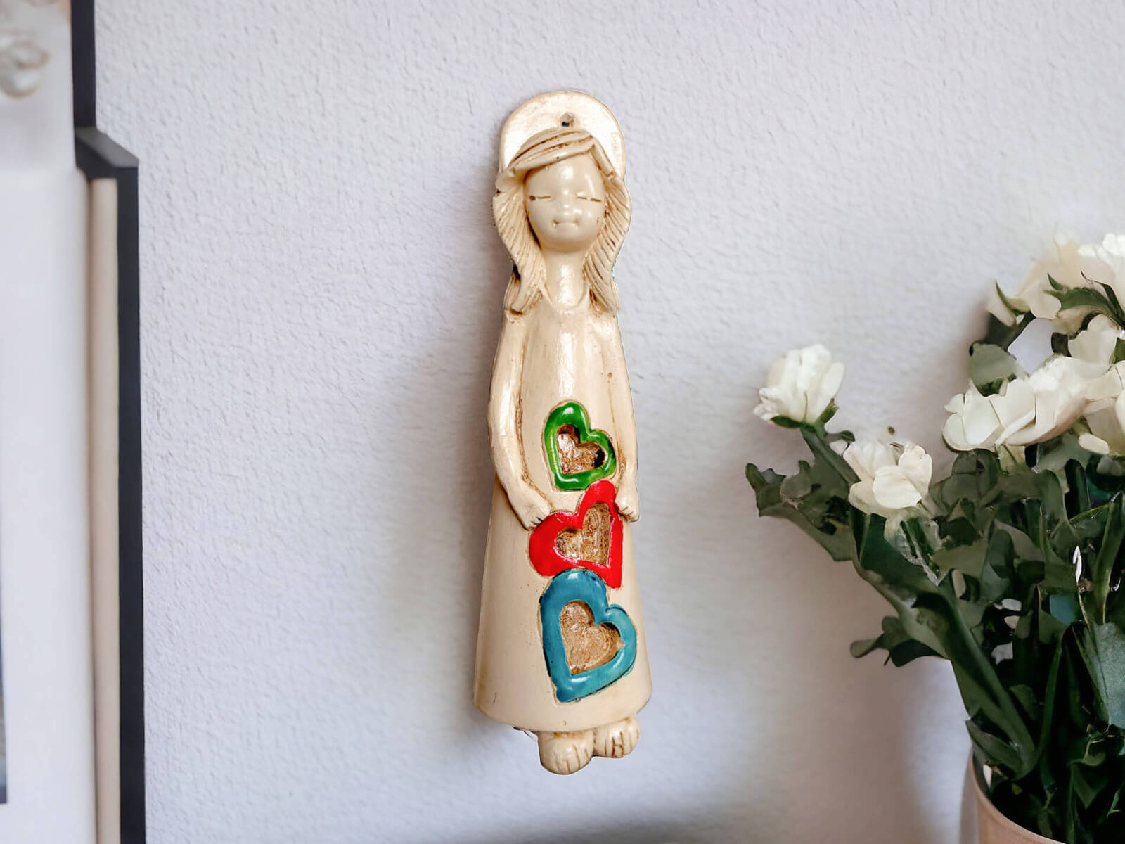 Ręcznie robiony aniołek Lioninka z czerwonymi dodatkami. Aniołek do powieszenia za dziurkę.
