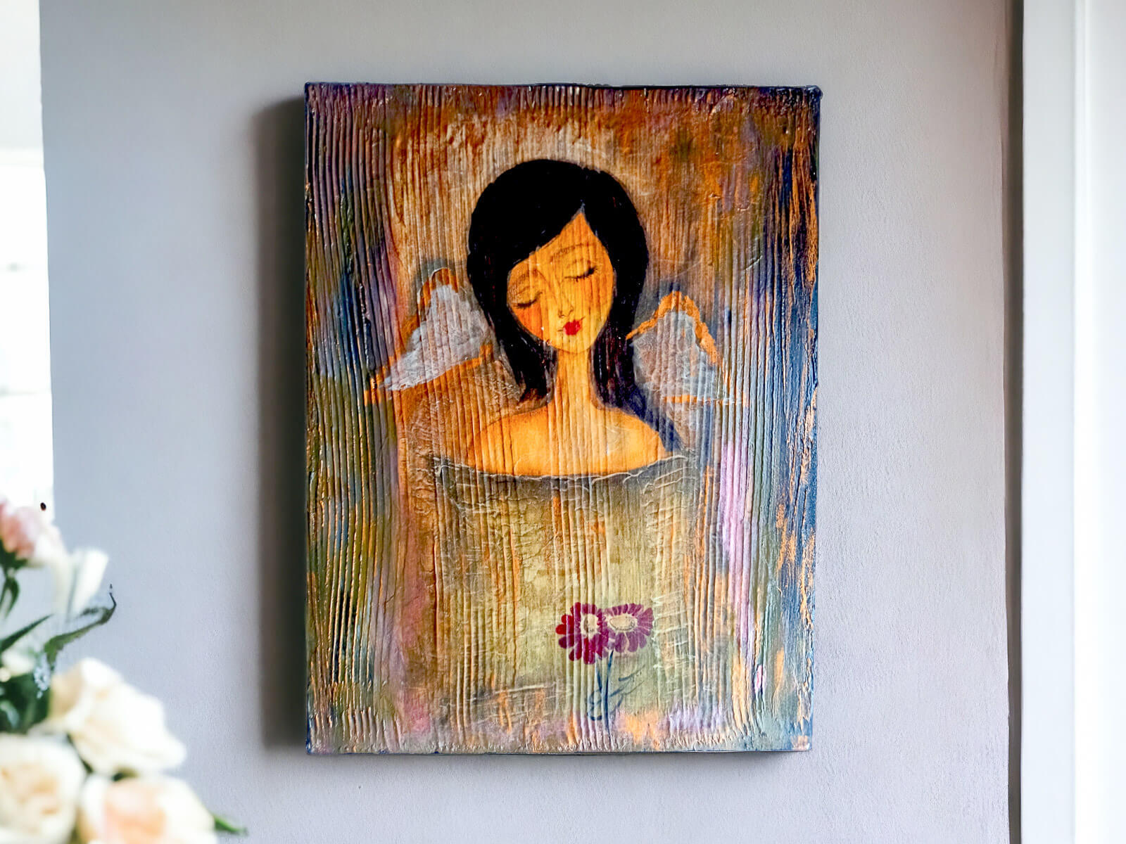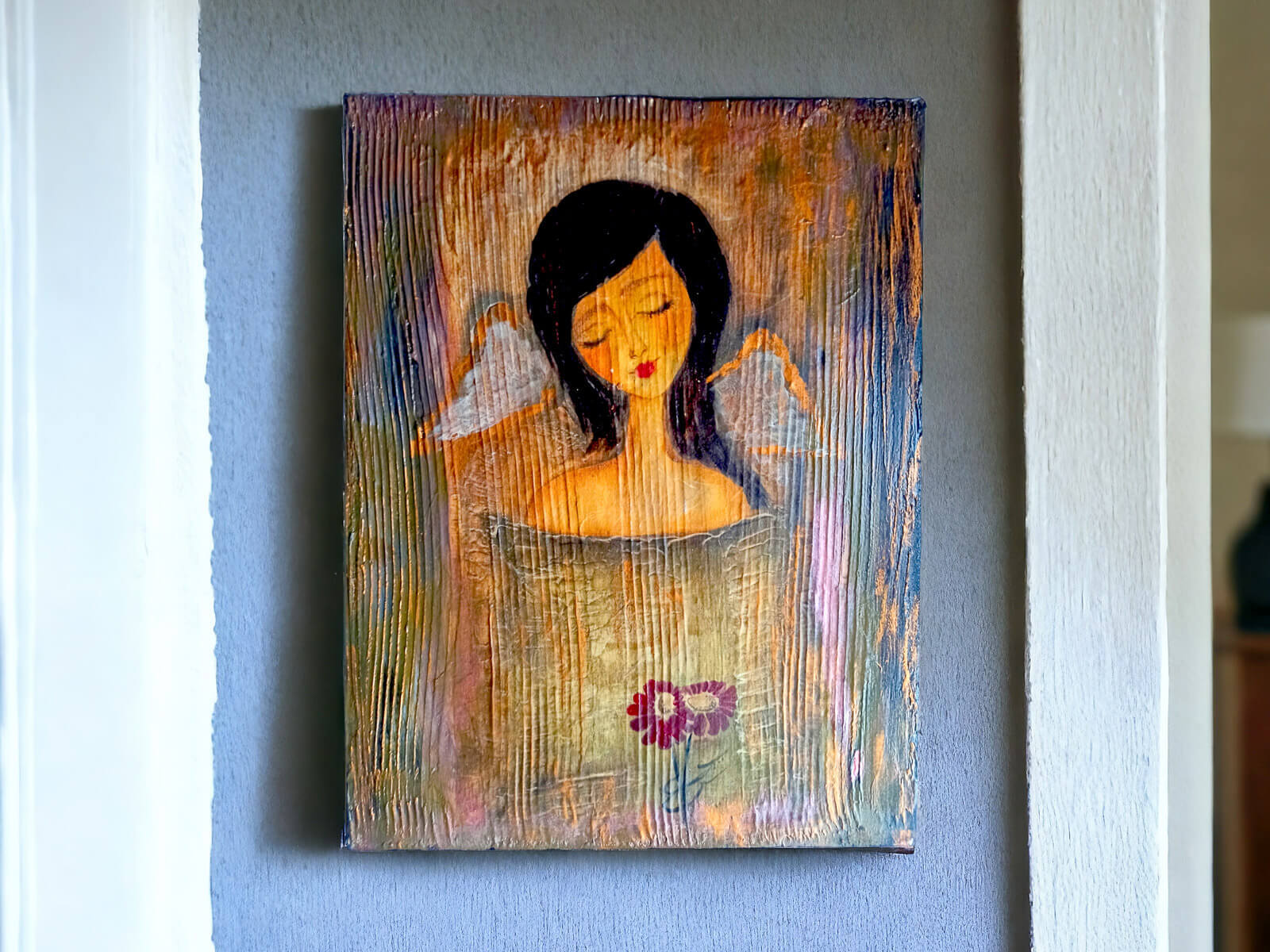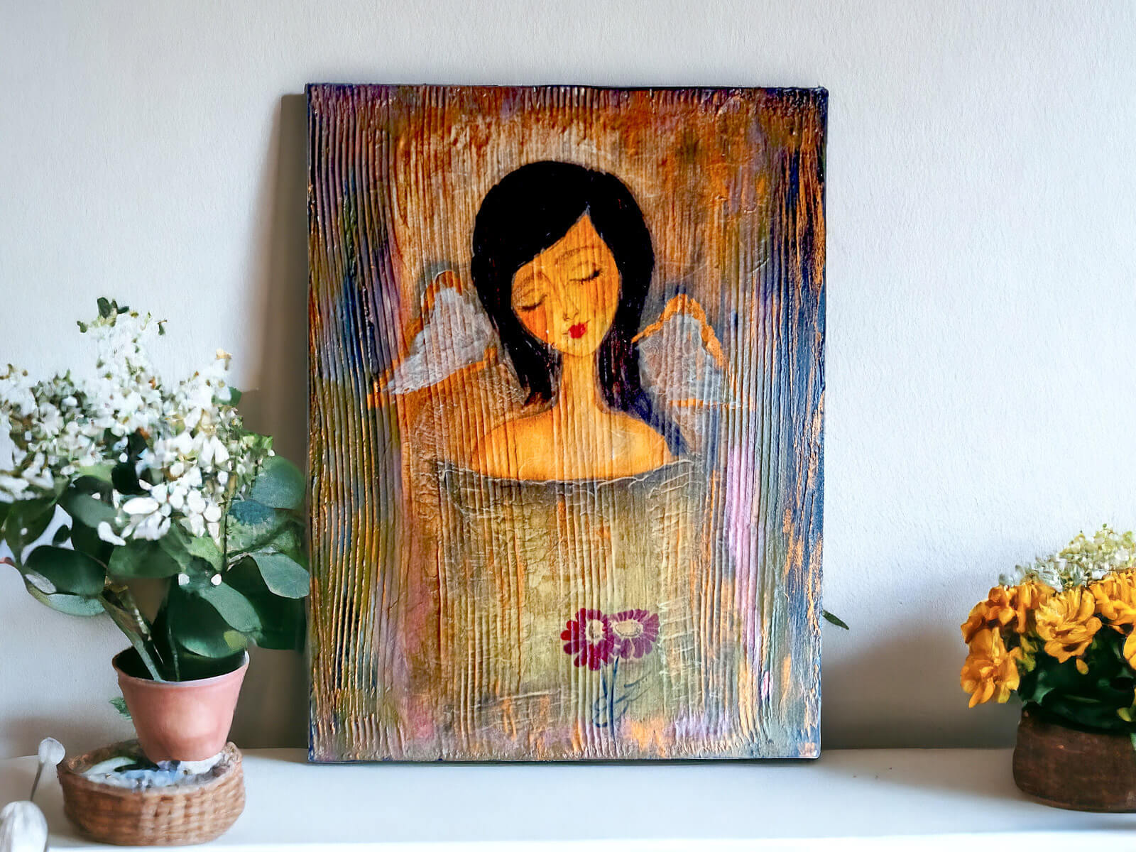 Obraz Anioła dziewczyny ze stokrotką. Obraz wykonany na desce. Idealny na prezent.