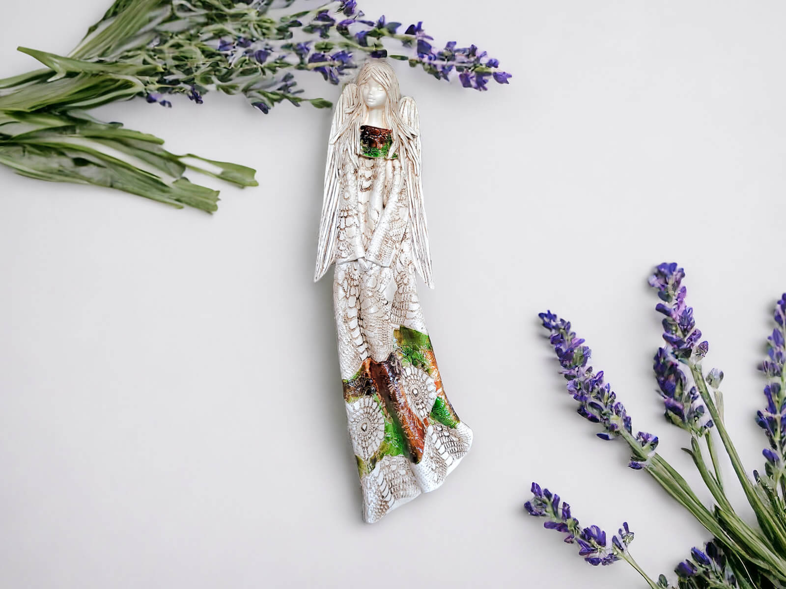Anioł Genesis ubrany jest w zwiewną, beżową suknię z haftowanymi ornamentami, co dodaje mu delikatności i elegancji. Z gracją eksponuje swoje rozłożyste skrzydła, symbolizując swoją niebiańską naturę i wolność ducha. Jego obecność nadaje się na prezent na każdą okazję, jako wyraz troski, miłości i wsparcia dla bliskich.