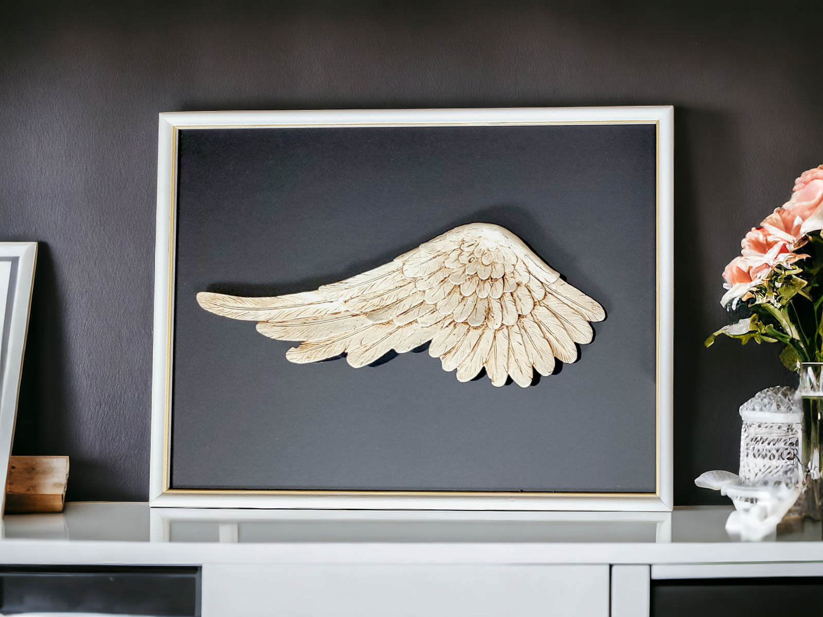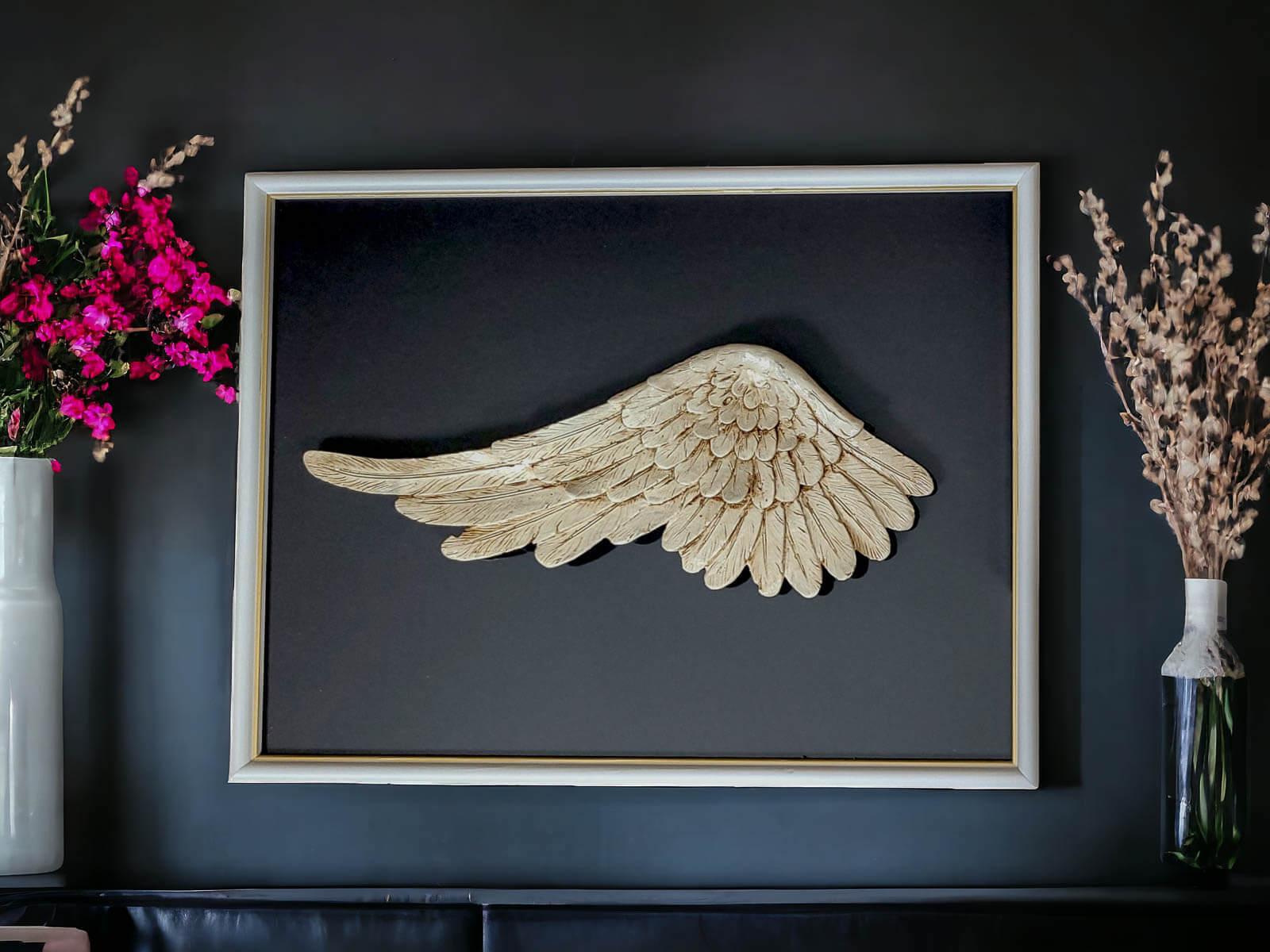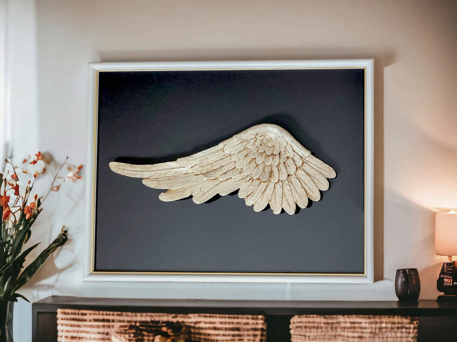 Ręcznie robione lewe skrzydło Anioła w ramce o wymiarach 30 x 40 cm z ciemnym tłem to niezwykła ozdoba, która pozwala wyrazić kreatywność i wyjątkowość w każdym pomieszczeniu. Ramkę można powiesić w różnych układach, pozostawiając to decyzji właściciela i pozwalając na dostosowanie ich do własnych upodobań.