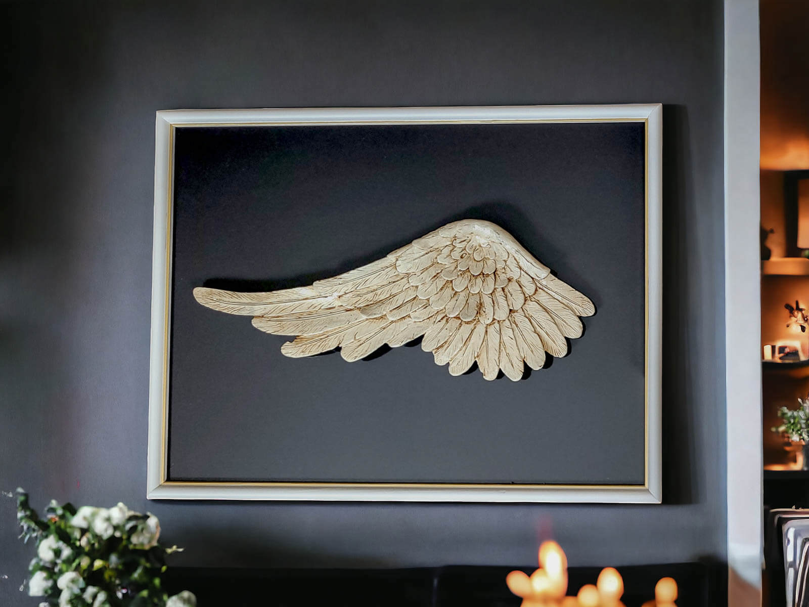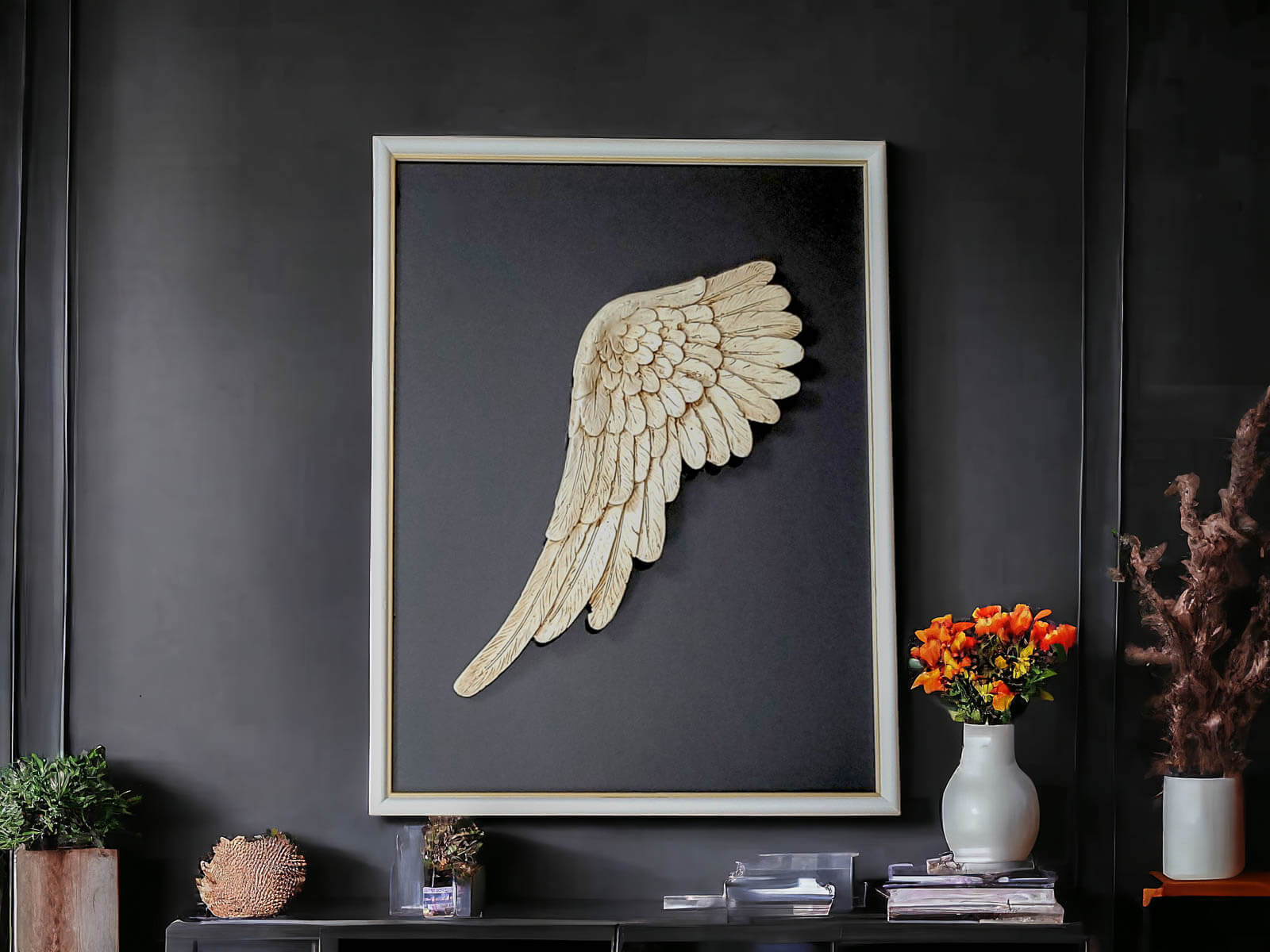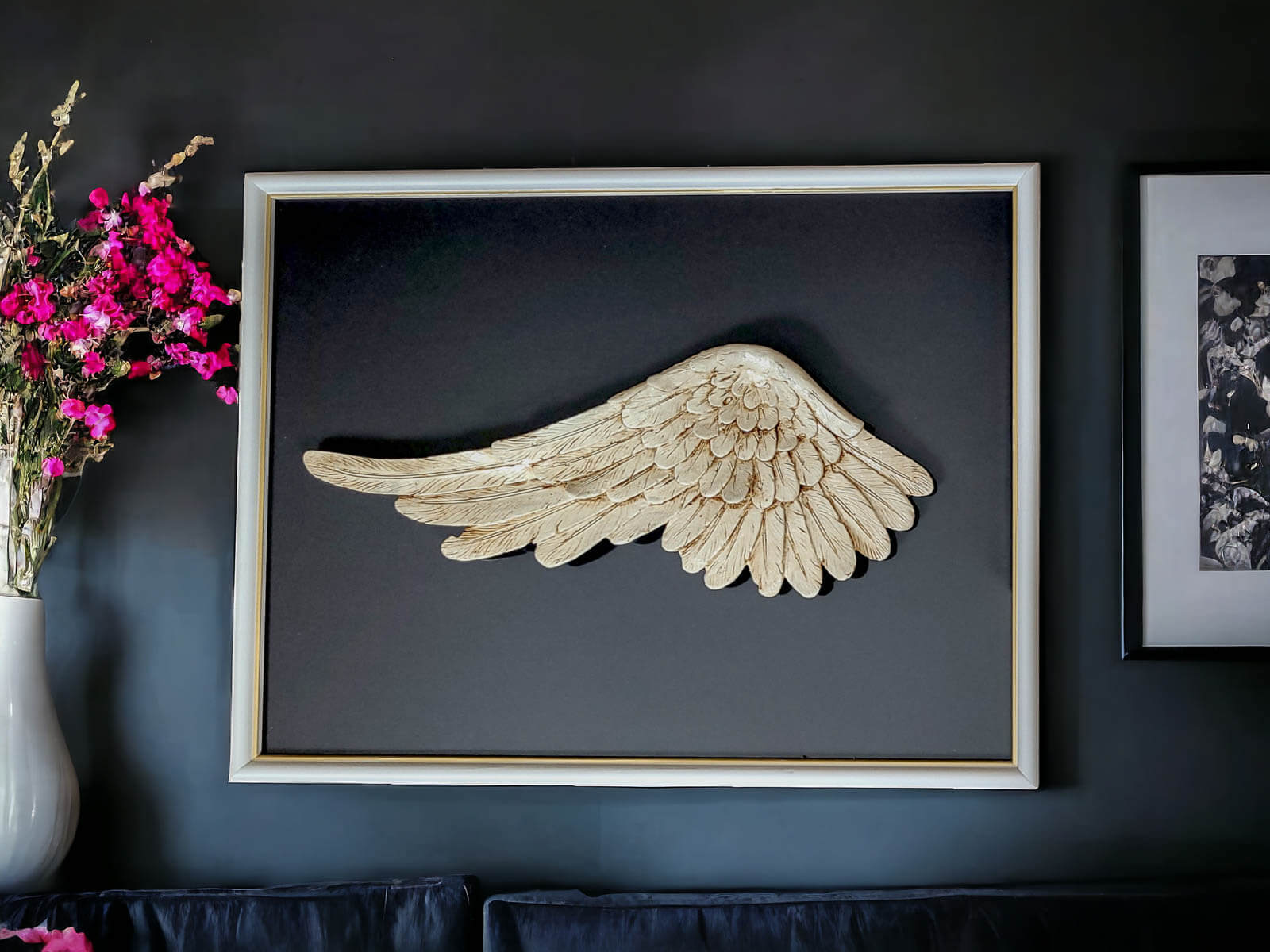 Ręcznie robione lewe skrzydło Anioła w ramce o wymiarach 30 x 40 cm z ciemnym tłem to niezwykła ozdoba, która pozwala wyrazić kreatywność i wyjątkowość w każdym pomieszczeniu. Ramkę można powiesić w różnych układach, pozostawiając to decyzji właściciela i pozwalając na dostosowanie ich do własnych upodobań.