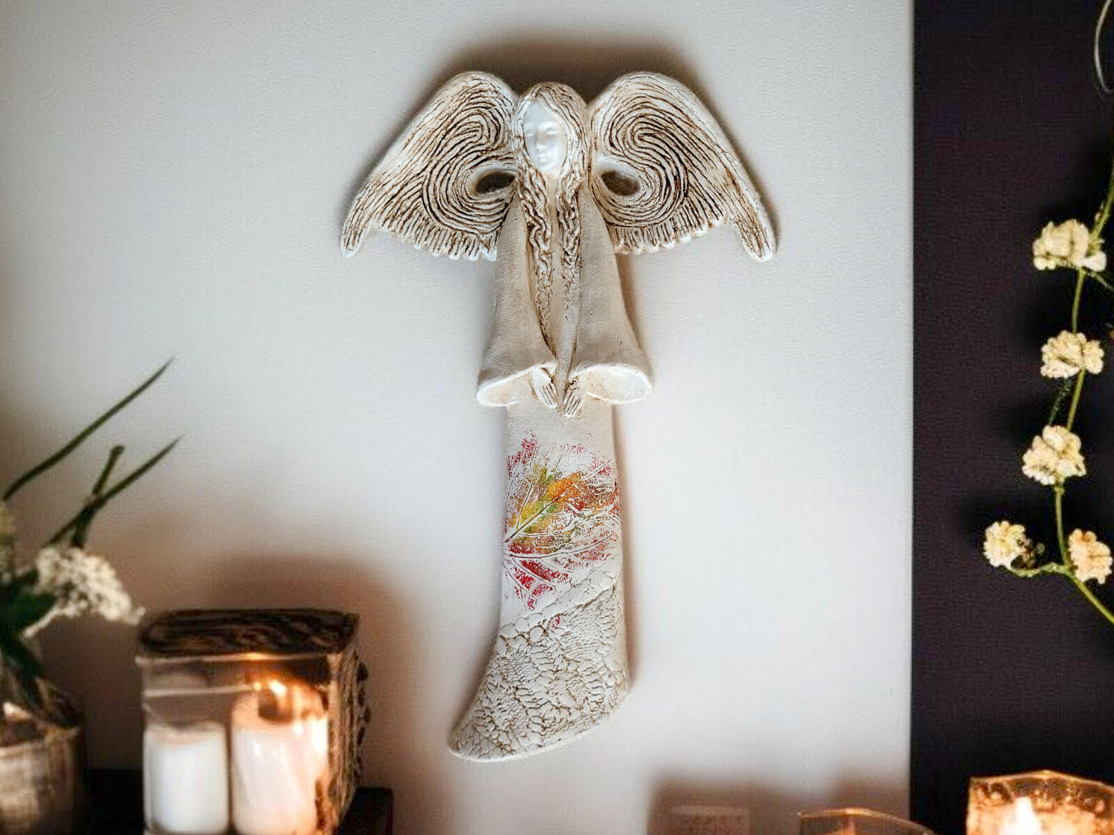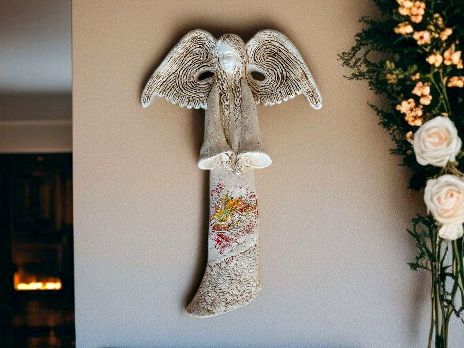 Anioł Clara w limitowanej kolekcji Art z liśćmi to gipsowa dekoracja wykonana ręcznie. Jest nim kobieta w długiej, beżowej sukni. Ma długie, kręcone włosy oraz duże, rozłożone skrzydła z ciekawymi wycięciami na środku. Ręce są skierowane na przód sylwetki, a głowa pochylona w dół. Anioł jest figurką wiszącą, dzięki czemu można zawiesić go na ścianie w widocznym miejscu. Można go również podarować na prezent dla dziadków, rodziców lub kogoś bliskiego kto lubi piękne dekoracje.