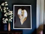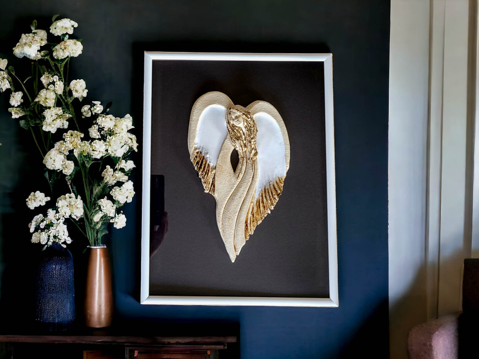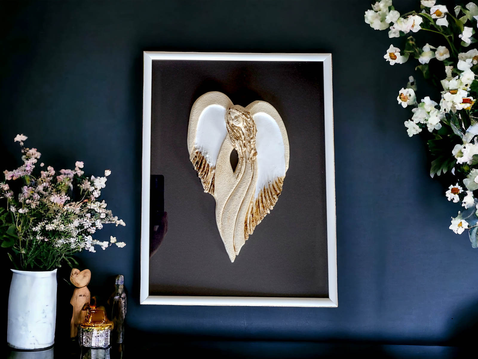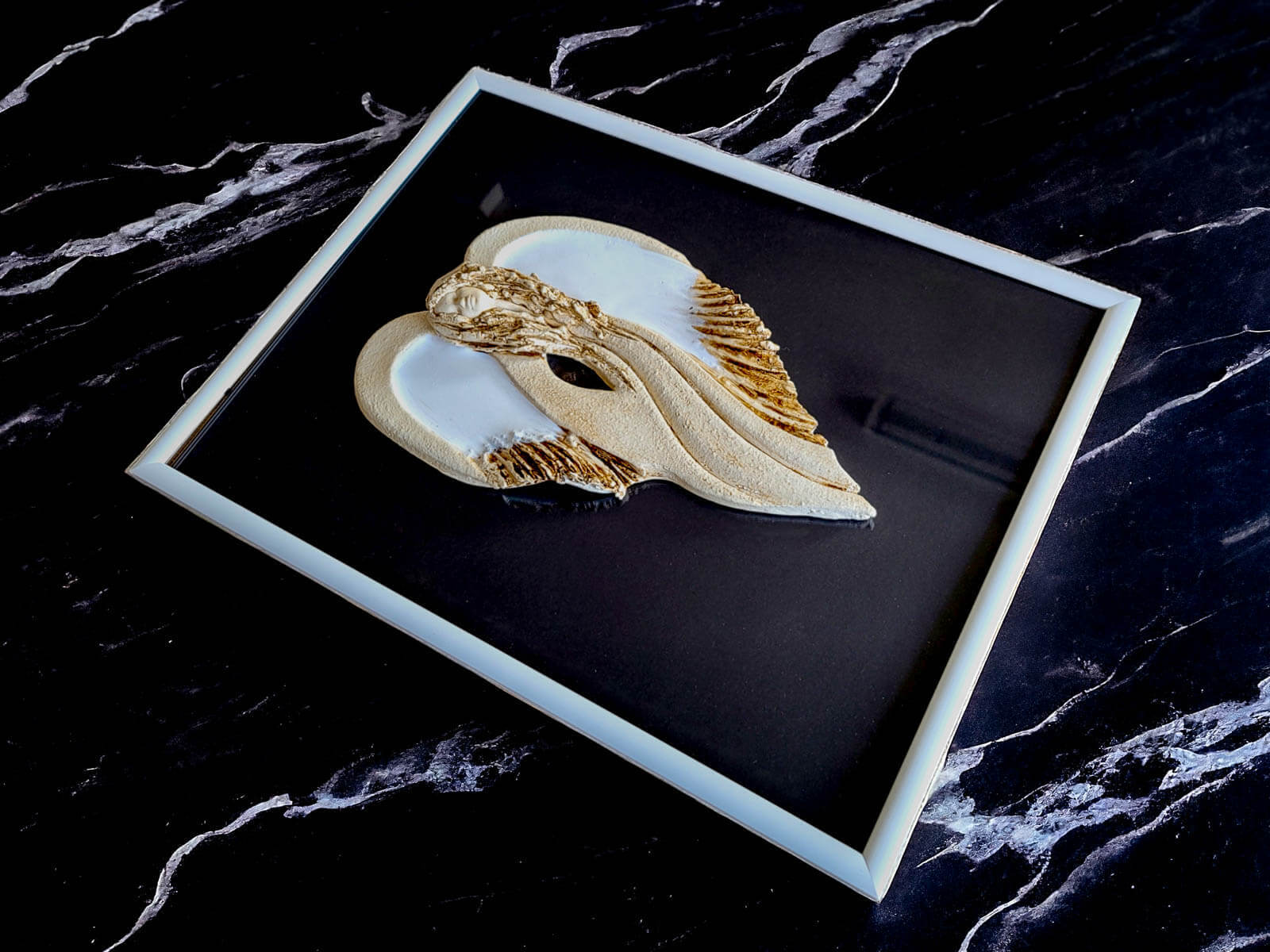 Figurka Anioła Cynthia biała przyklejona do szyby eleganckiej drewnianej ramki z czarnym tłem. Jest to delikatna i elegancka ozdoba, idealna na różne okazje, od urodzin po ślub czy rocznicę ślubu.