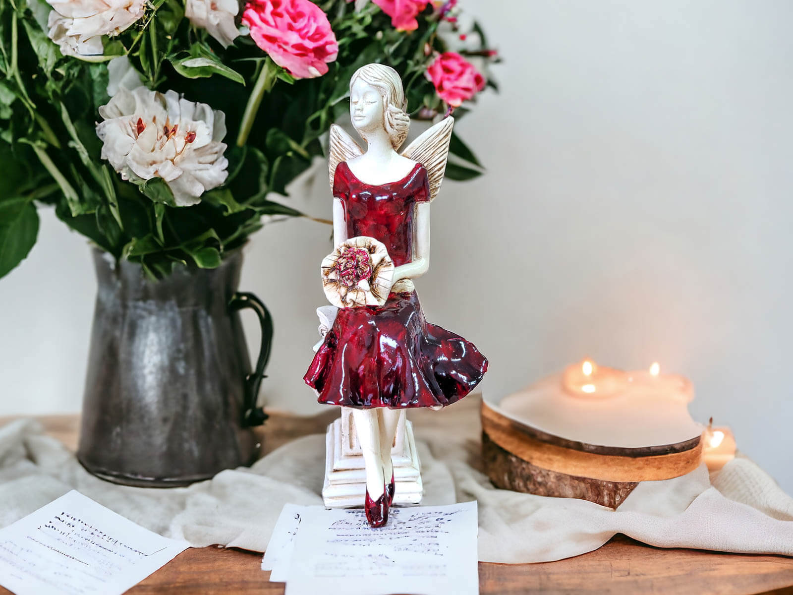 Figurka Anioła Pauline to wyjątkowa ozdoba, która swoim wyglądem i przesłaniem przynosi do wnętrza harmonię, ciepło oraz inspirację. Pauline, ubrana w elegancką, burgundową suknię, z wdziękiem wyciąga ramiona ku słońcu, jakby łapała jego promienie, przynosząc blask i pozytywną energię do Twojego domu. Jej postawa wyraża poczucie spokoju, siły oraz wewnętrznej równowagi, a jej ręcznie wykonane detale czynią ją prawdziwym arcydziełem rzemieślniczym.