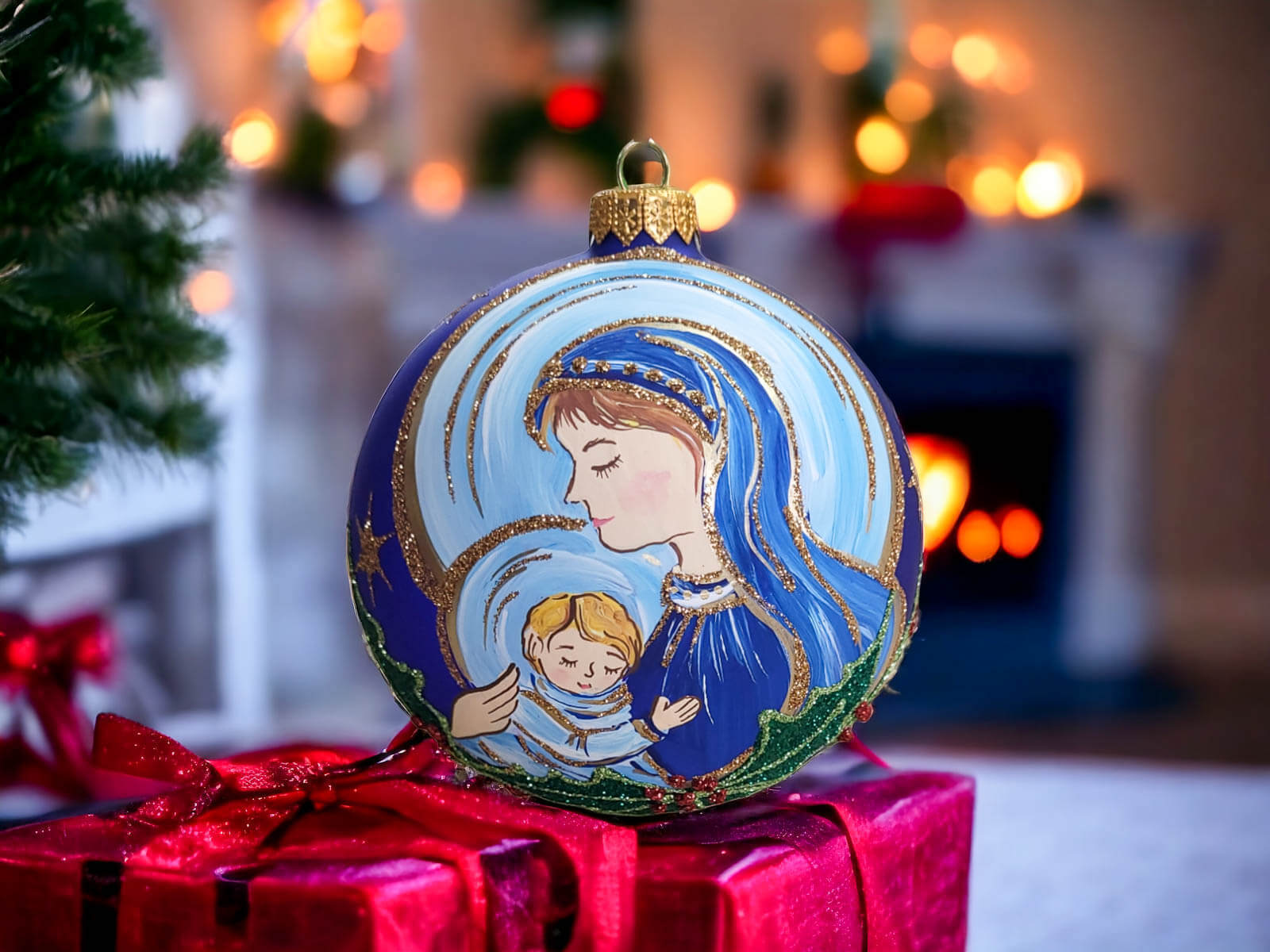 Szklana bombka, która staje się nie tylko ozdobą choinki, ale również pięknym symbolem Świąt Bożego Narodzenia. Ta ręcznie malowana ozdoba wznosi się ponad zwykłe dekoracje, przedstawiając scenę Św. Maryi i malutkiego Jezuska.