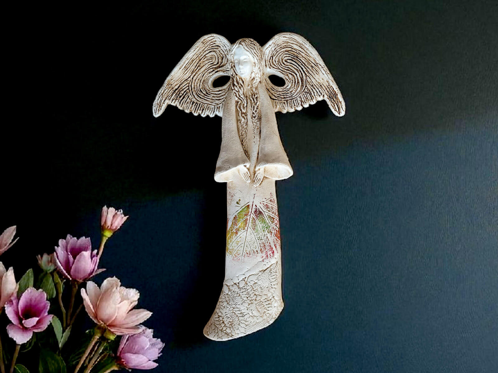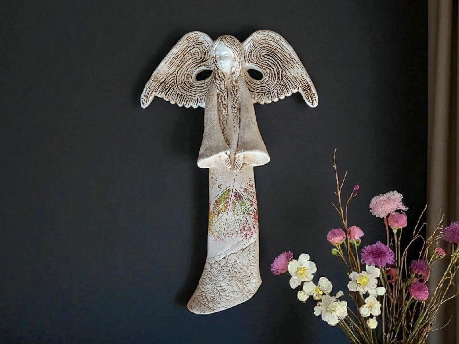 Anioł Clara w limitowanej kolekcji Art z liśćmi to gipsowa dekoracja wykonana ręcznie. Jest nim kobieta w długiej, beżowej sukni. Ma długie, kręcone włosy oraz duże, rozłożone skrzydła z ciekawymi wycięciami na środku. Ręce są skierowane na przód sylwetki, a głowa pochylona w dół. Anioł jest figurką wiszącą, dzięki czemu można zawiesić go na ścianie w widocznym miejscu. Można go również podarować na prezent dla dziadków, rodziców lub kogoś bliskiego kto lubi piękne dekoracje.