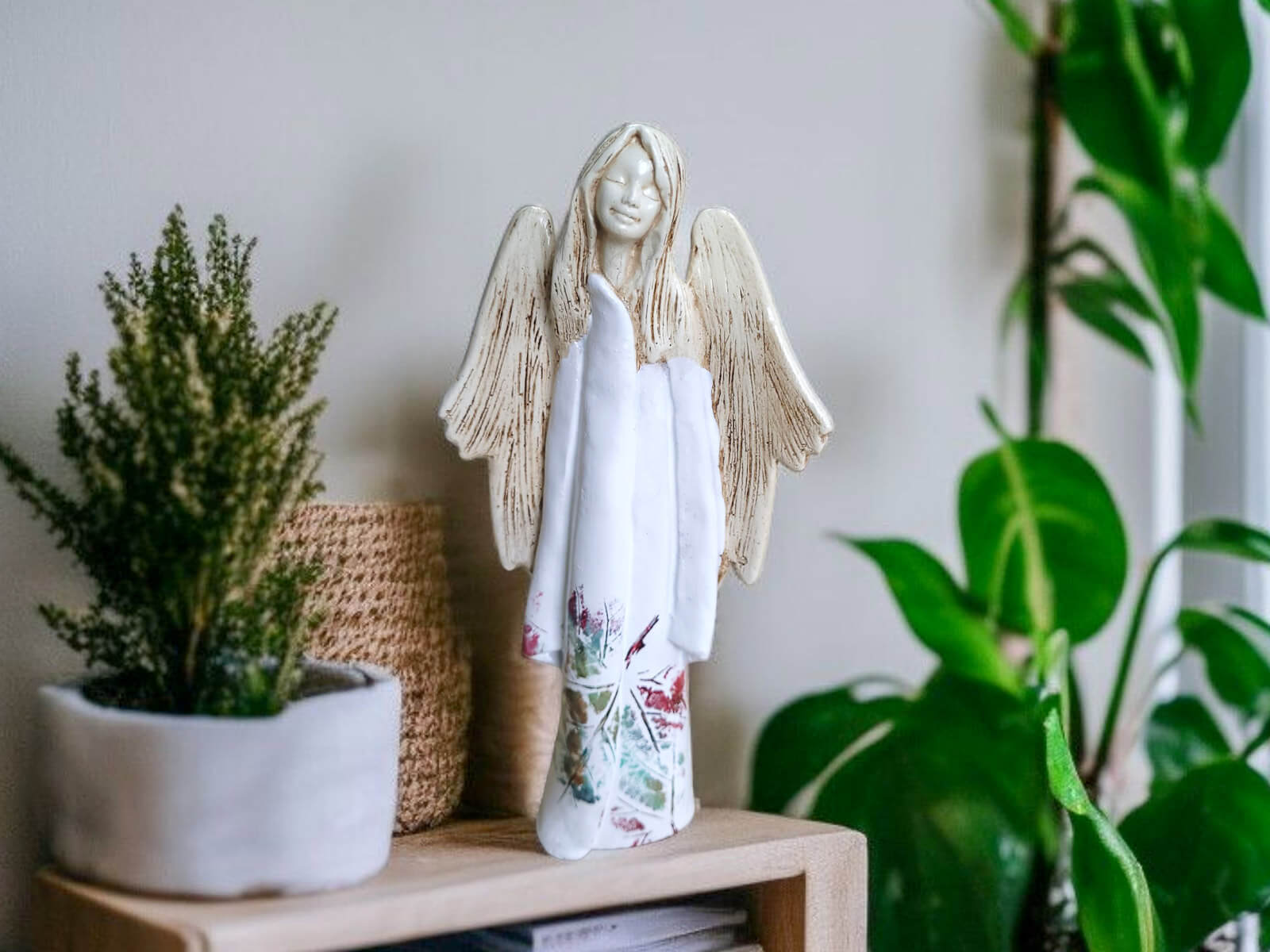 Jeśli anioł ma zostać wręczony jako prezent możemy go również elegancko zapakować w przeźroczysty celofan wiązany ekologicznym sznurkiem. Dzięki temu anioł będzie wyglądał jeszcze bardziej dostojnie i będzie gotowy do wręczenia. Dla wygody możesz również od razu zakupić papierową białą torbę prezentową.