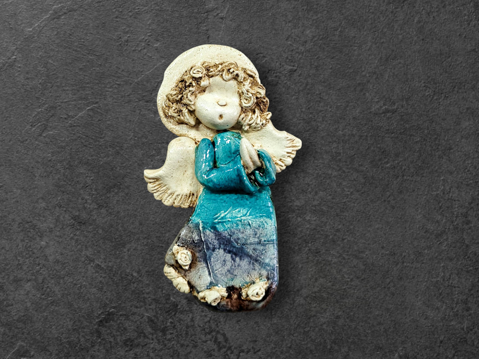 Ręcznie robiony aniołek Marzyciel w unikatowej wersji Art Leaf z liściem. Lilionek jest młodym chłopcem, który żyje marzeniami. Zawsze jest w błogim nastroju oraz cieszy się z życia. Zawsze jest zamyślony i patrzy przez różowe okulary. Jest ubrany w turkusową szatę. Kolor turkusowy jest symbolem szczęścia i powodzenia. Figurka idealnie nadaje się na prezent dla dziecka. Aniołek postawiony w każdym miejscu w domu będzie czuwał nad domownikami.
