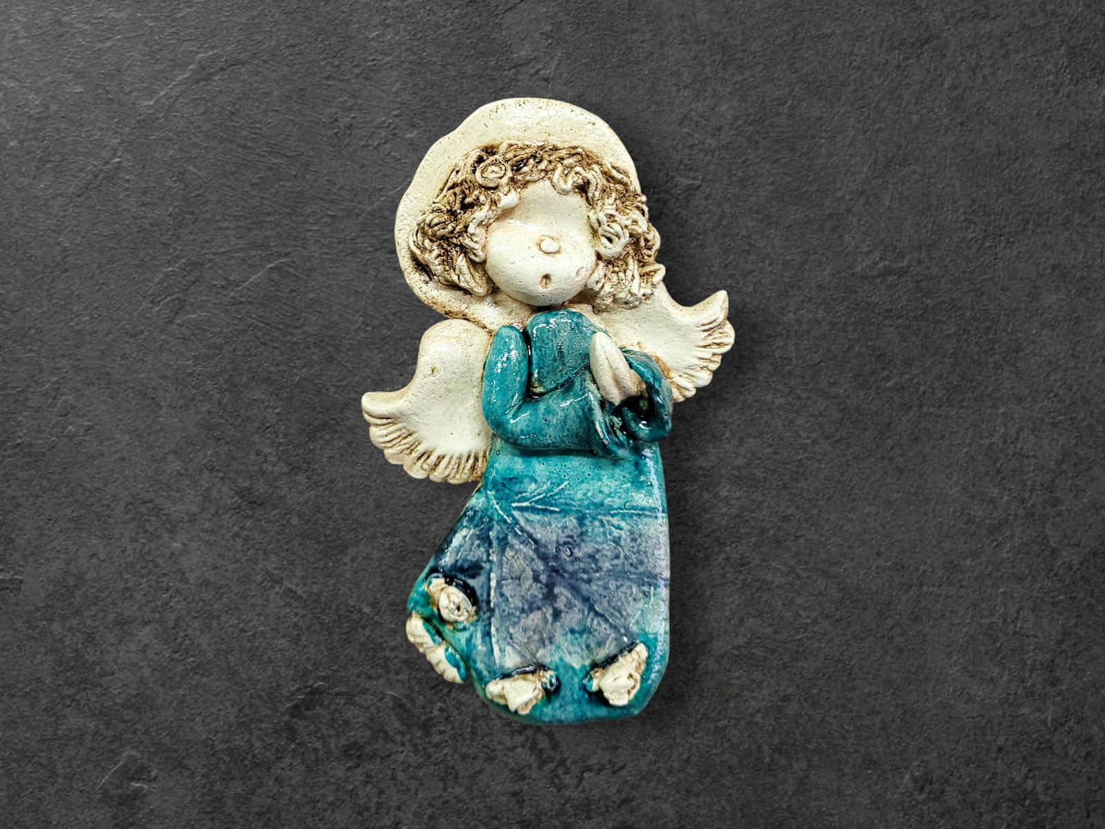 Ręcznie robiony aniołek Marzyciel w unikatowej wersji Art Leaf z liściem. Lilionek jest młodym chłopcem, który żyje marzeniami. Zawsze jest w błogim nastroju oraz cieszy się z życia. Zawsze jest zamyślony i patrzy przez różowe okulary. Jest ubrany w turkusową szatę. Kolor turkusowy jest symbolem szczęścia i powodzenia. Figurka idealnie nadaje się na prezent dla dziecka. Aniołek postawiony w każdym miejscu w domu będzie czuwał nad domownikami.