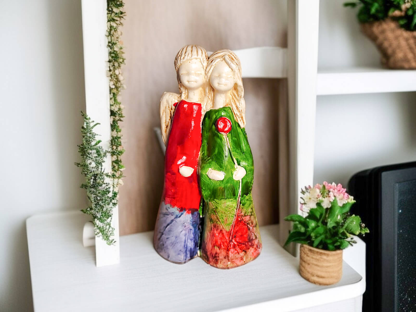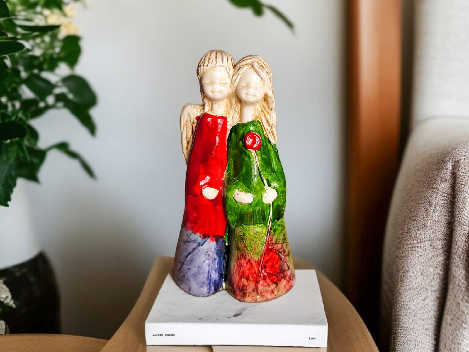 Ręcznie robiona figurka aniołów Apple & Ella, będącą częścią unikalnej kolekcji Art Laef. Ta piękna figurka, utrzymana w barwach zieleni i pomarańczy, wyróżnia się niezwykłym detalem – prawdziwymi liśćmi wkomponowanymi w jej projekt, co nadaje jej naturalnego i wyjątkowego uroku.