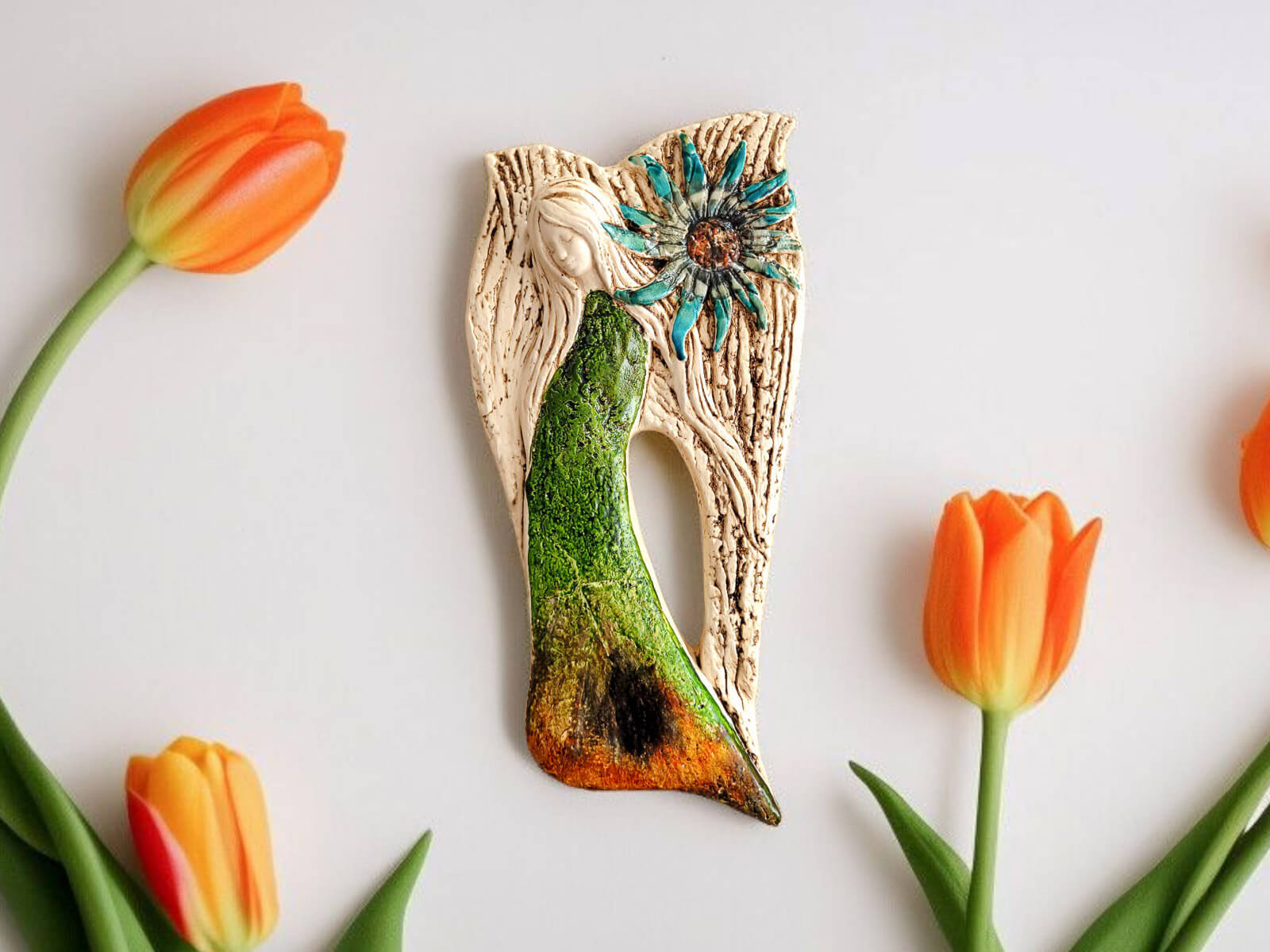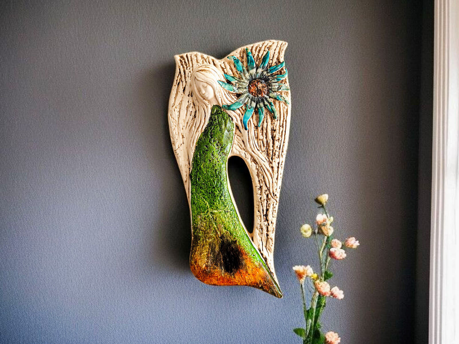 Anioł Xenylla pochodzi z kolekcji Art, charakteryzującej się dodatkiem prawdziwego liścia, co nadaje każdej figurce autentyczny i naturalny wygląd. Figurka została zaprojektowana z myślą o zawieszeniu, posiada praktyczną dziurkę z tyłu, co umożliwia jej eleganckie powieszenie na ścianie w dowolnym pomieszczeniu, takim jak salon, sypialnia czy korytarz.