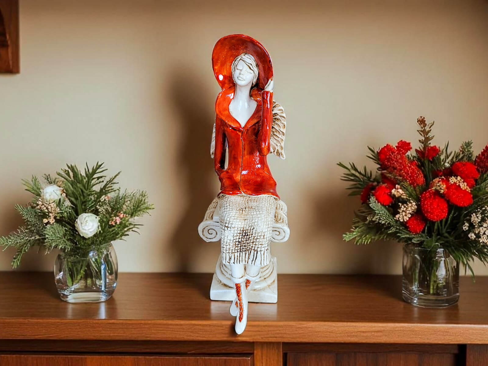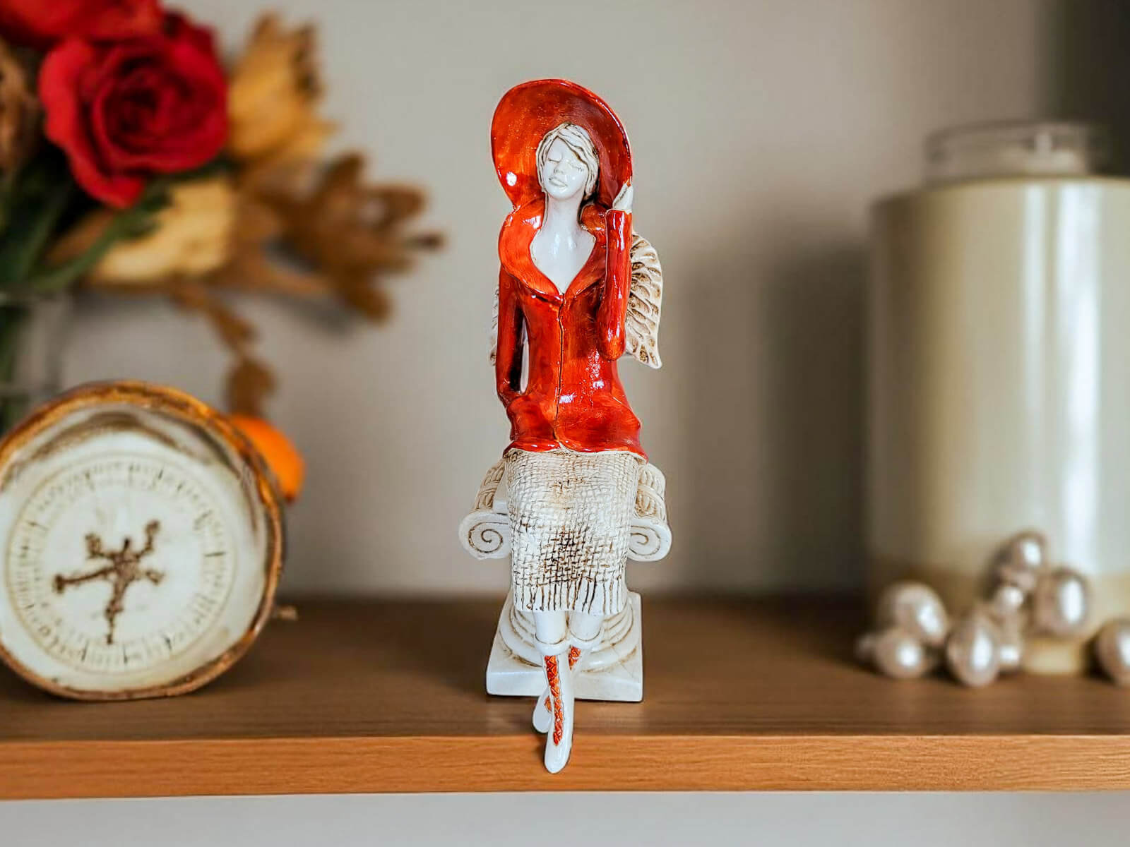 Aniołek Megan to urocza figurka przedstawiająca siedzącą kobietę, której elegancki strój i delikatne detale zachwycają precyzją wykonania. Megan ubrana jest w pomarańczowy żakiet i pasujący kapelusz, a także beżową spódnicę z motywem sweterkowym. Jej krótkie, jasne włosy oraz małe skrzydła skierowane w dół dodają jej subtelnego uroku. Lewą ręką przytrzymuje kapelusz, a prawą trzyma w pasie, co nadaje figurce naturalności i gracji.
