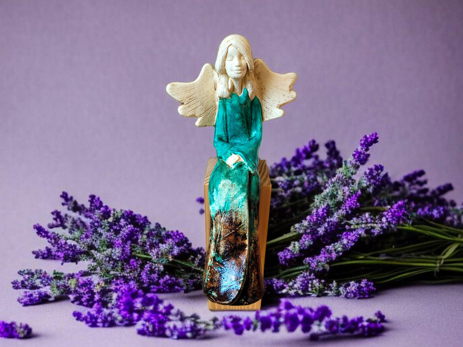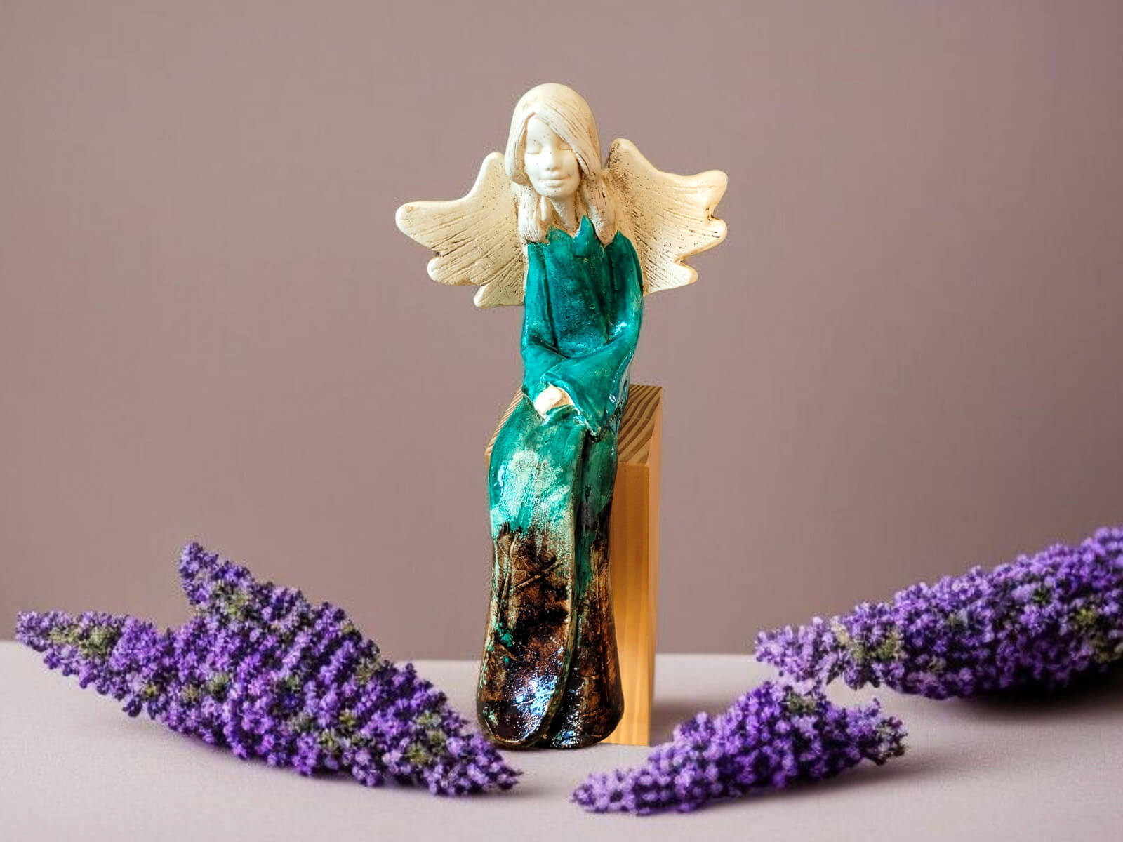 Anioł Agnes to ręcznie wykonana figurka. Agnes jest wytworną damą, która wybrała się na odpoczynek w letnie popołudnie. Siedzi na pieńku w parku i wsłuchuje się w odgłosy ptaków. Zachwyca się urokami ciepłego krajobrazu. Jest ubrana w długi turkusowo brązowy płaszcz z wzorami liści. Ma piękne rozłożyste skrzydła. Nada blasku i energii w twoim wnętrzu. Idealnie nadaje się na prezent dla kobiet. Może być nie lada gratką dla kolekcjonerów aniołków.
