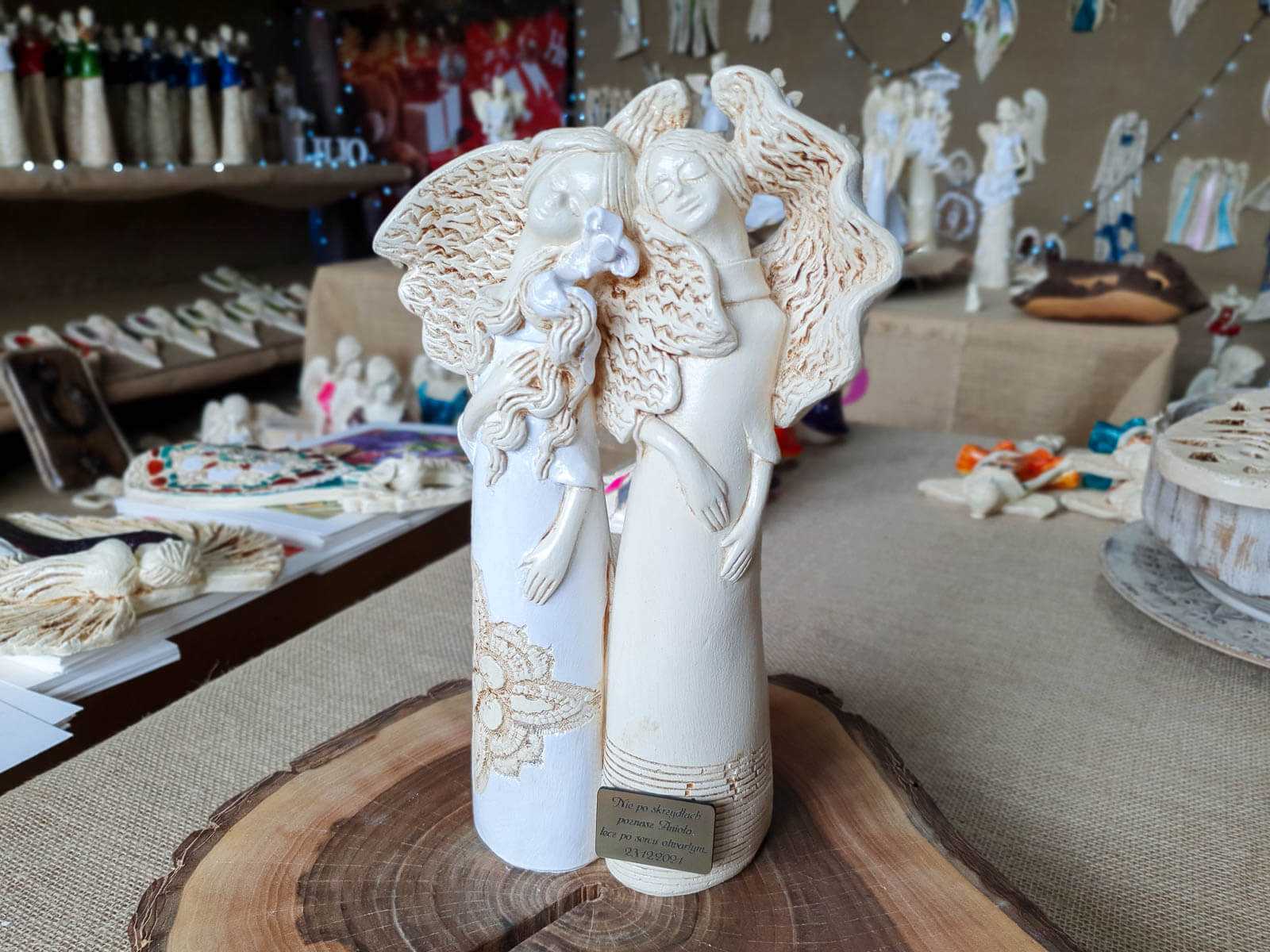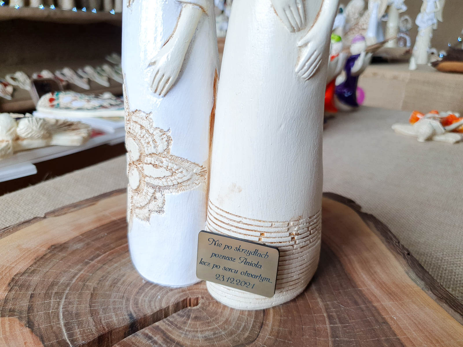 Anioły Nora & Ellie są wykonane własnoręcznie z gipsu z rodzaju ozdób stojących. Jest to para aniołów opierających się nawzajem do siebie plecami. Takie ułożenie aniołów może świadczyć o swojej wzajemnej miłości i bliskości. Obydwa mają takie same skrzydła skierowane ku górze. Jeden anioł ma białą sukienkę z ozdobnym beżowym kwiatem na dole. Posiada długie jasne włosy, w których znajduje się kwiatek, a także prawą dłoń na piersi. Drugi anioł ma beżową sukienkę z paskami na dole i krótkie jasne włosy. Dłonie są położone na sylwetce. Taka figurka pasuje na prezent dla mamy, babci lub przyjaciółki.