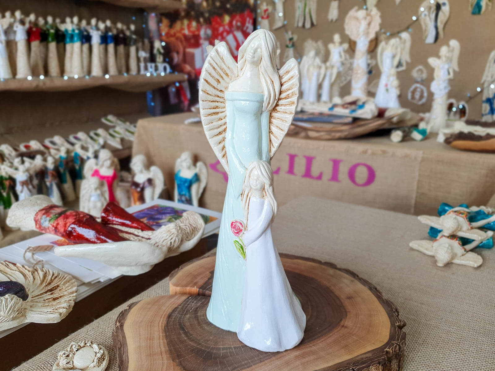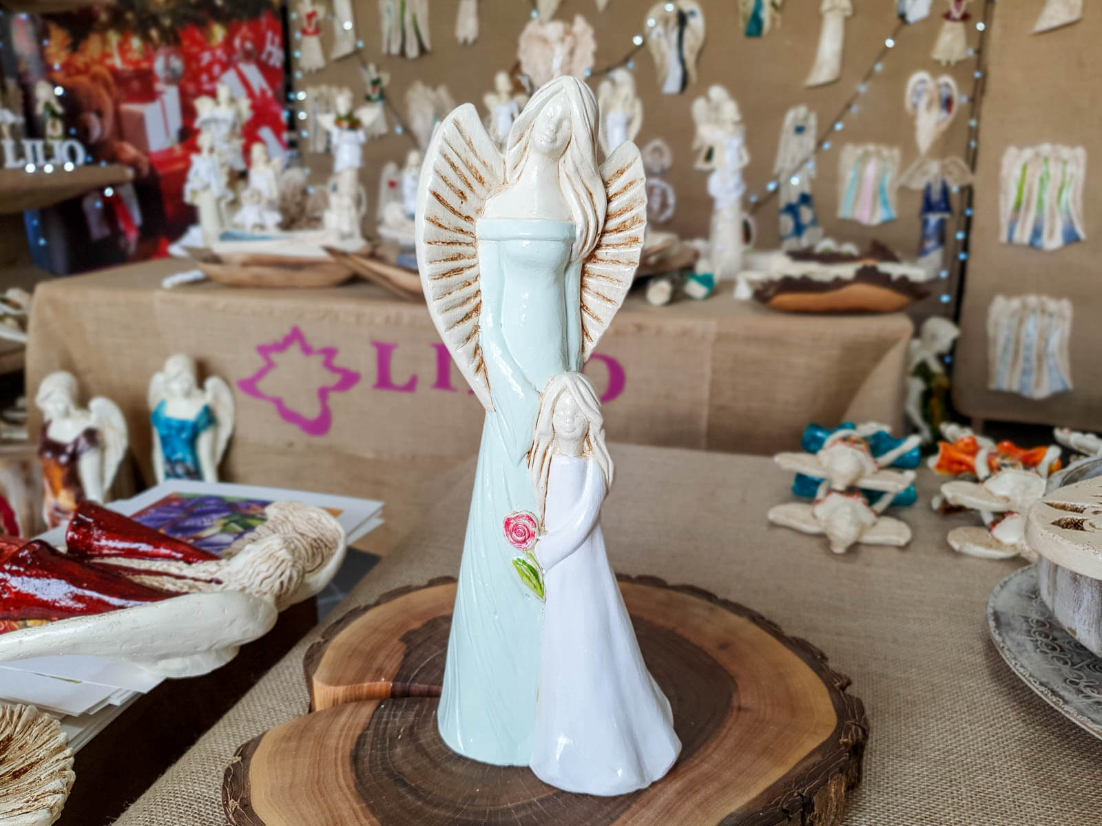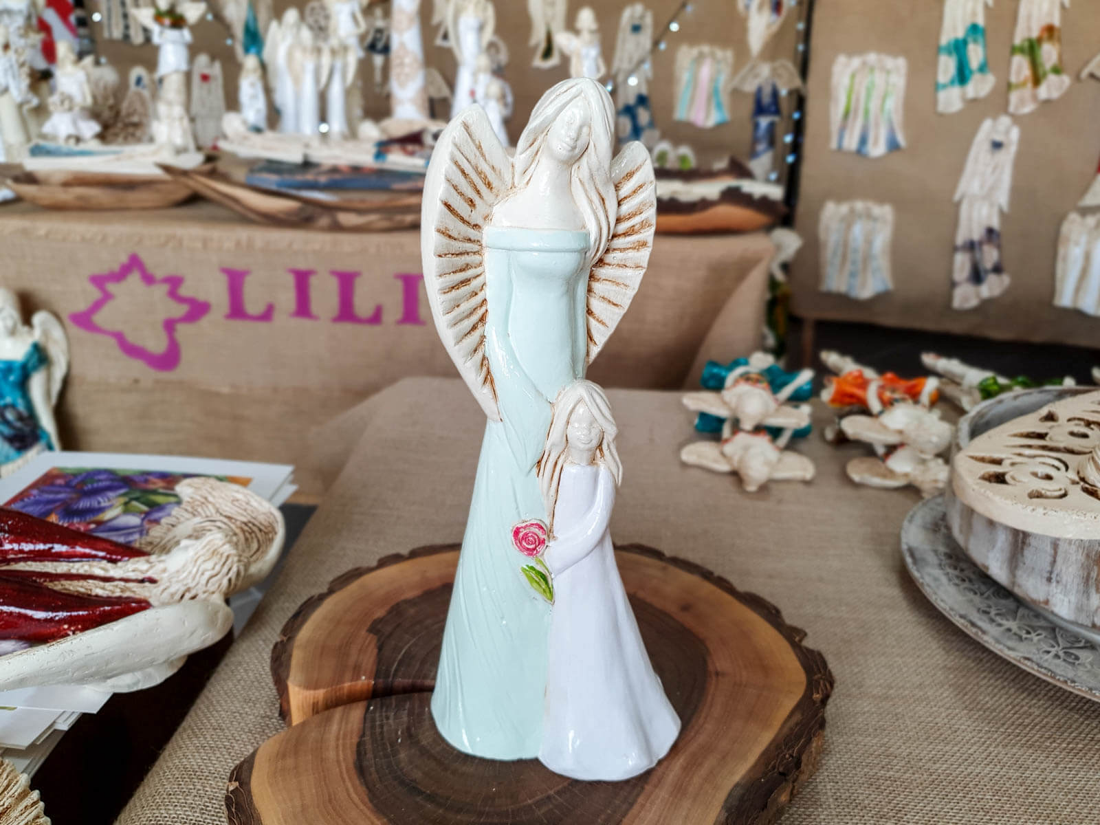 Figurka wykonana jest ręcznie z gipsu i przedstawia postać kobiety o spokojnym wyrazie twarzy trzymającej w objęciach dziewczynkę. Anioły mają piękne kolory - całość utrzymana jest w delikatnych tonacjach bieli, błękitu i beżu. Cechą wyróżniającą tę figurkę od innych jest trzymany przez dziecko kwiat róży - przepiękny akcent w subtelnym odcieniu różu. Idealny prezent na pamiątkę pierwszej komunii świętej.