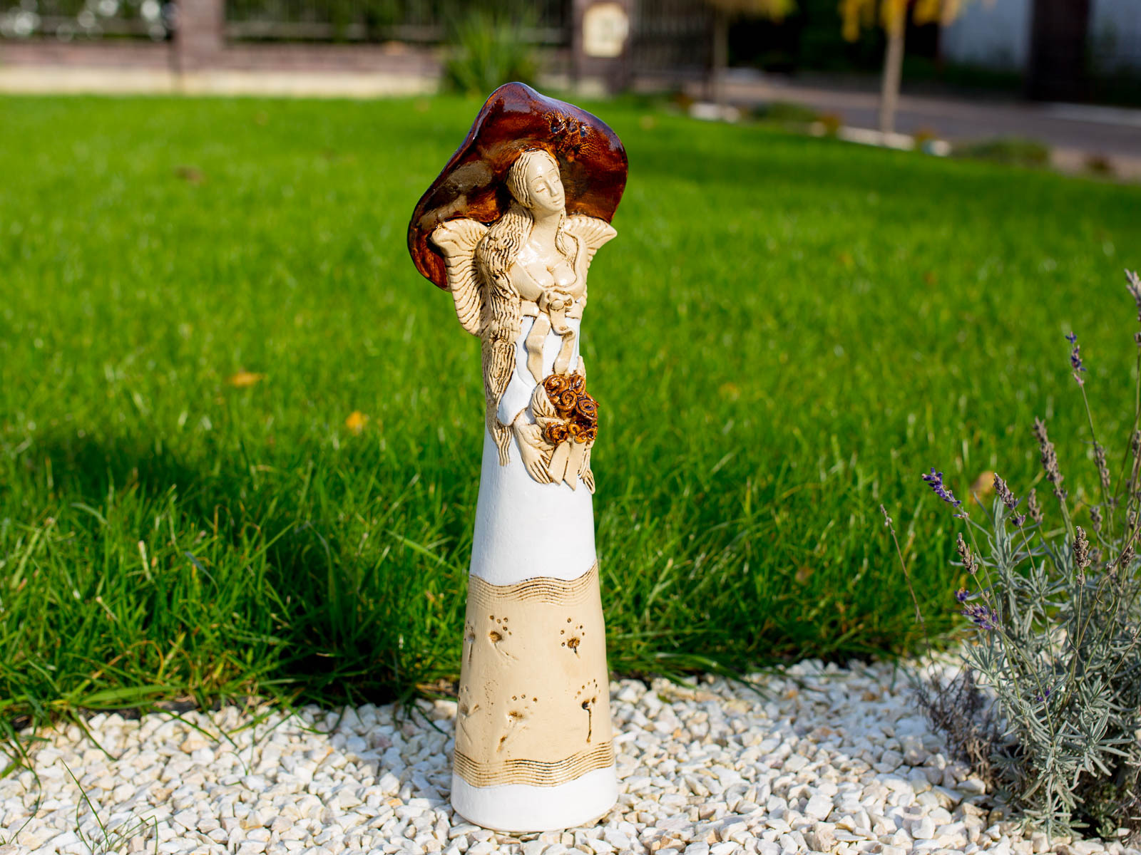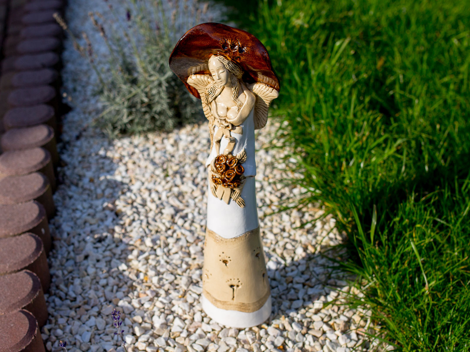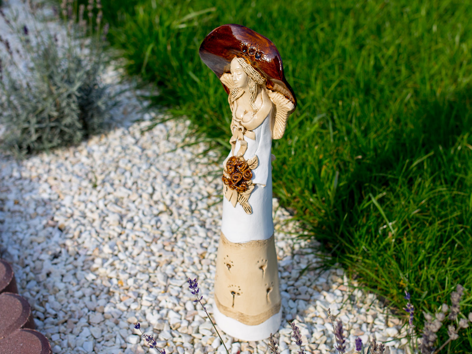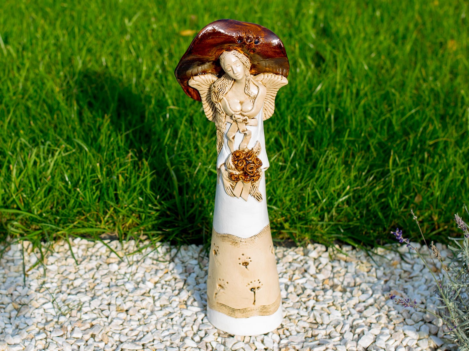 Anioł Mabel ma postać kobiety w ogromnym kapeluszu, która trzyma w dłoniach kosz kwiatów. Pięknie dobrana gama barw czyni ją wyjątkową na tle innych figurek. Może stanowić niezwykły akcent wystroju ogrodu lub wnętrza, w zależności od osobistych preferencji posiadacza. Świetnie sprawdza się również jako prezent ślubny, walentynkowy bądź na dzień matki.