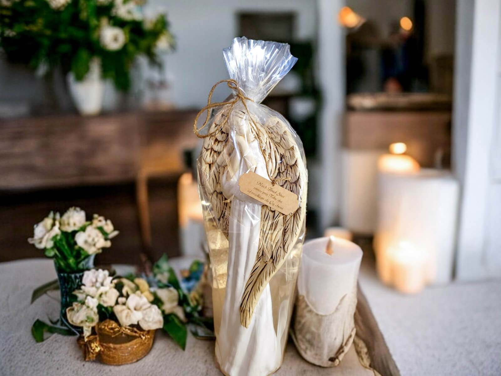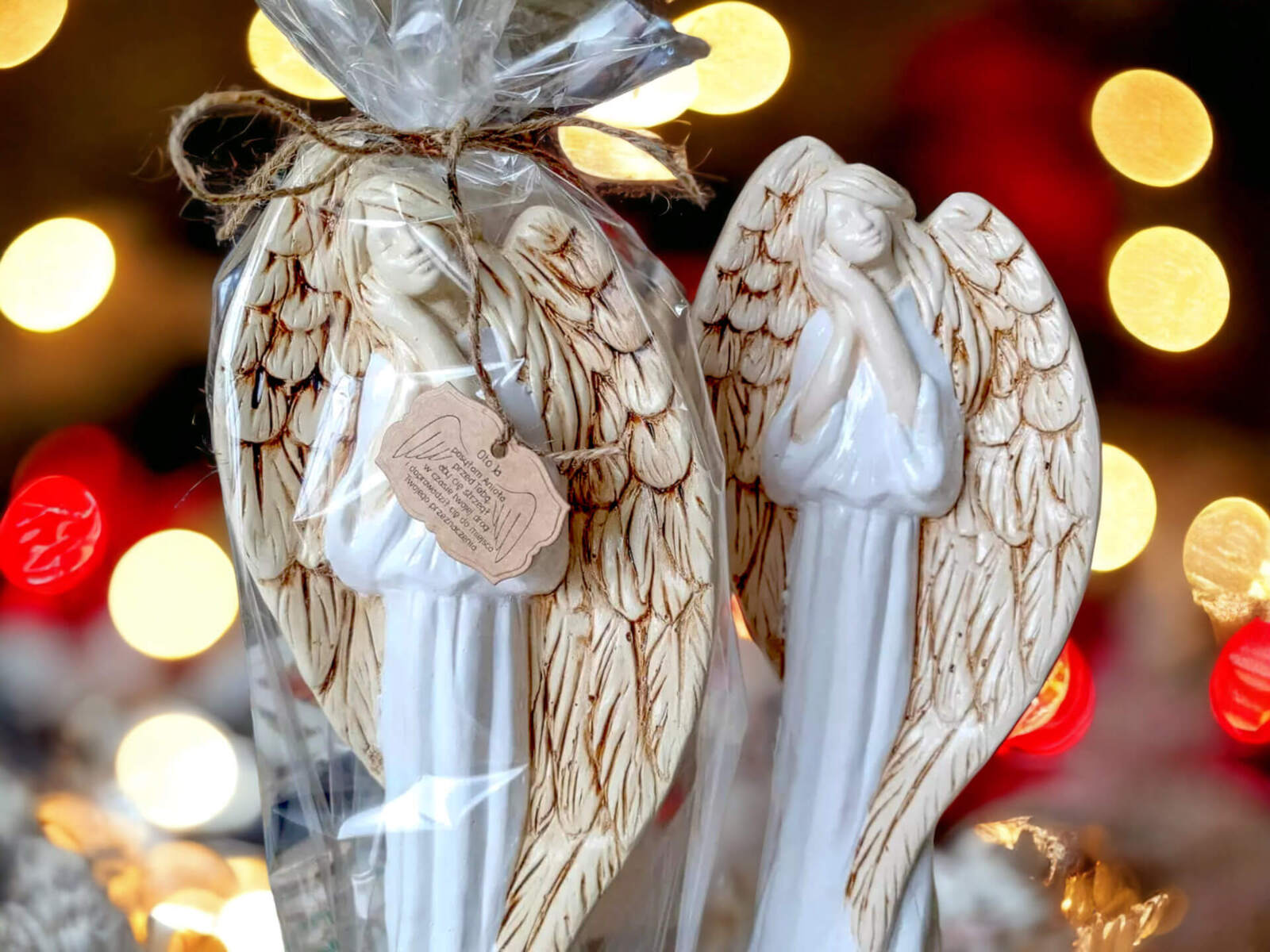 Jeśli anioł ma zostać wręczony jako prezent możemy go również elegancko zapakować w przeźroczysty celofan wiązany ekologicznym sznurkiem. Dzięki temu anioł będzie wyglądał jeszcze bardziej dostojnie i będzie gotowy do wręczenia. Dla wygody możesz również od razu zakupić papierową białą torbę prezentową.