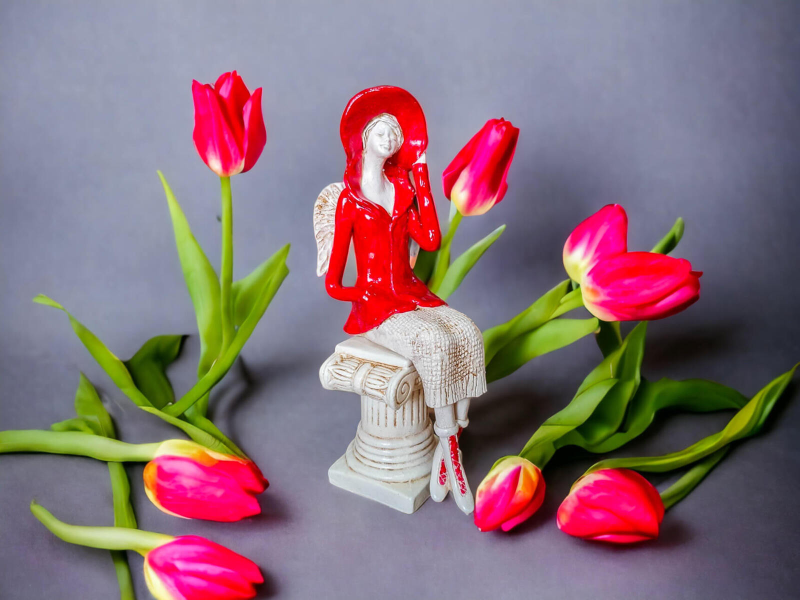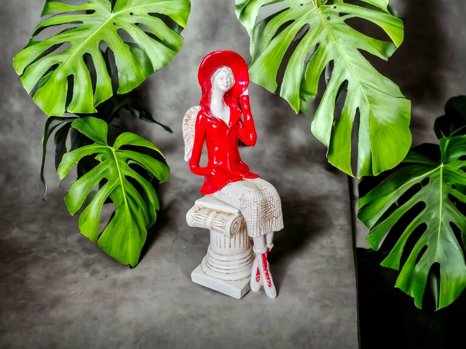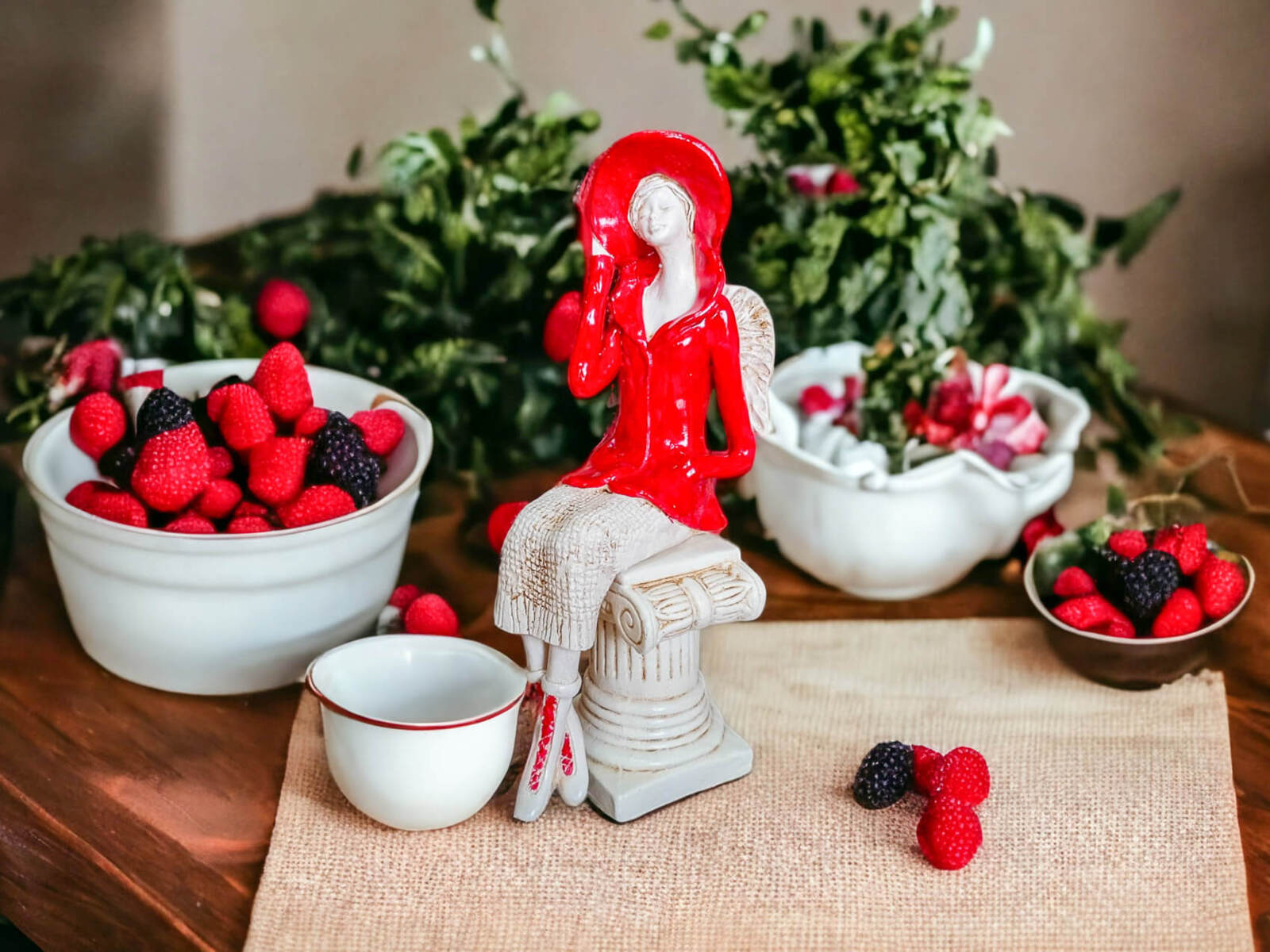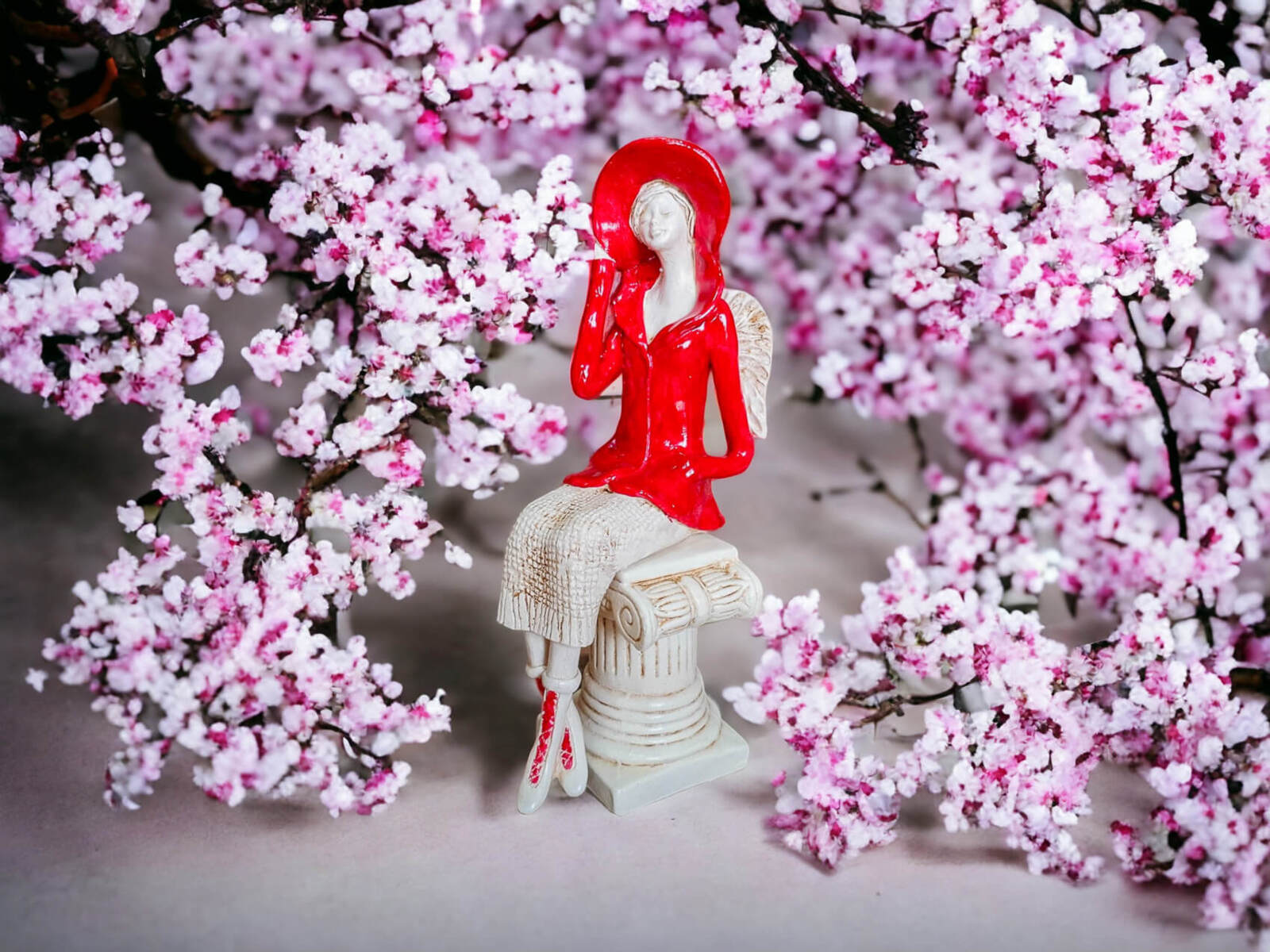 Aniołek Megan to urocza figurka przedstawiająca siedzącą kobietę, która zachwyca elegancją i dbałością o detale. Megan ubrana jest w czerwony żakiet i pasujący kapelusz, a także beżową spódnicę z delikatnym, sweterkowym motywem. Jej krótkie, jasne włosy oraz małe skrzydła dodają jej subtelnego uroku. Lewą rękę trzyma na rogu kapelusza, a prawą w kieszeni żakietu, co nadaje figurce naturalności i swobody.