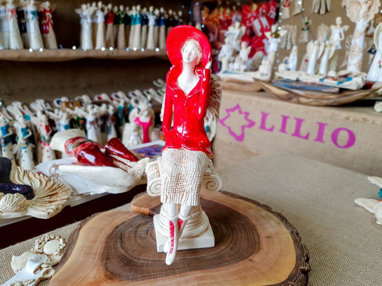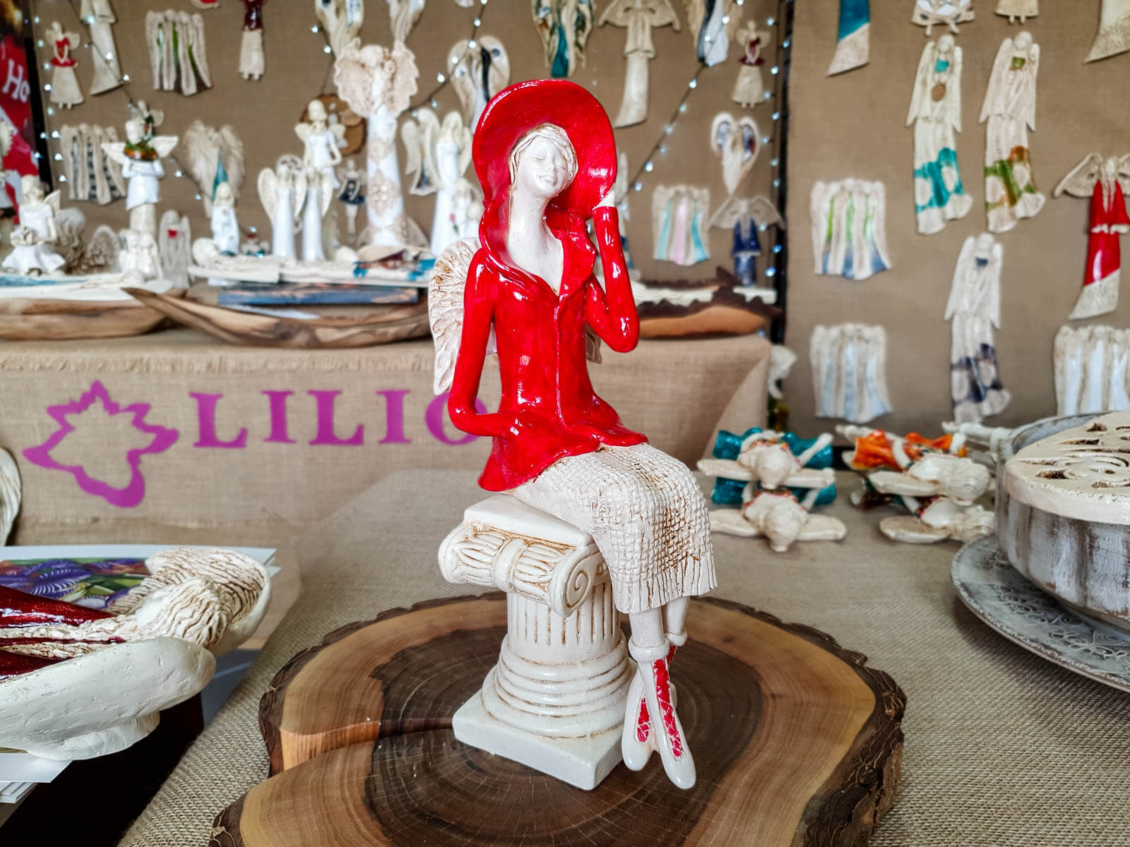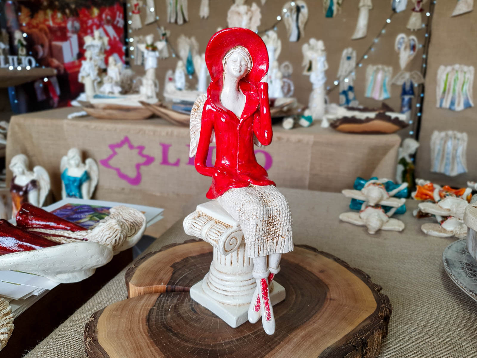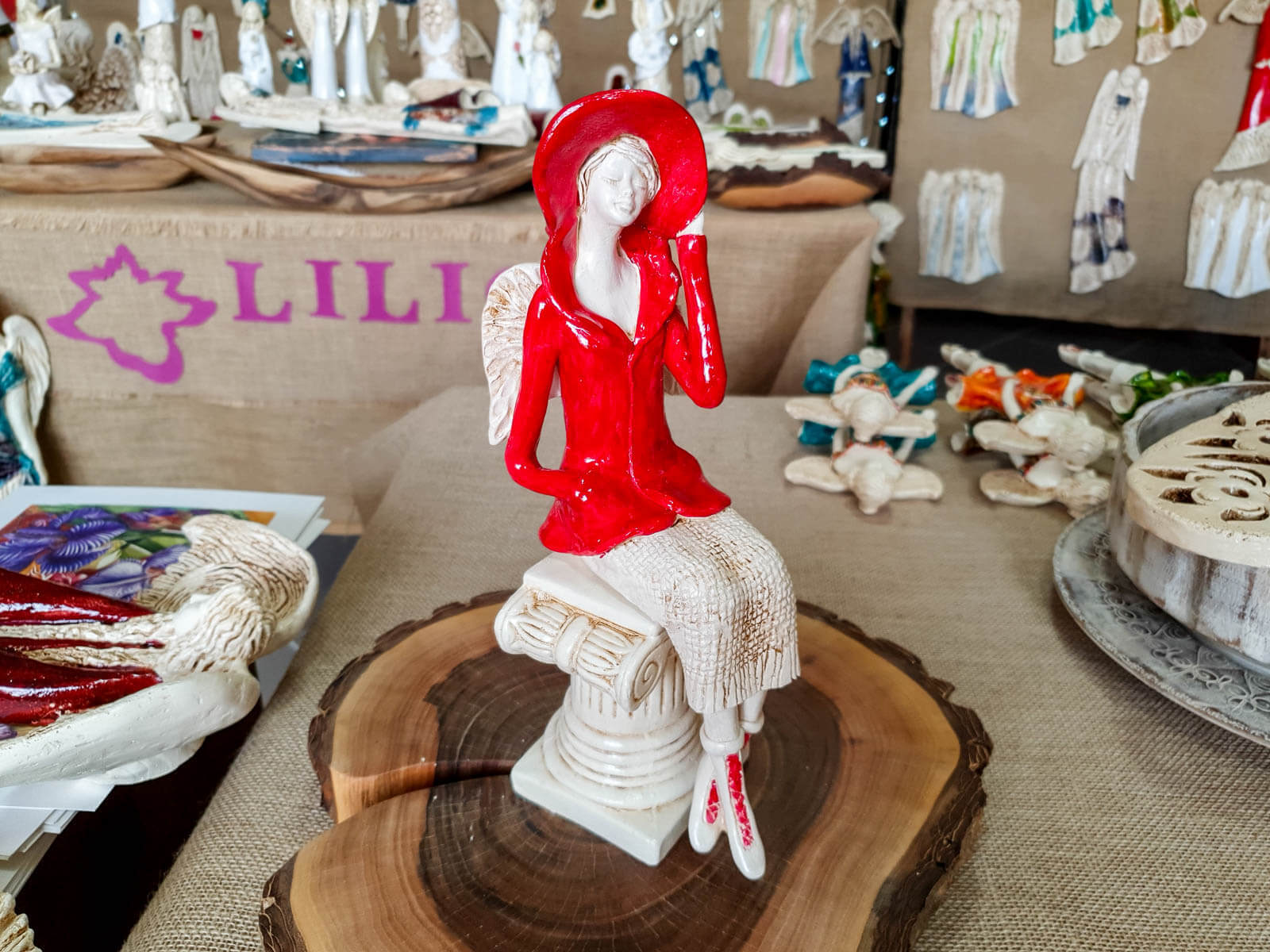 Aniołek Megan to urocza figurka przedstawiająca siedzącą kobietę, która zachwyca elegancją i dbałością o detale. Megan ubrana jest w czerwony żakiet i pasujący kapelusz, a także beżową spódnicę z delikatnym, sweterkowym motywem. Jej krótkie, jasne włosy oraz małe skrzydła dodają jej subtelnego uroku. Lewą rękę trzyma na rogu kapelusza, a prawą w kieszeni żakietu, co nadaje figurce naturalności i swobody.