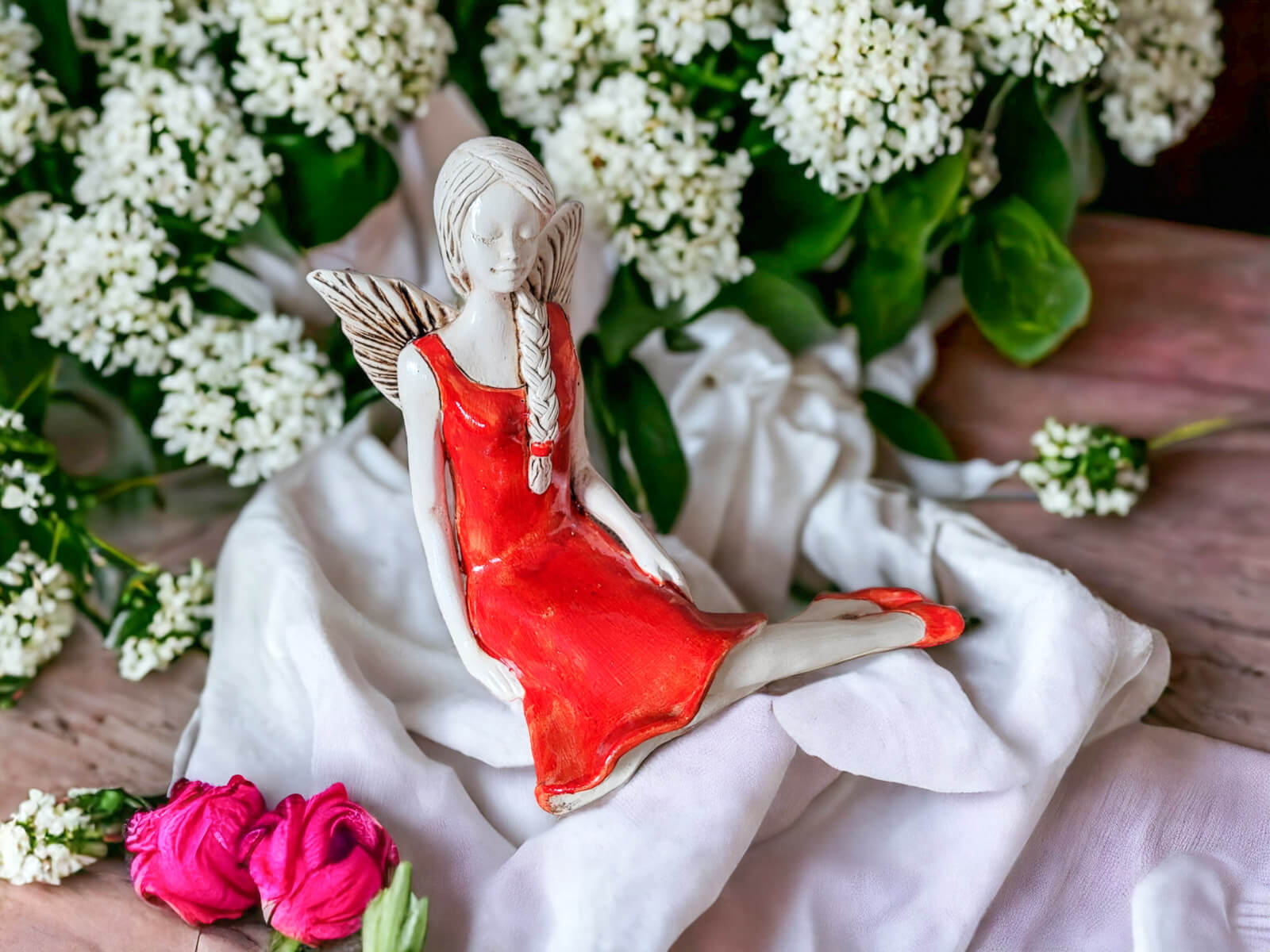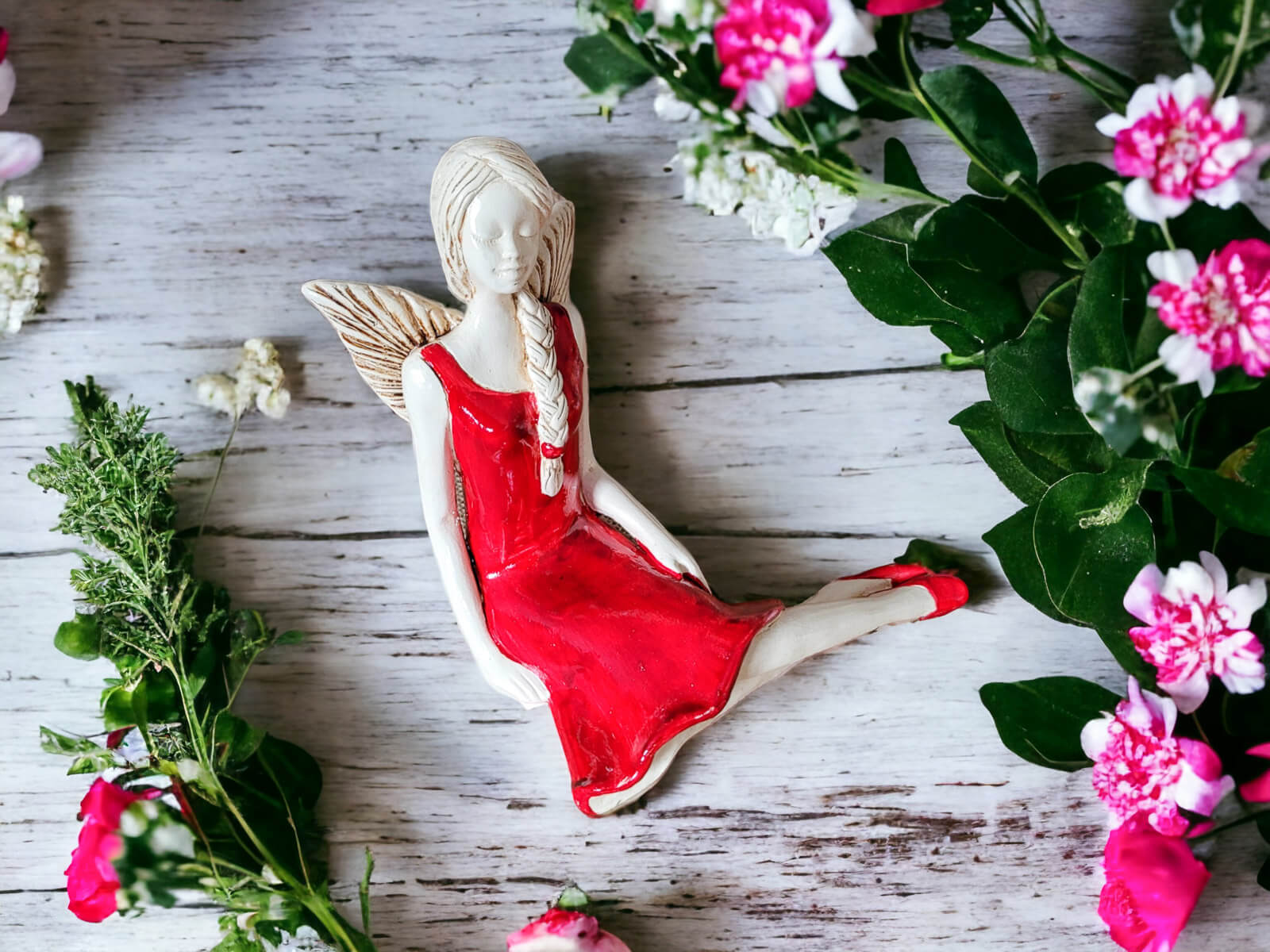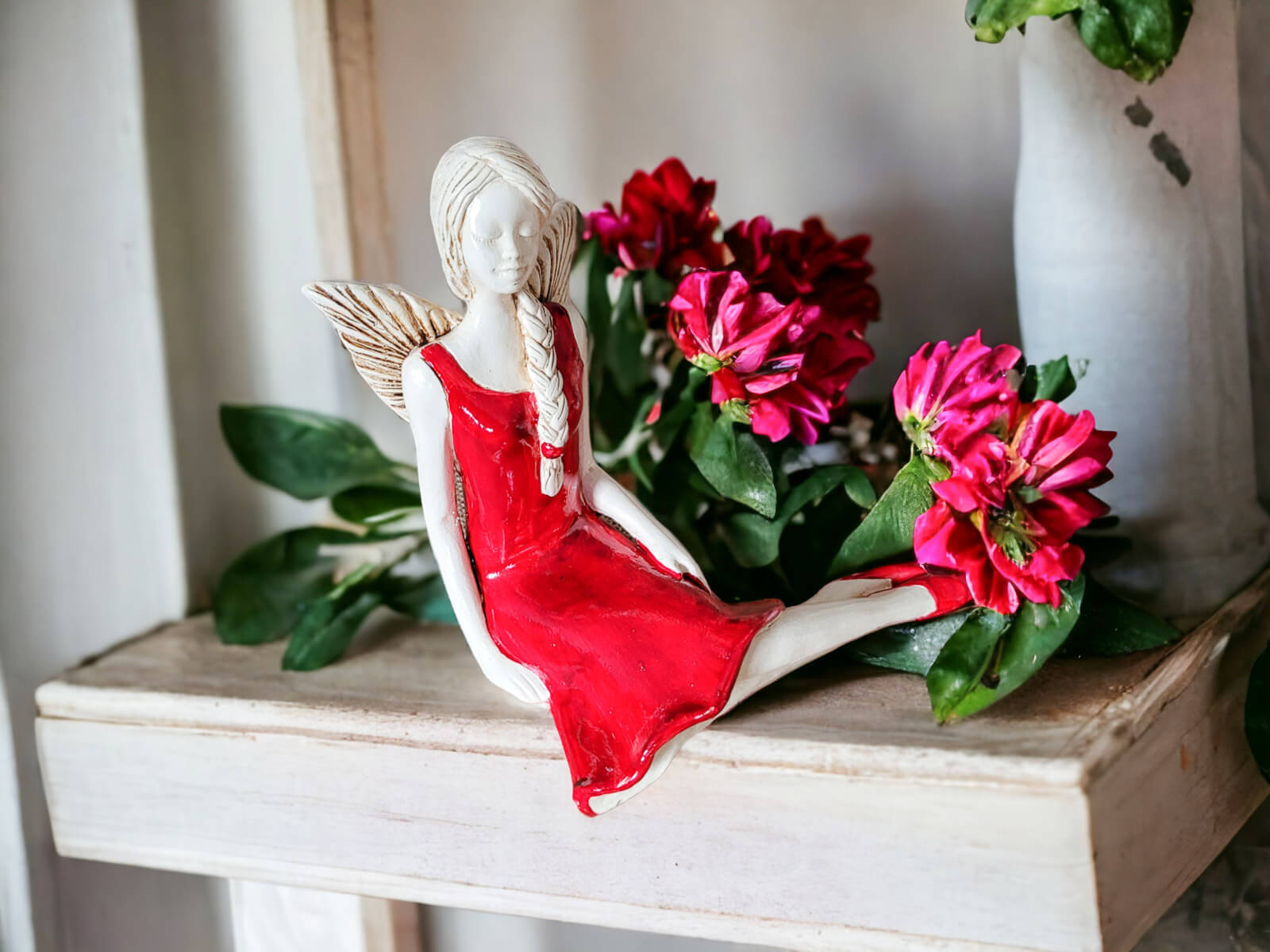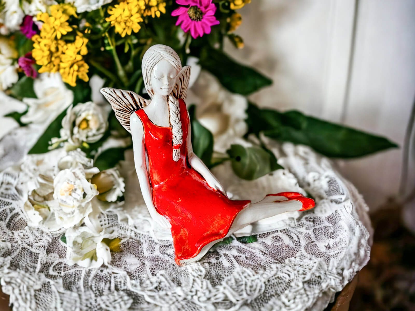 Anioł Matilda to urokliwa, gipsowa figurka niewielkich rozmiarów, która przedstawia siedzącą dziewczynkę z małymi, subtelnymi skrzydełkami. Jej długie włosy są splecione w warkocz sięgający pasa, dodając jej postaci wdzięku i delikatności. Całość jest przyozdobiona suknią o pięknym, intensywnym odcieniu czerwieni, która przyciąga wzrok i dodaje elegancji.
