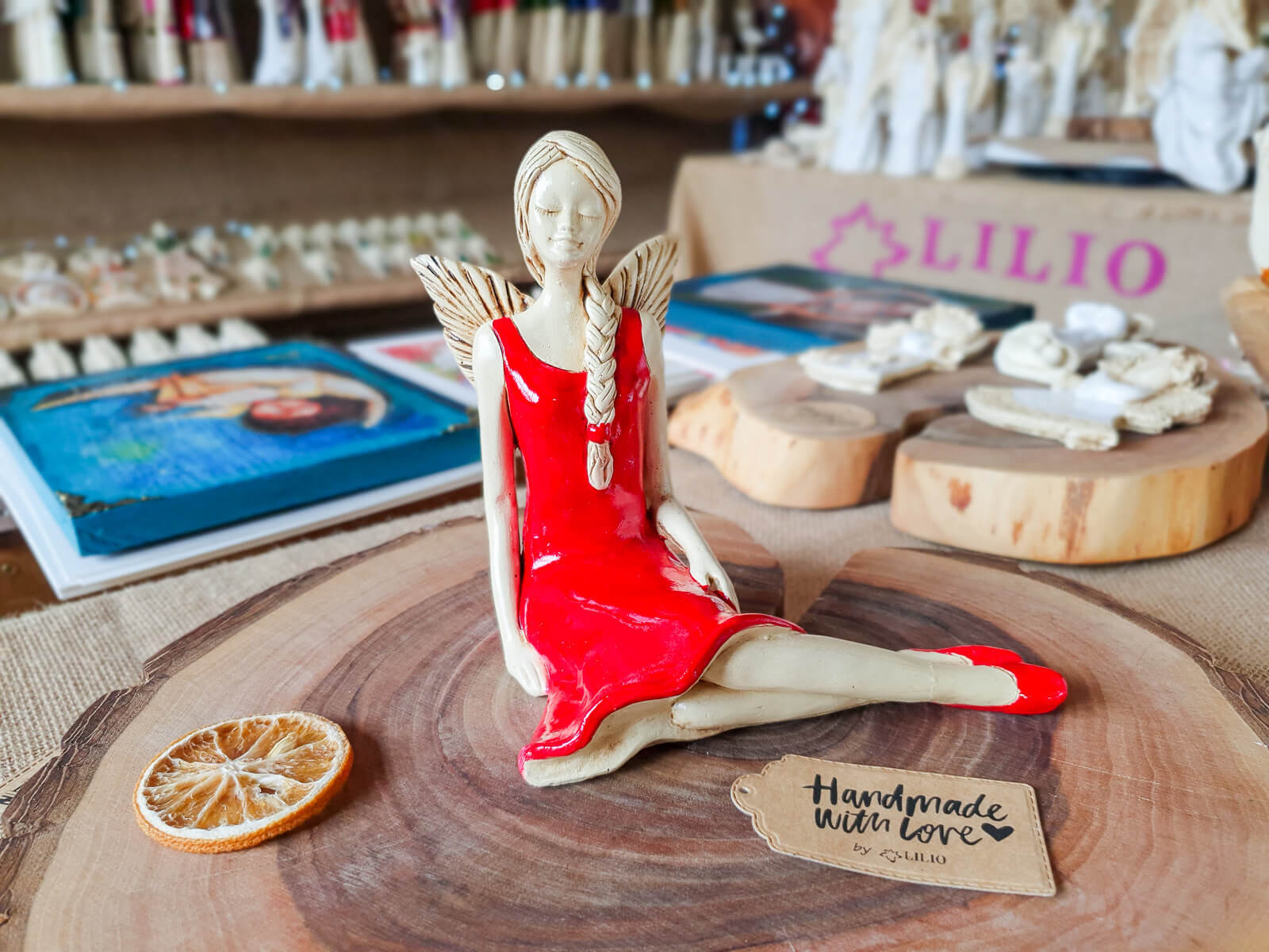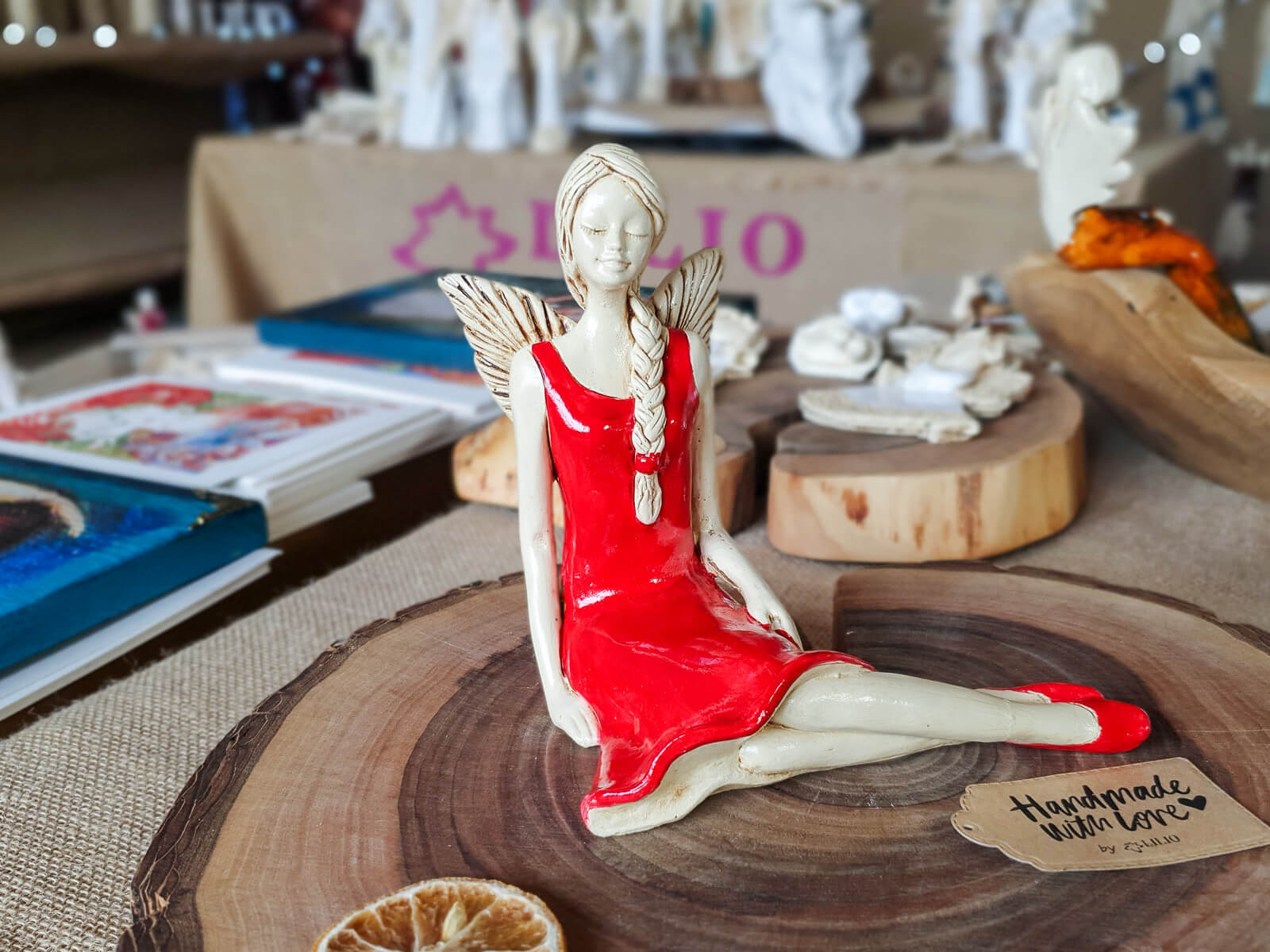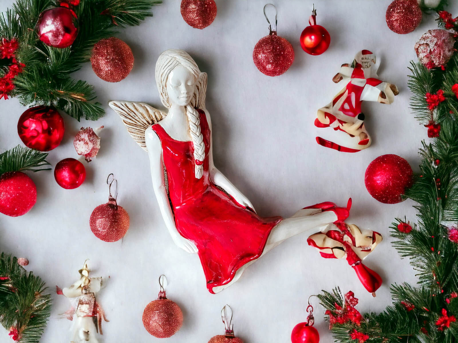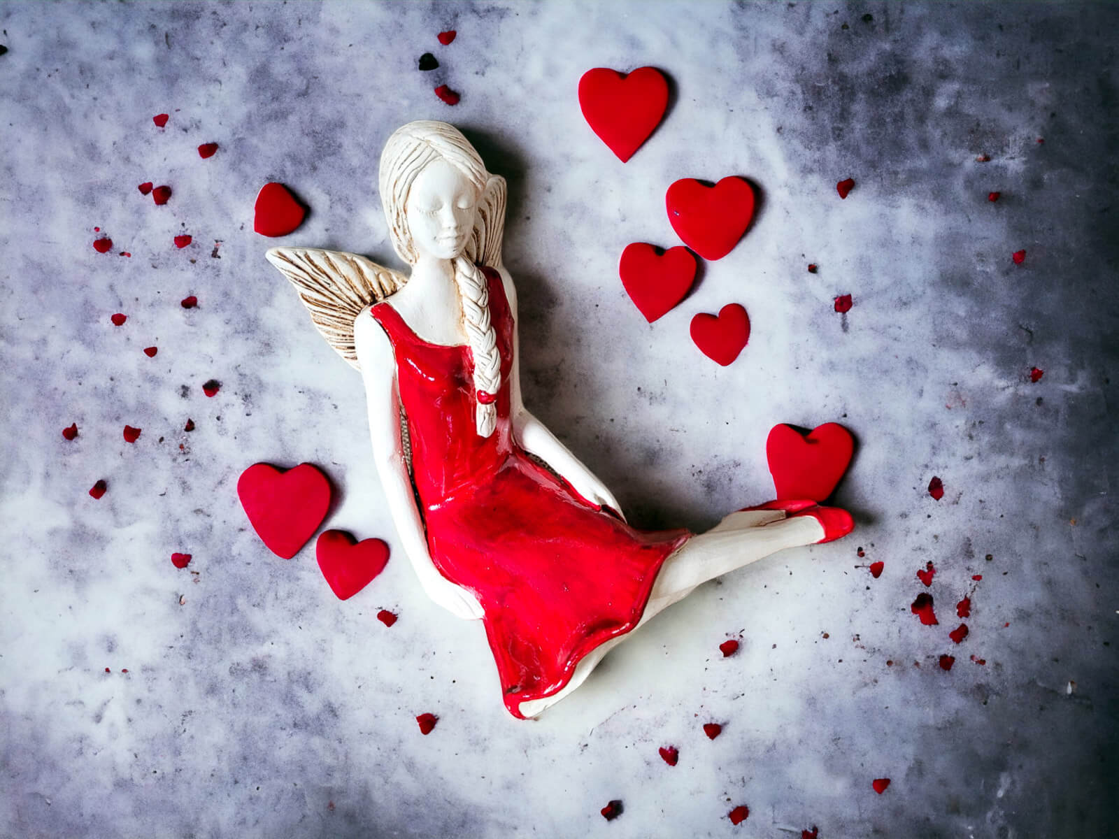 Anioł Matilda to urokliwa, gipsowa figurka niewielkich rozmiarów, która przedstawia siedzącą dziewczynkę z małymi, subtelnymi skrzydełkami. Jej długie włosy są splecione w warkocz sięgający pasa, dodając jej postaci wdzięku i delikatności. Całość jest przyozdobiona suknią o pięknym, intensywnym odcieniu czerwieni, która przyciąga wzrok i dodaje elegancji.