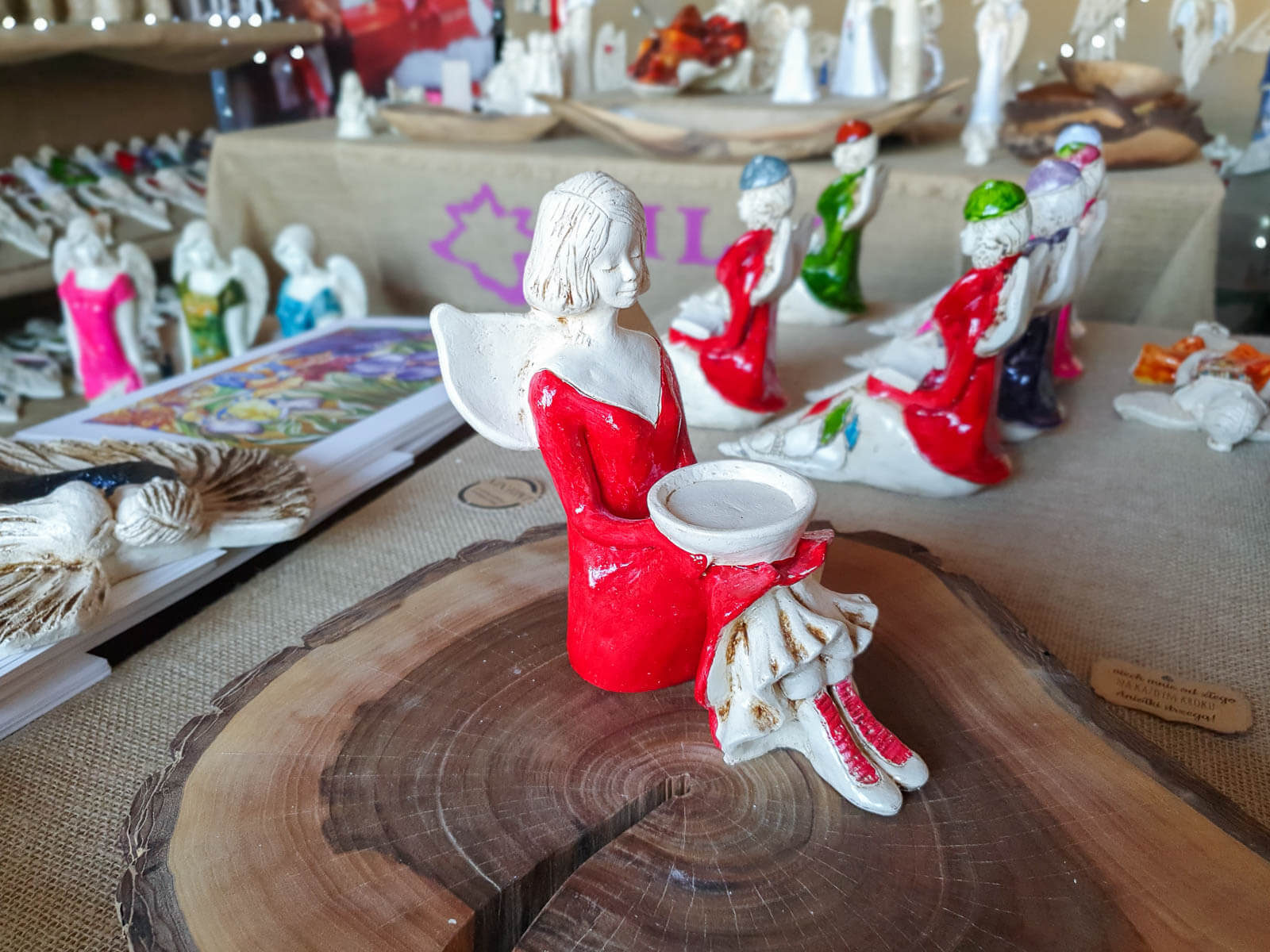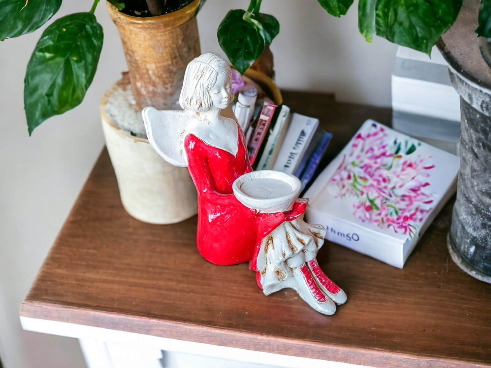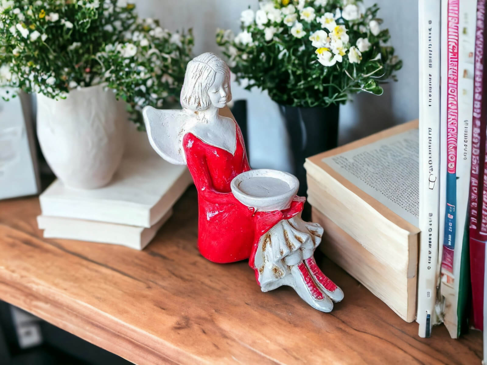 Aniołek Marion to stojąca figurka wykonana ręcznie z gipsu. Przedstawia dziewczynkę w długiej, czerwonej sukni z odkrytymi ramionami. Ma ona jasne, krótkie włosy oraz małe skrzydła skierowane w górę. Jest w pozycji siedzącej, a w dłoniach trzyma misę, do której można włożyć małą świeczkę. Dekoracja nadaje się do postawienia w domu, a po zapaleniu świeczki nada wnętrzu klimatyczny nastrój. Może służyć jako prezent dla małej dziewczynki, mamy lub babci.