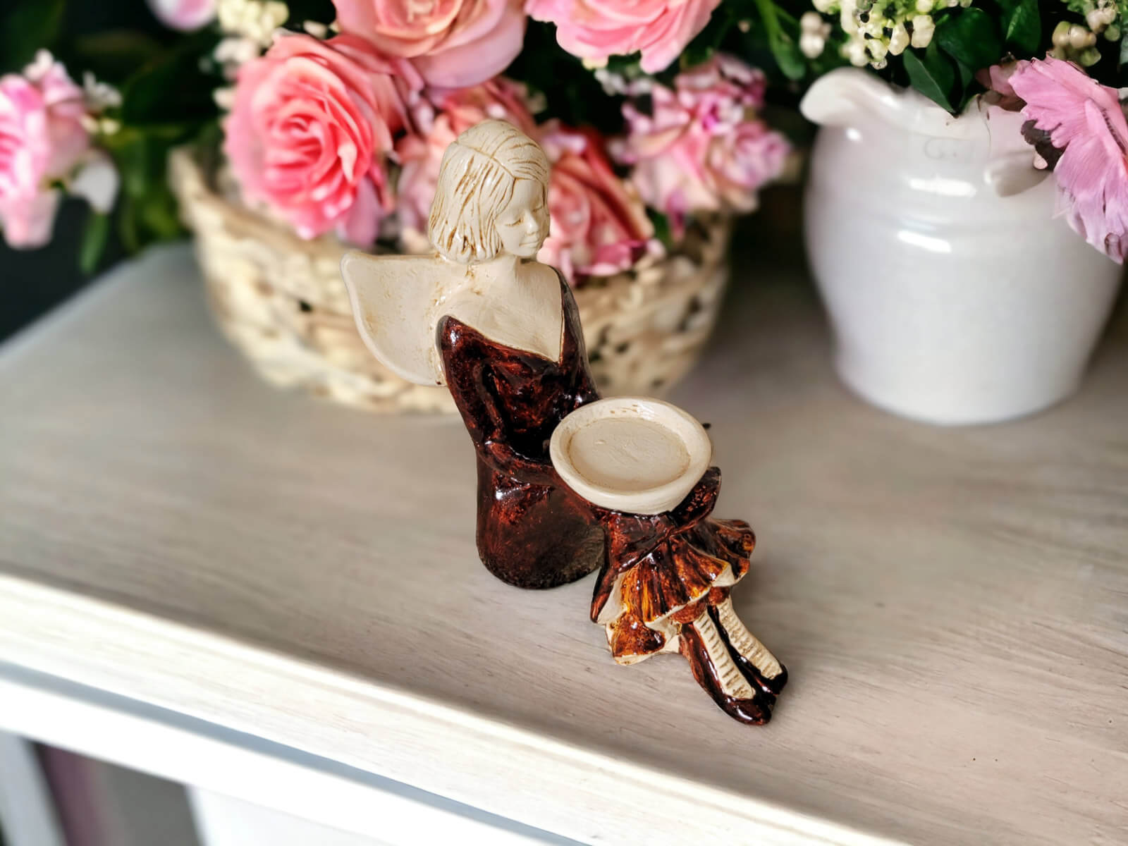 Aniołek Marion to postać siedzącej dziewczyny o krótkich włosach. Ma ugięte w kolanach nogi, a na nich trzyma misę. Jest czymś więcej niż zwykłą figurką. W naczyniu znajdującym się w jej dłoniach możesz umieścić małą świeczkę, co na pewno doda blasku Twojemu wnętrzu. W połączeniu z pięknym, opalizującym brązem, w który Marion jest odziana, możesz spodziewać się spektakularnego efektu.