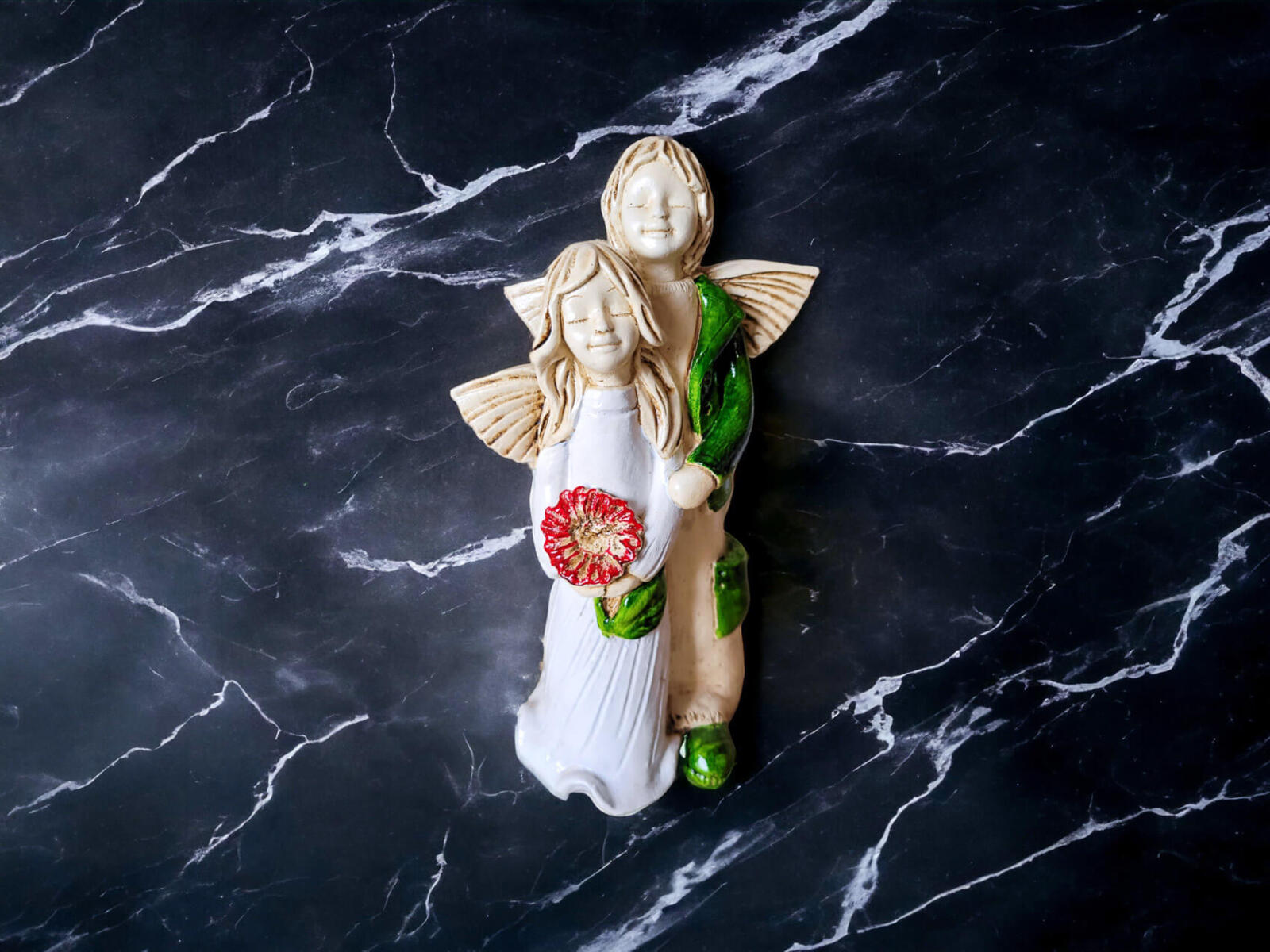 Aniołki Allen i Alice w wersji zielonej. Alice ma na sobie białą suknię. To wrażenie wzmacnia biały bukiet. Allen z kolei jest ubrany w strój z elementami elektryzującej zieleni, co dodaje całości charakteru. Allen obejmuje Alice w czułym geście, a na twarzach obojga maluje się błogi uśmiech. Ta niewielka figurka będzie się wyróżniać wśród innych dekoracji i na pewno zaciekawi Twoich gości. Sprawdzi się również jako efektowny dodatek do prezentu ślubnego.