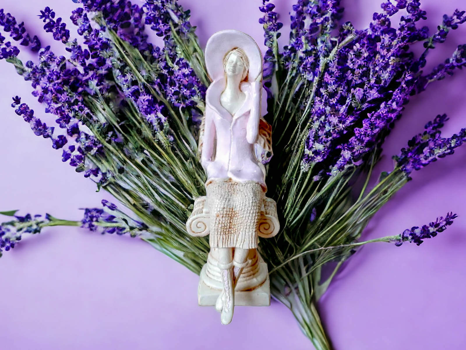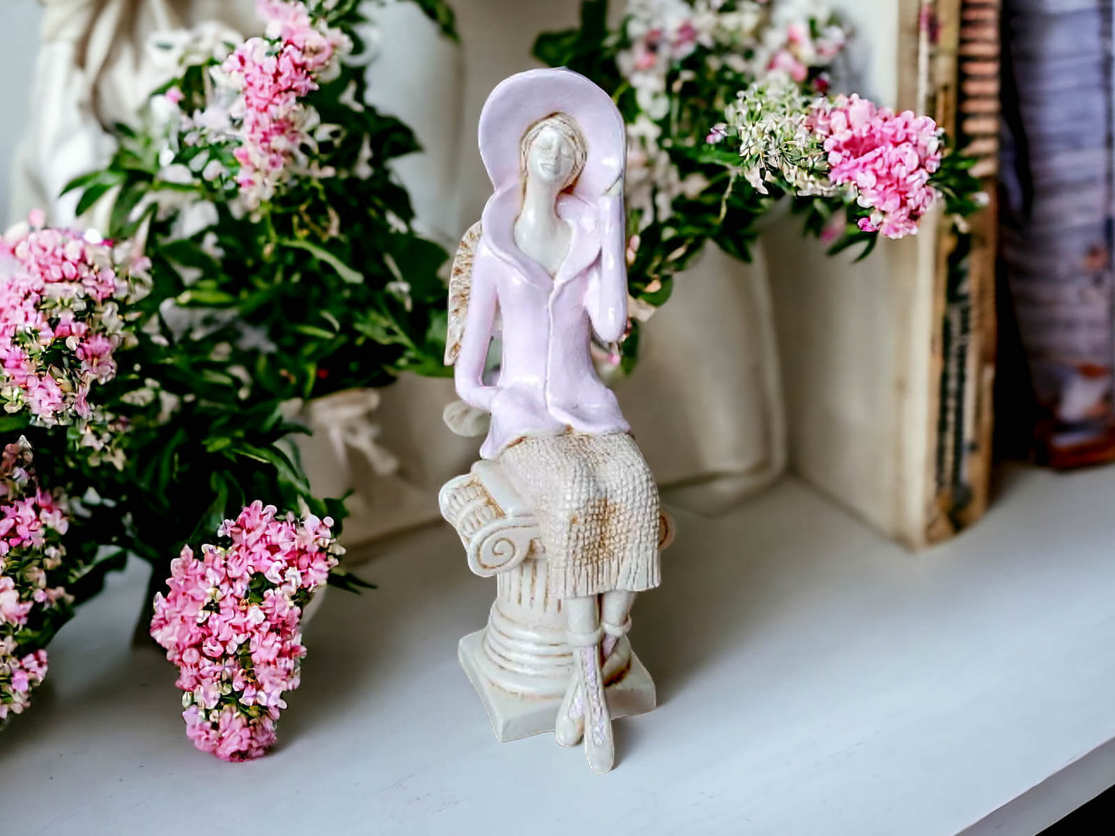 Aniołek Megan przedstawia siedzącą kobietę w różowym żakiecie i kapeluszu. Ubrana jest także w beżową spódnicę ze sweterkowym motywem. Ma krótkie, jasne włosy i małe skrzydła. Lewą rękę trzyma na rogu kapelusza, a prawą w kieszeni żakietu. Figurka jest wykonana z gipsu. Idealnie pasuje na prezent dla żopny, mamy, babci, siostry czy koleżanki.