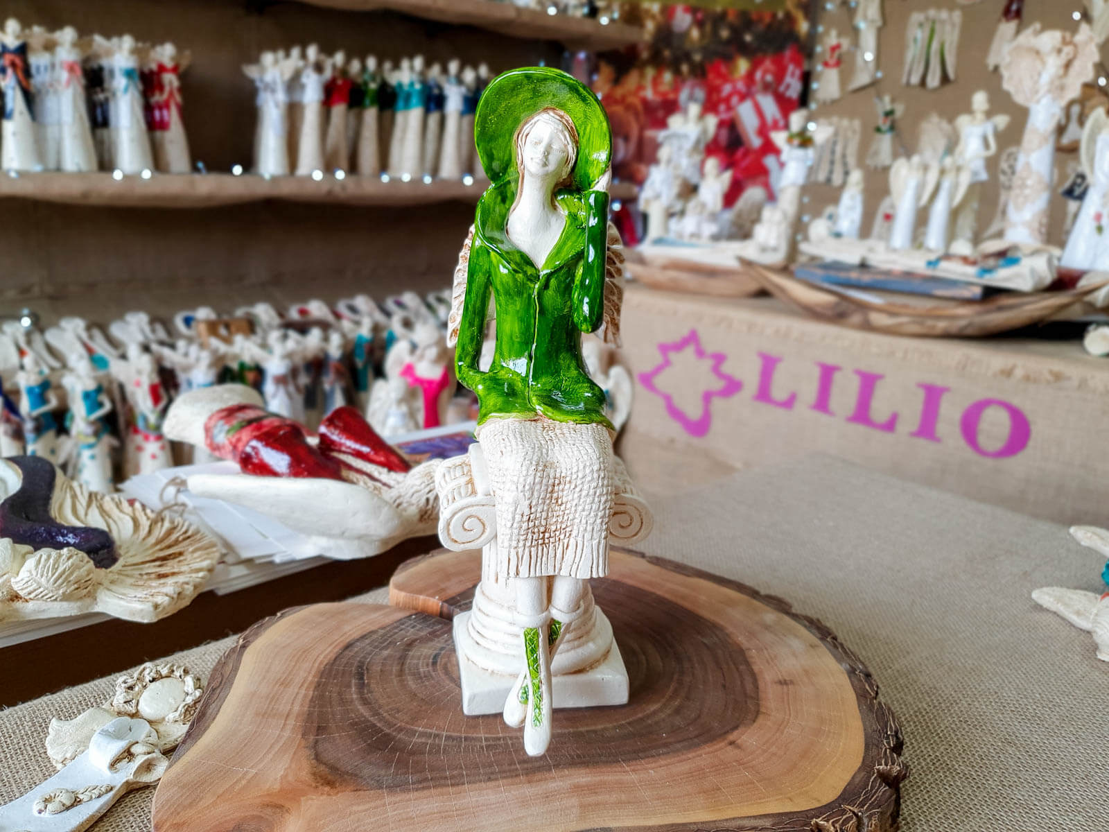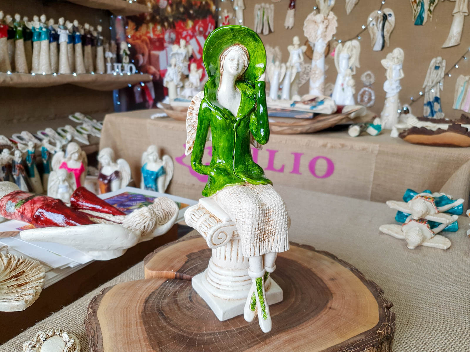 Aniołek Megan to urocza figurka przedstawiająca siedzącą kobietę, która zachwyca elegancją i dbałością o detale. Megan ubrana jest w zielony żakiet i pasujący kapelusz, a także beżową spódnicę z delikatnym, sweterkowym motywem. Jej krótkie, jasne włosy oraz małe skrzydła dodają jej subtelnego uroku. Lewą rękę trzyma na rogu kapelusza, a prawą w kieszeni żakietu, co nadaje figurce naturalności i swobody.