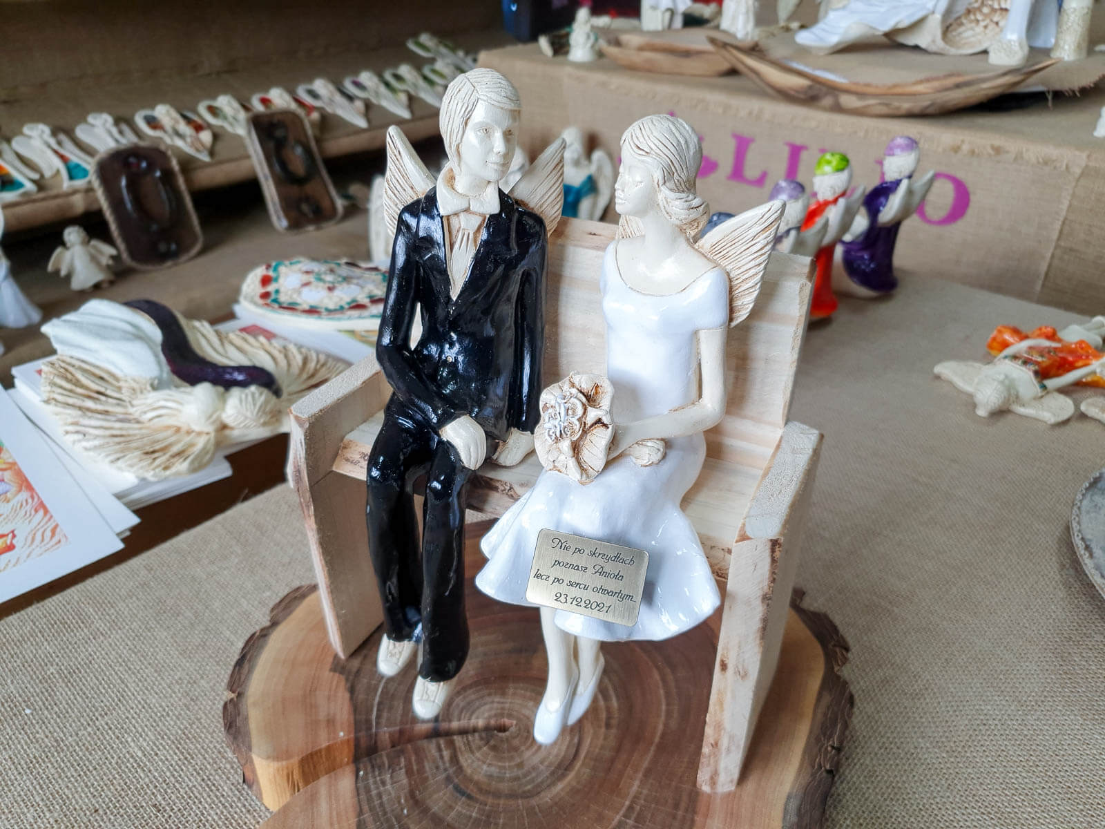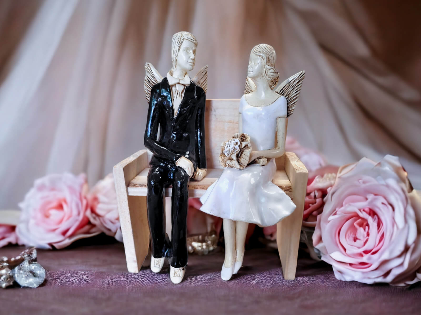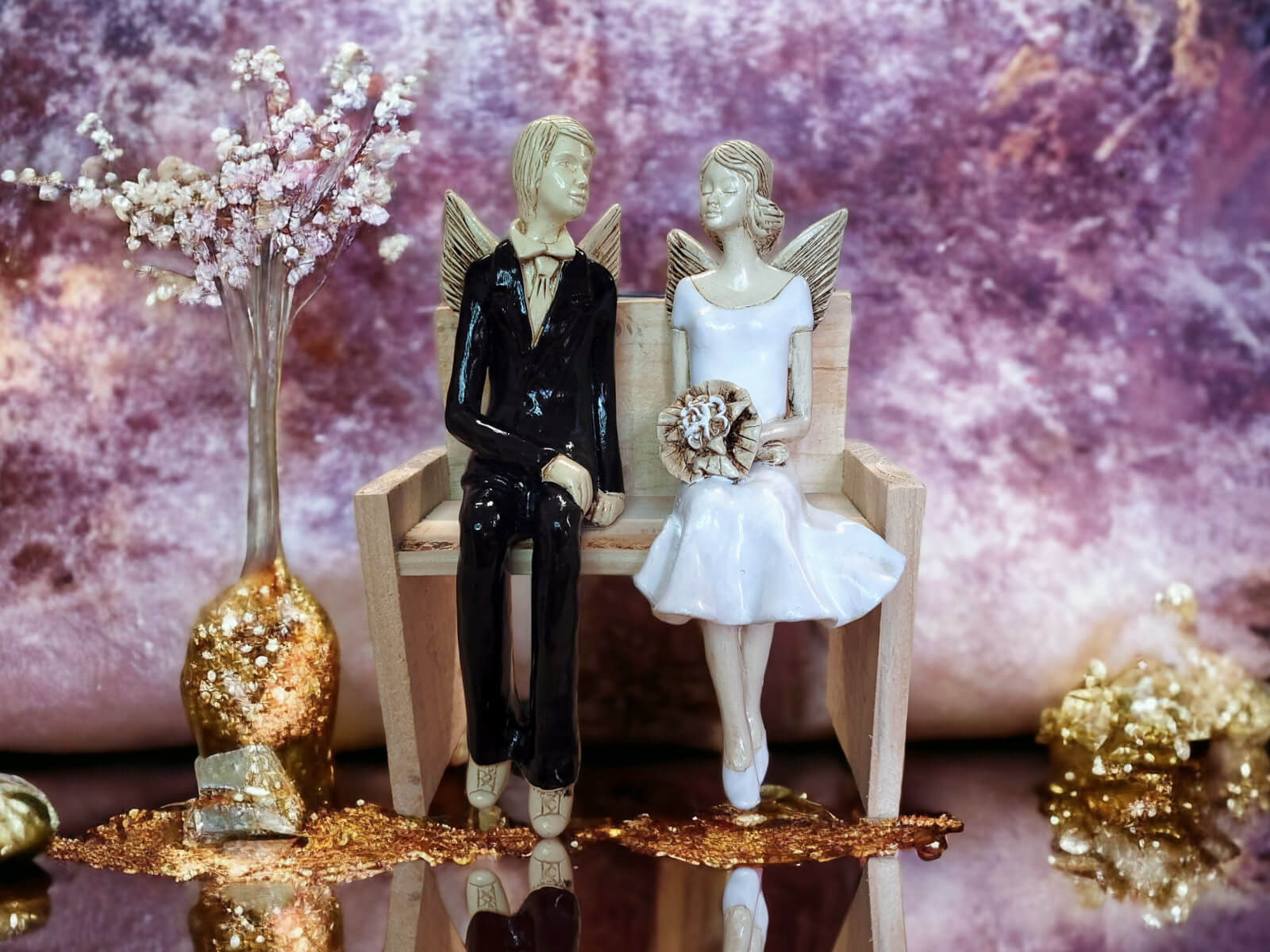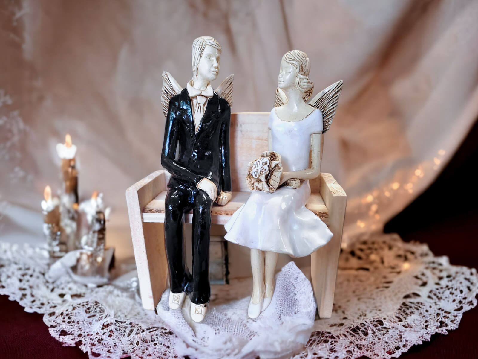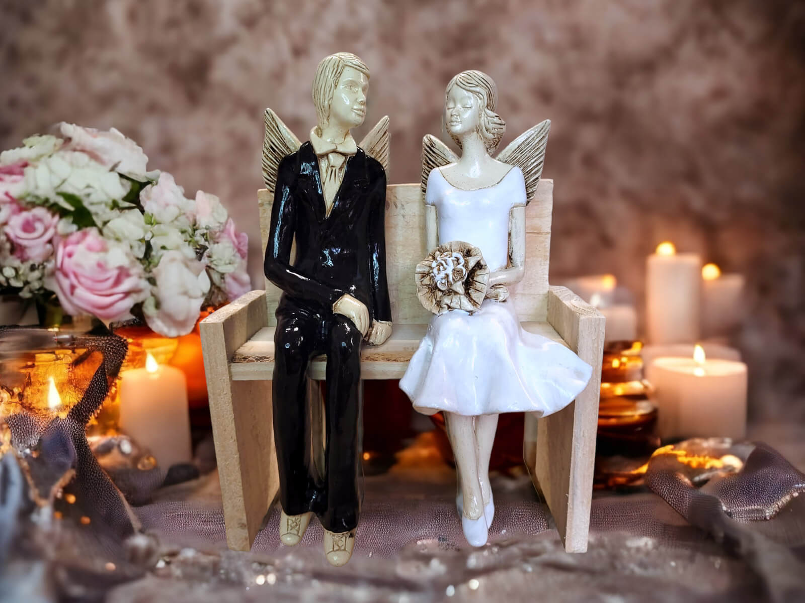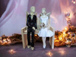 Anioły Młoda Para to ręcznie wykonana figurka. Czekają na ceremonię ślubną. Pan Młody ubrany jest w czarny, elegancki garnitur. Panna Młoda ma na sobie krótką, białą sukienkę. W ręku trzyma bukiet z róż. Anioły są świetny pomysłem na prezent ślubny lub dekorację ślubną. Pięknie mogą ozdobić stół na przyjęciu weselnym.