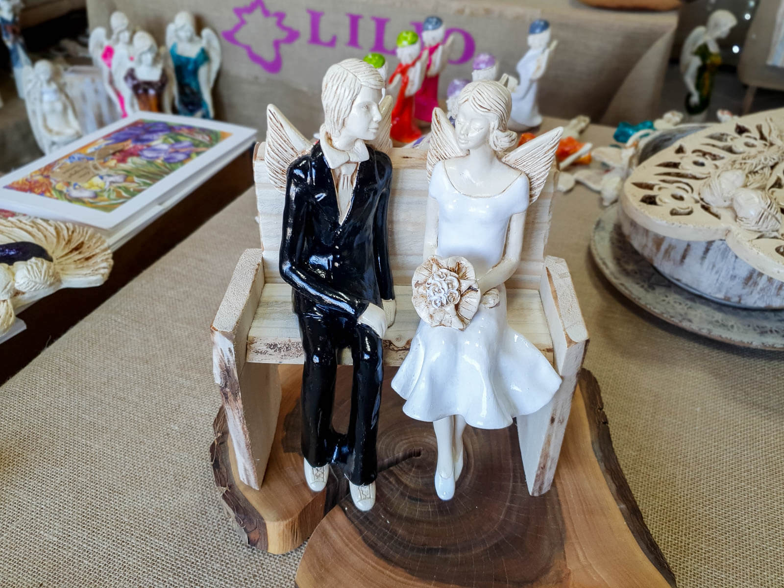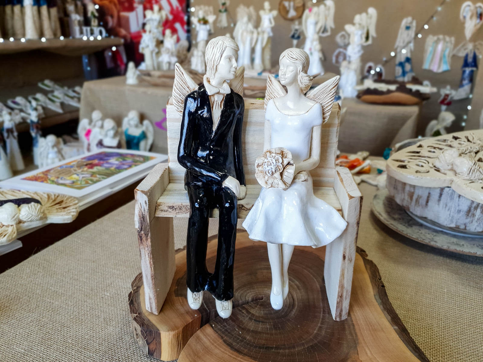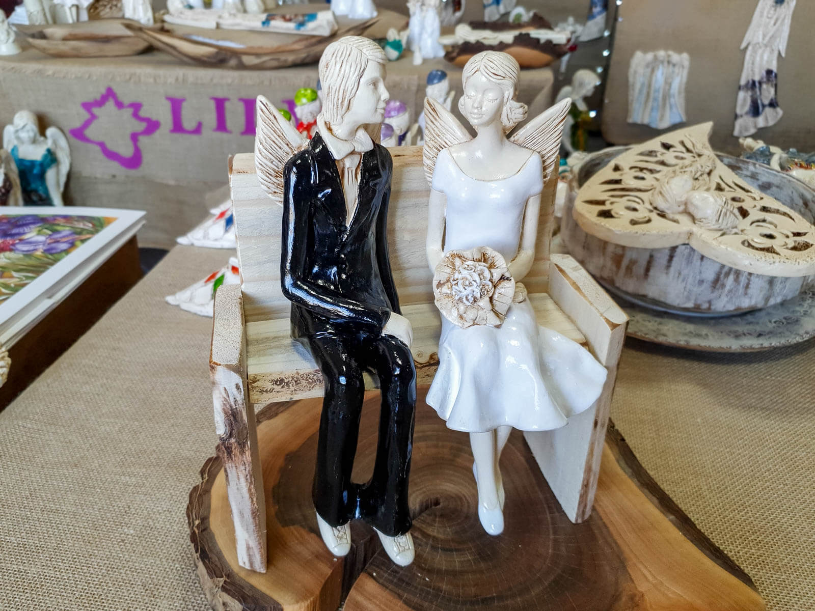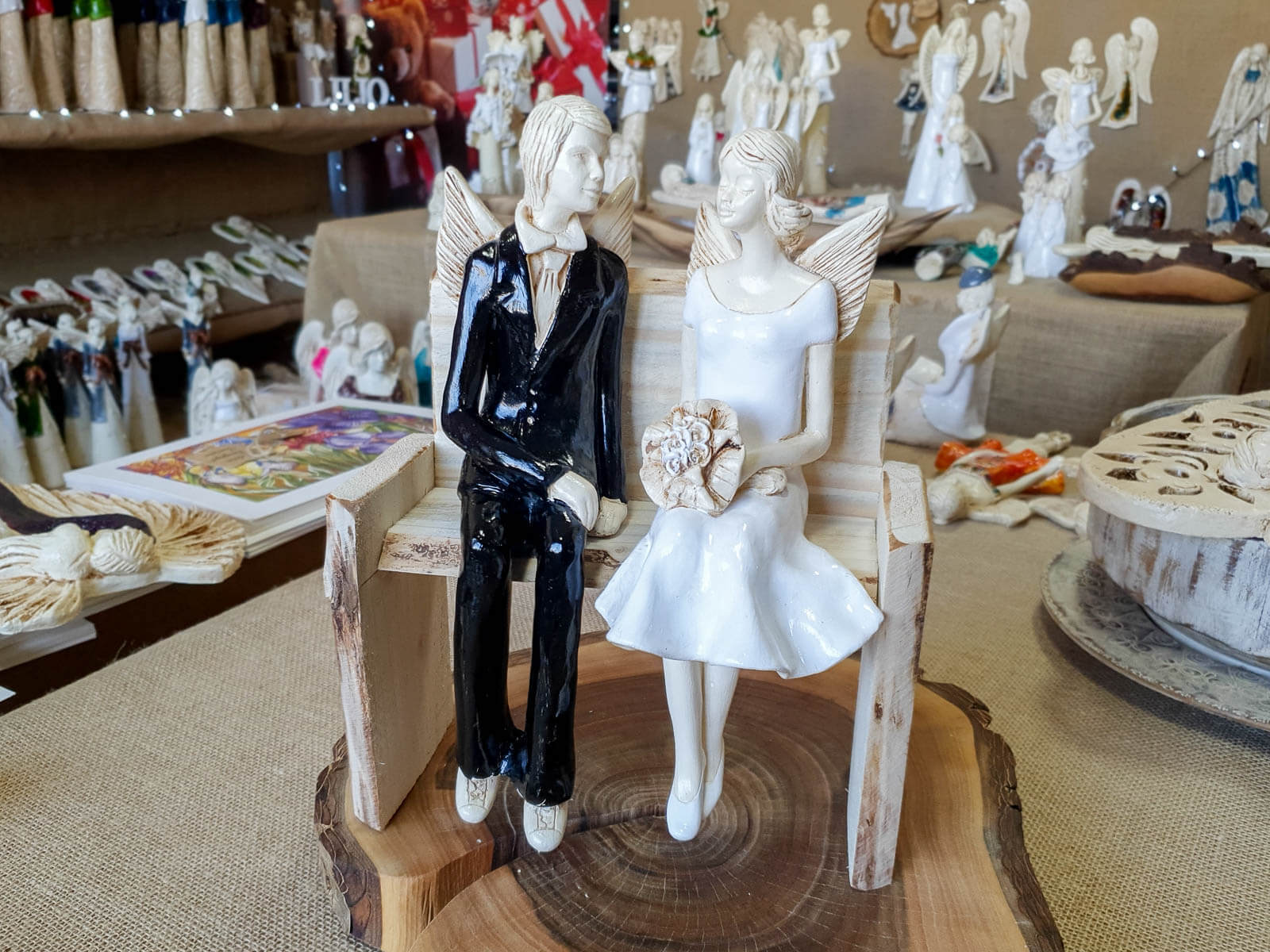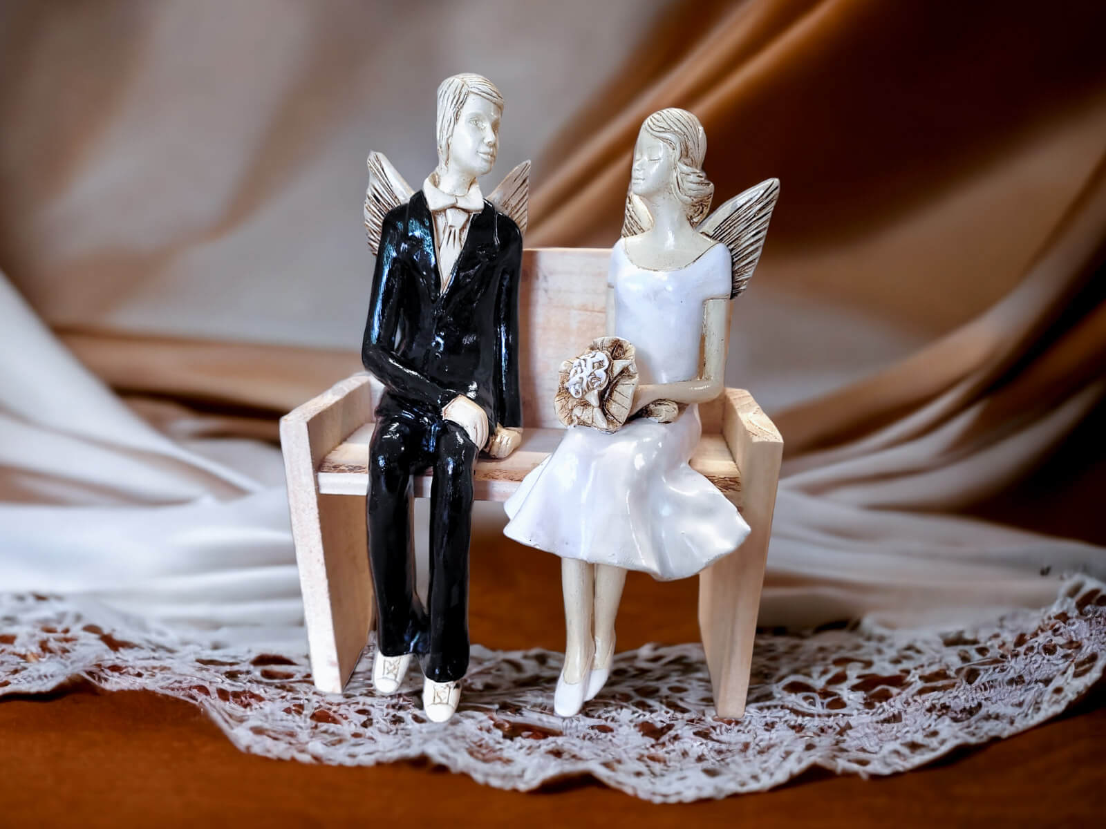 Anioły Młoda Para to ręcznie wykonana figurka. Czekają na ceremonię ślubną. Pan Młody ubrany jest w czarny, elegancki garnitur. Panna Młoda ma na sobie krótką, białą sukienkę. W ręku trzyma bukiet z róż. Anioły są świetny pomysłem na prezent ślubny lub dekorację ślubną. Pięknie mogą ozdobić stół na przyjęciu weselnym.