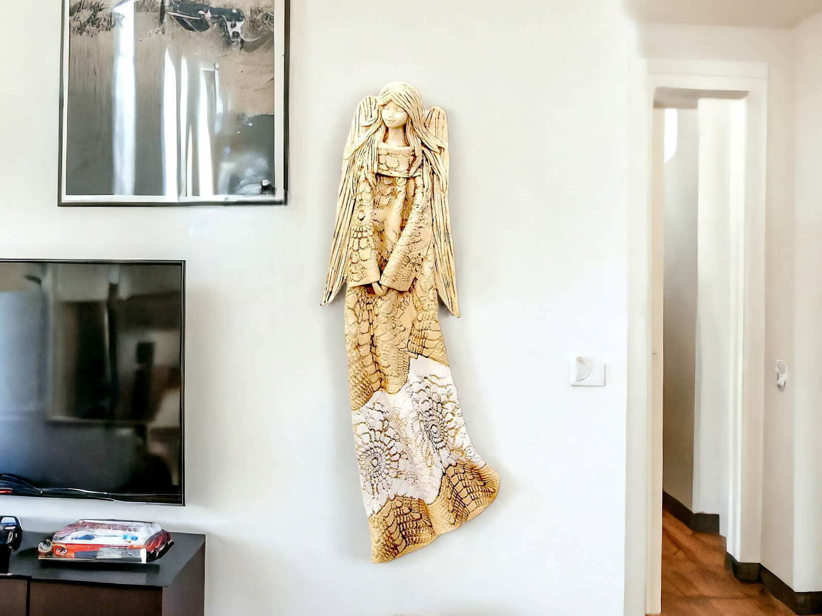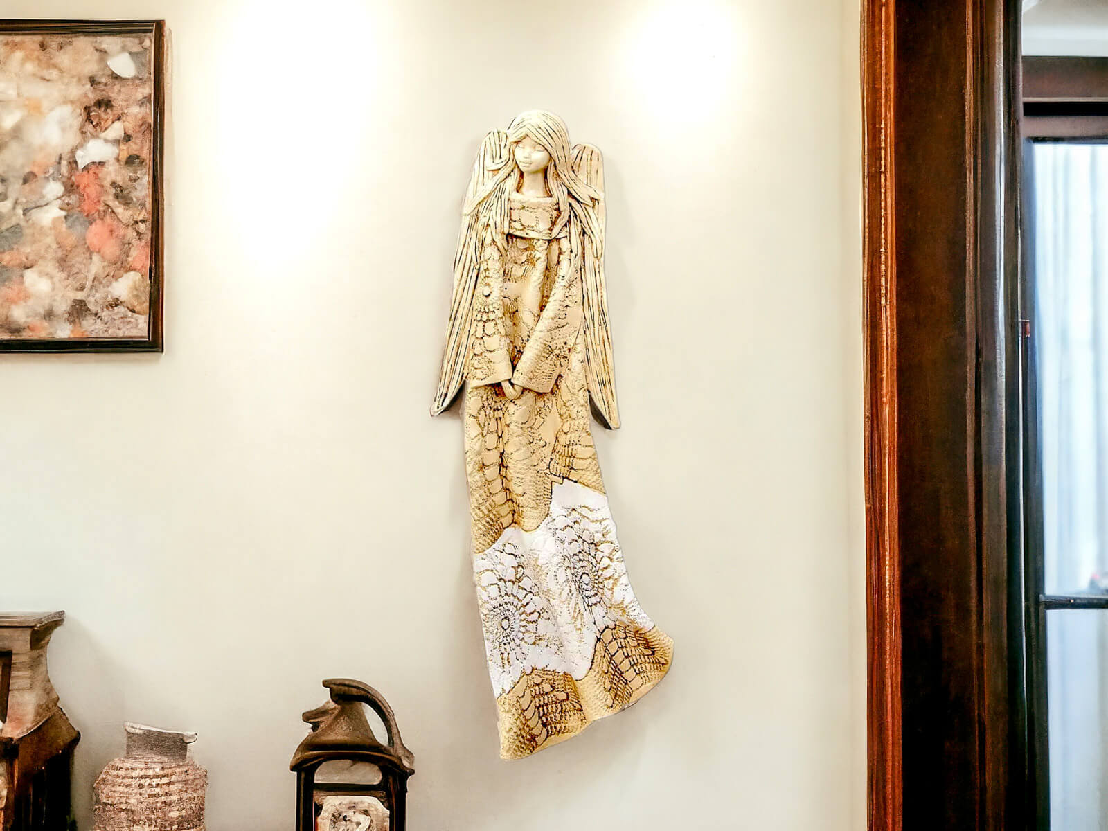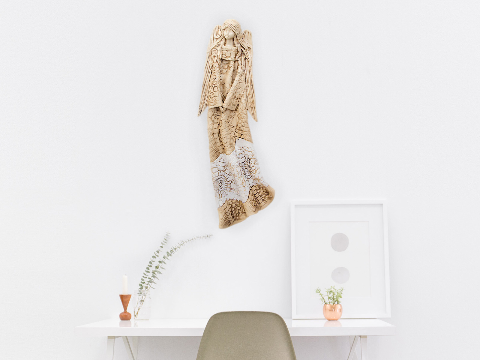 Anioł Genesis to ręcznie wykonana figurka do zawieszenia na ścianę. Jego imię jest pochodzenia greckiego. Anioł jest pełen tajemnic. Cały swój czas poświęca sprawom społecznym. Potrafi każdemu udzielić pomocy i wsparcia. Troska o innych wypływa prosto z jej serca. Jest ubrany w zwiewną, beżową suknie z haftowanymi ornamentami. Z gracją eksponuje rozłożyste skrzydła. Figurka nadaje się na prezent na każdą okazję.