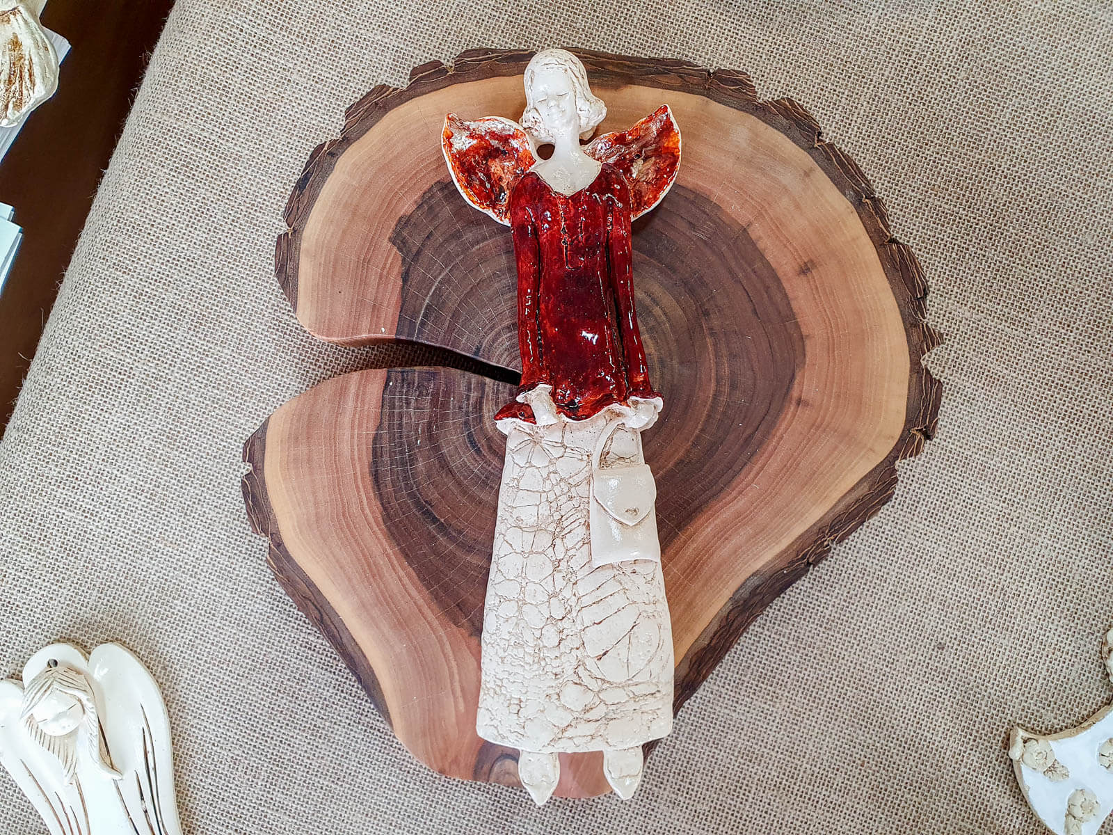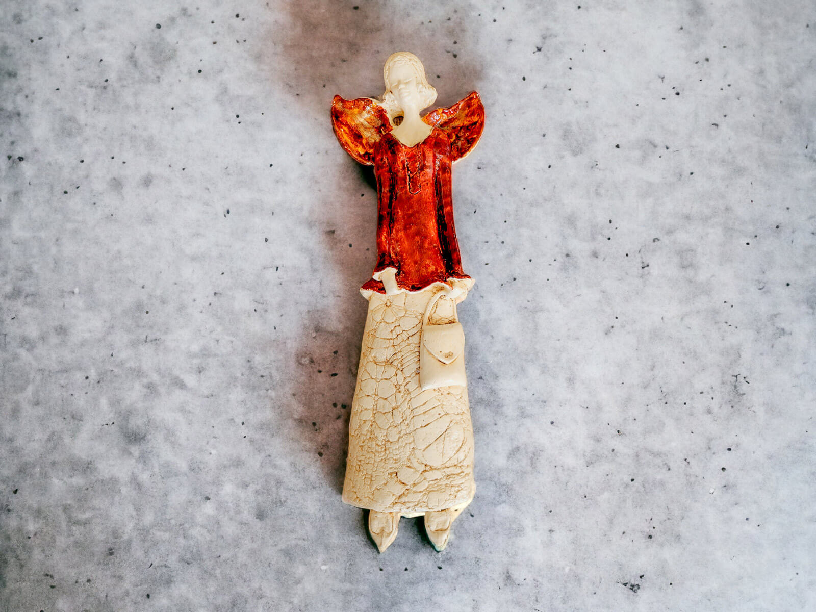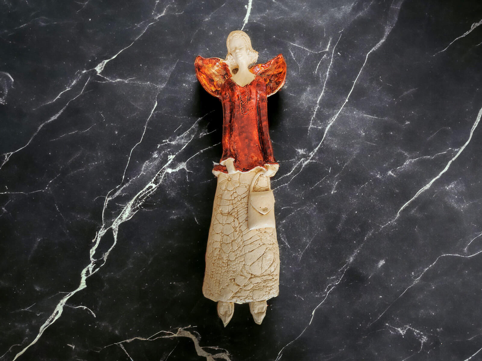 Anioł Christy to ręcznie wykonana figurka do powieszenia na ścianę. Christy to elegancka dziewczyna, która interesuje się modą. Wybiera się na pokaz mody.Ubrana jest w wytworną beżową-brązową suknię. W ręku trzyma torebkę.Jest marzycielką. Jej dusza jest wrażliwa na piękno. Anieliczka często kieruje się sercem zamiast rozumem. Idealnie nadaje się do powieszenia na ścianie w każdym wnętrzu, i niekoniecznie w salonie :).