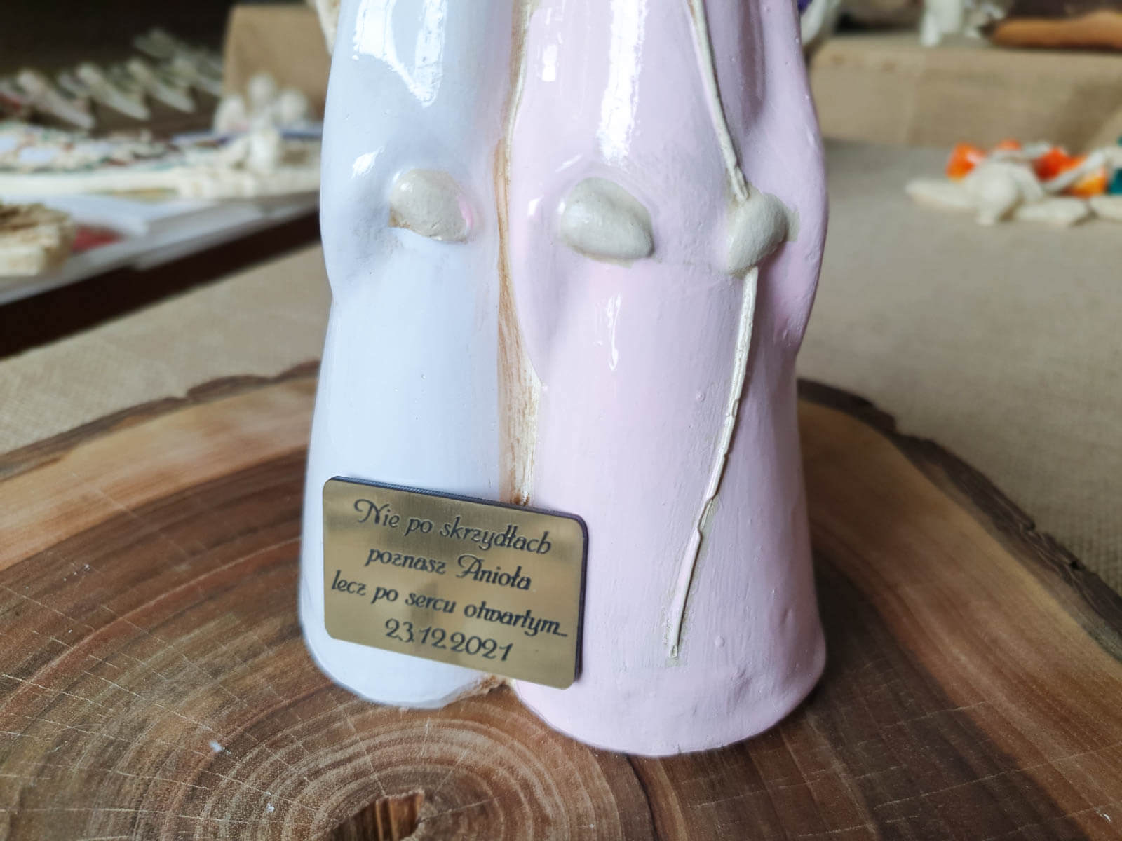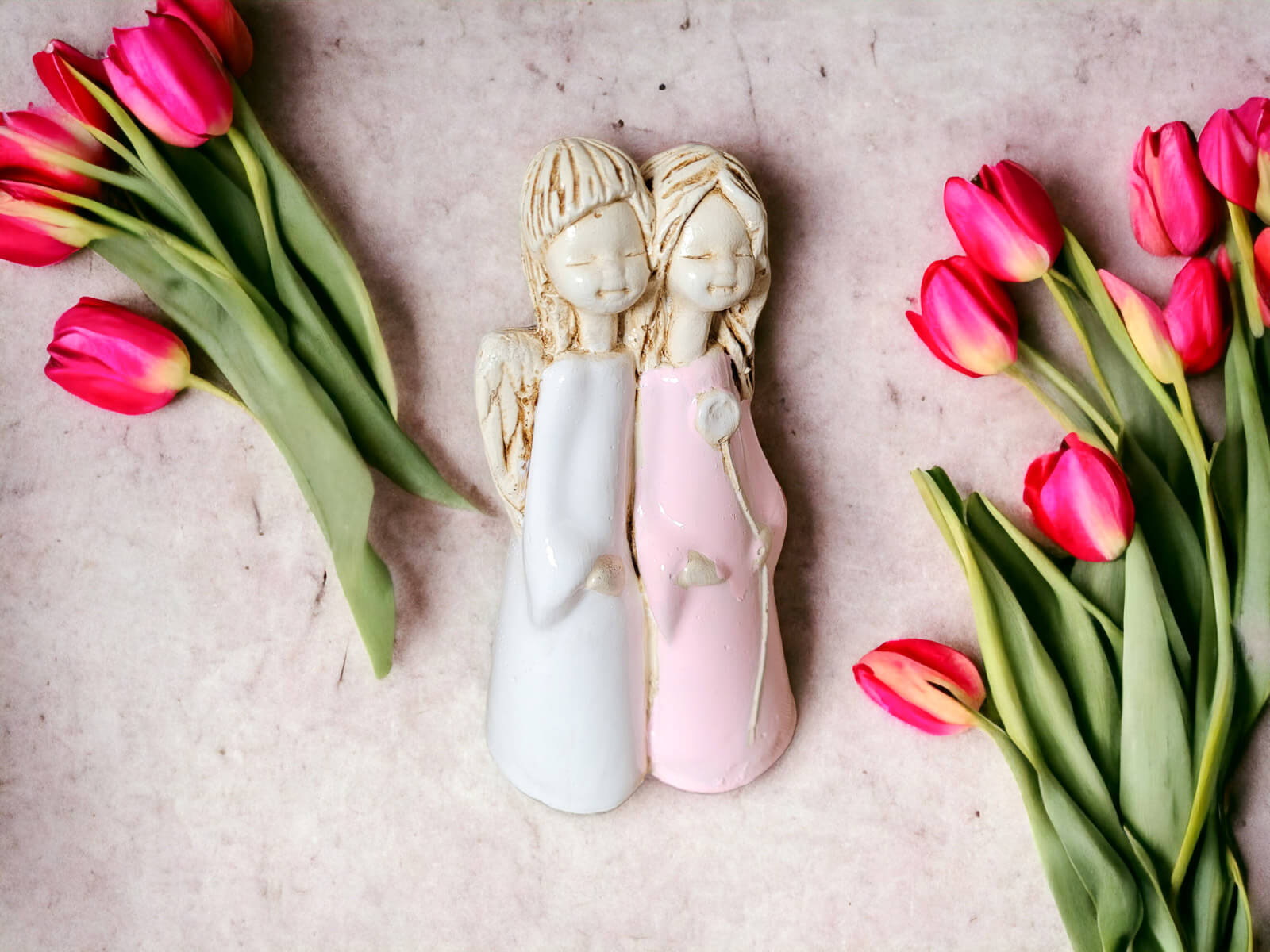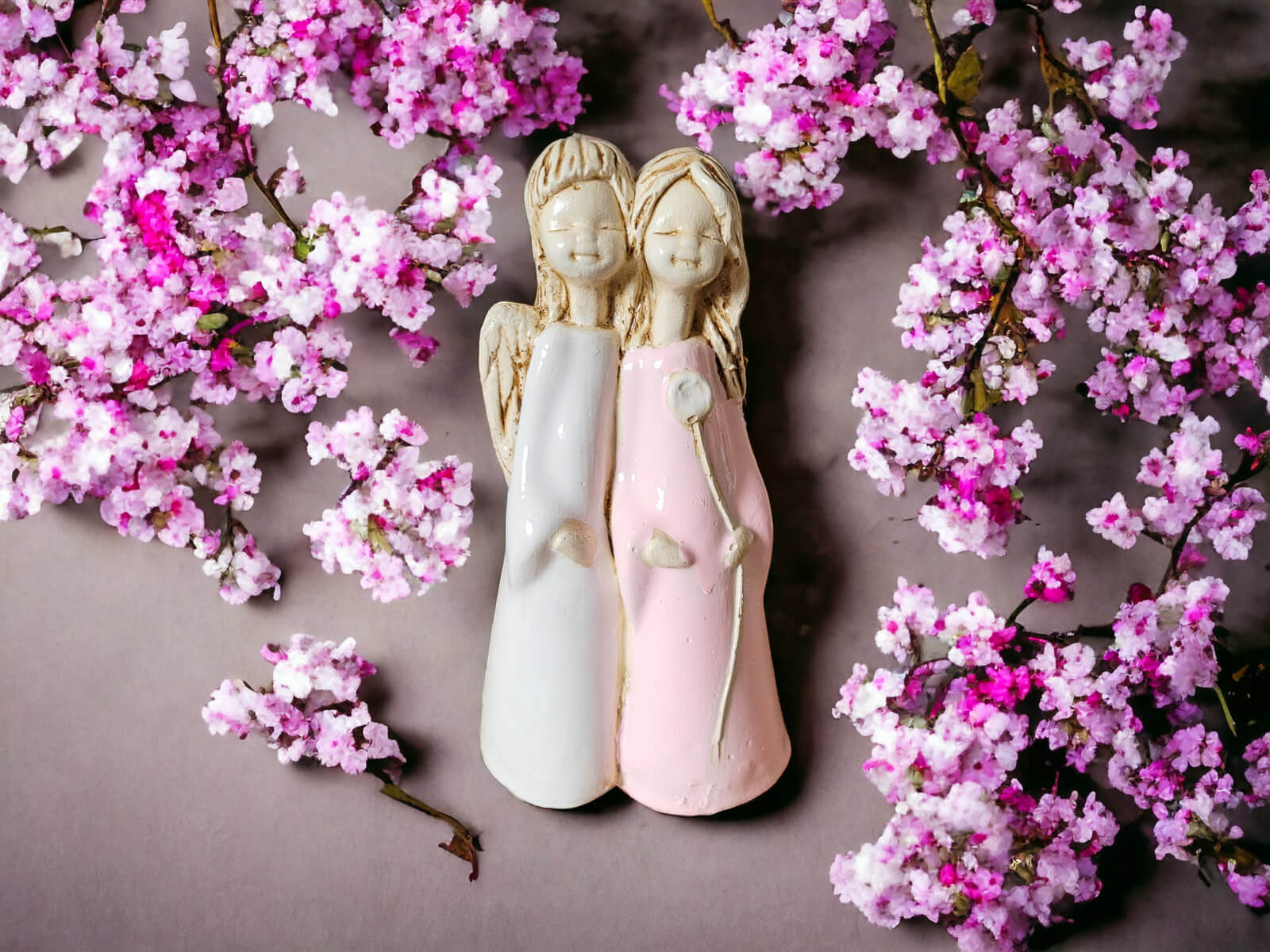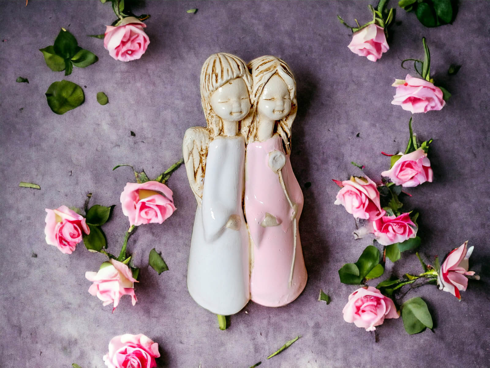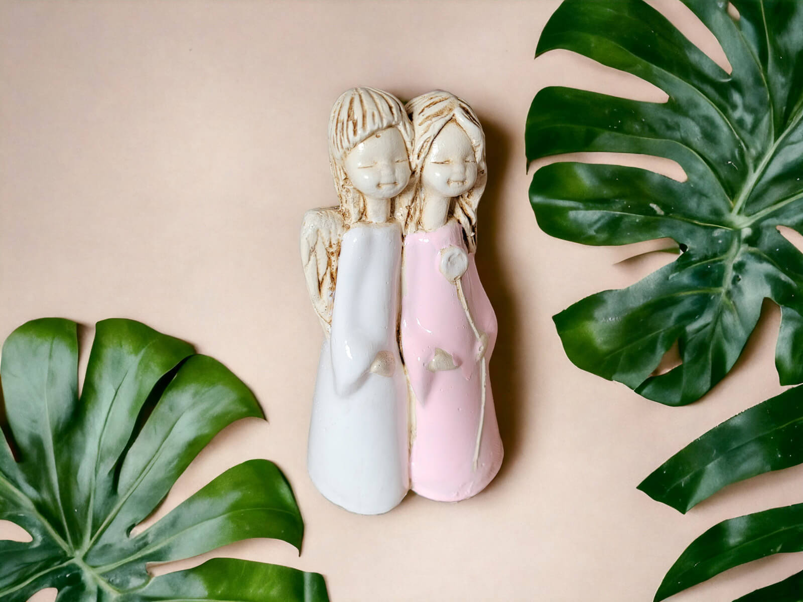 Anioł Apple & Ella to gipsowa, ręcznie wykonana figurka przedstawiająca dwie małe dziewczynki. Jest ona rodzaju stojącego, więc można ją postawić na półce lub w innym dowolnym miejscu. Anioły są ubrane w sukienki, jeden w białą, a drugi w różową. Mają takie same skrzydła oraz podobne fryzury. Dziewczynka w różowej sukience trzyma w lewej dłoni kwiatka i jest w objęciach dziewczynki w białym odzieniu. Można wnioskować, że są to siostry. Dekoracja nadaje się dla dzieci oraz na prezent z okazji I Komunii Świętej.