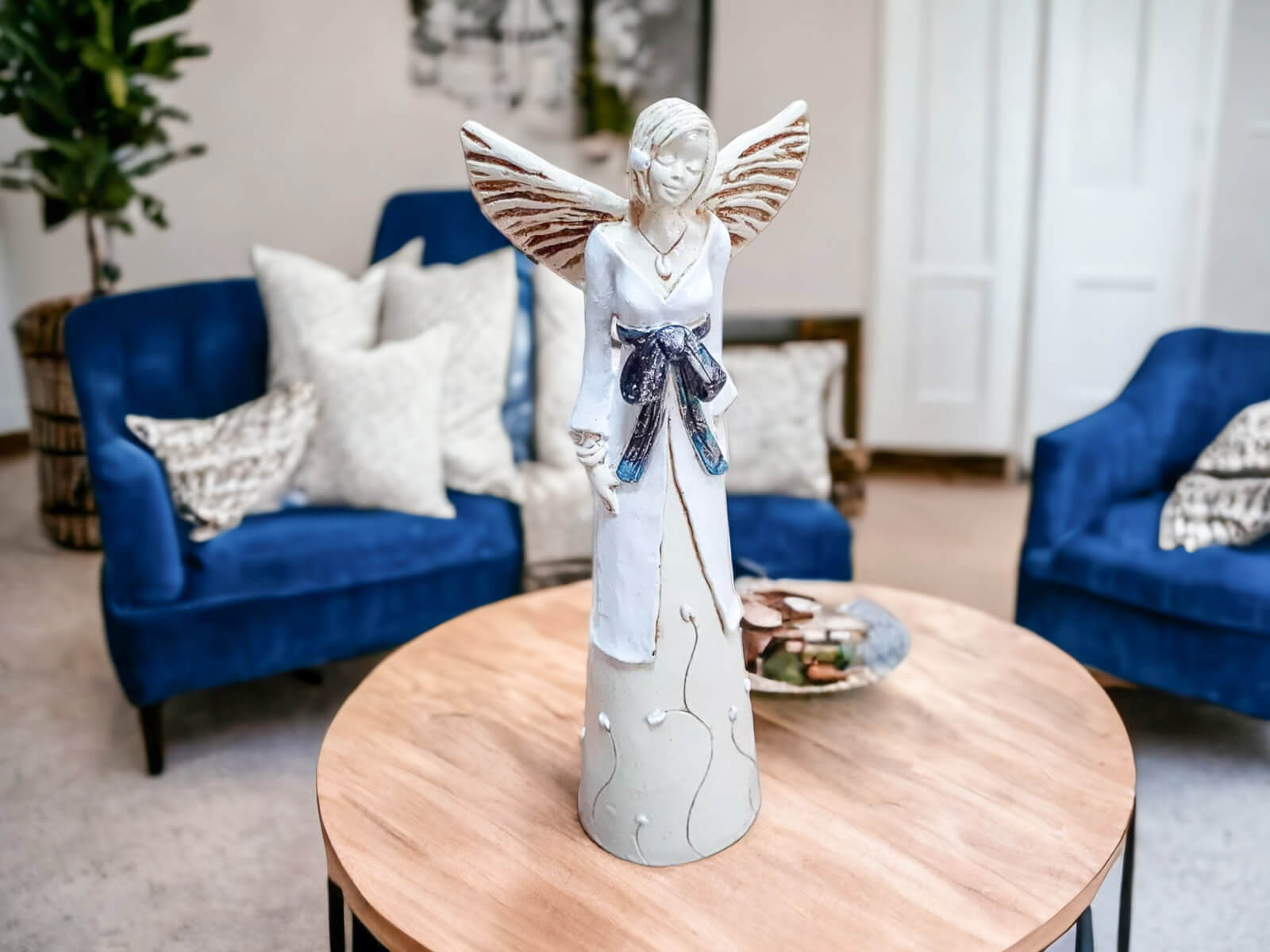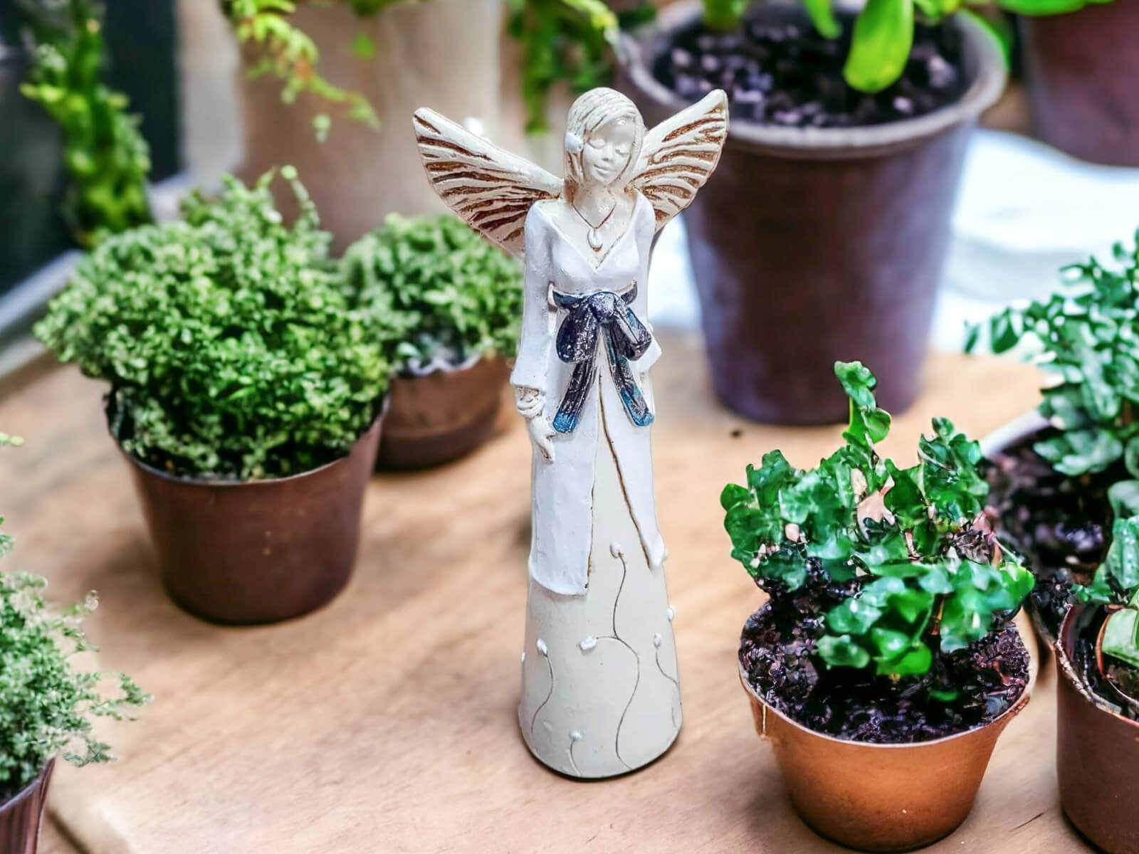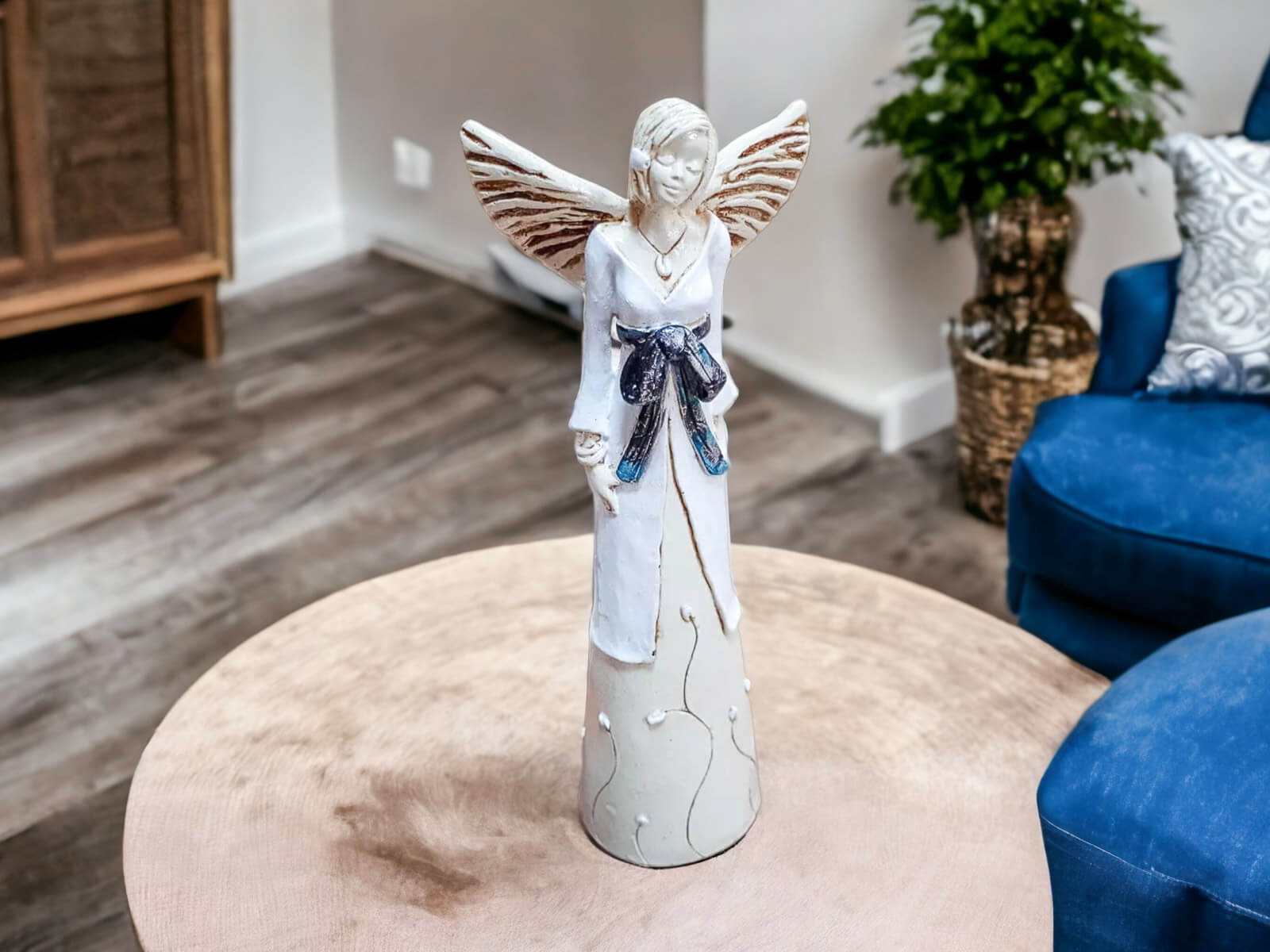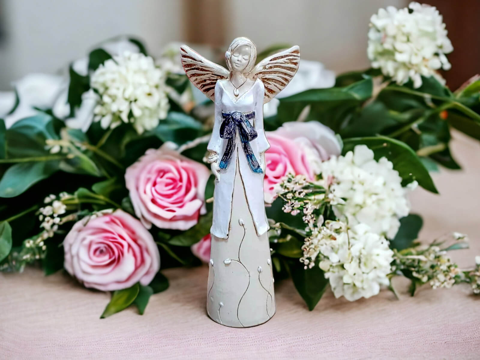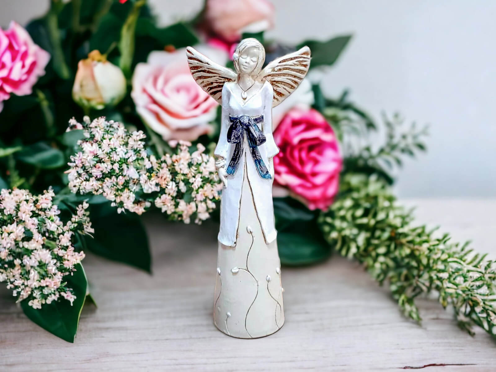Anioł Lily jest wykonany ręcznie z gipsu. Należy do figurek stojących, dzięki czemu można go gdziekolwiek postawić. Przedstawia kobietę w biało-beżowej sukni. Suknia na górze posiada białą narzutkę przepasaną czarną kokardą. Dolna, beżowa część kreacji jest udekorowana kwiatami. Anioł ma krótkie, jasne włosy oraz rozłożone skrzydła skierowane ku górze. Posiada na sobie wiele dodatków w postaci naszyjnika, bransoletek oraz spinki na głowie. Figurka nadaje się na dekorację wnętrza lub na prezent dla bliskiej osoby.