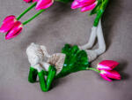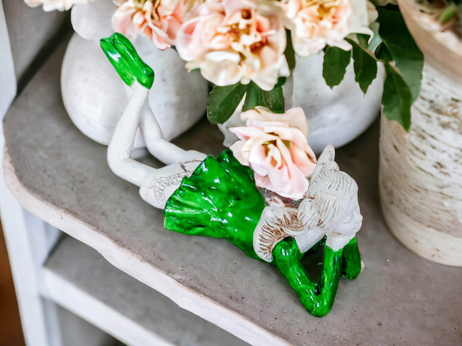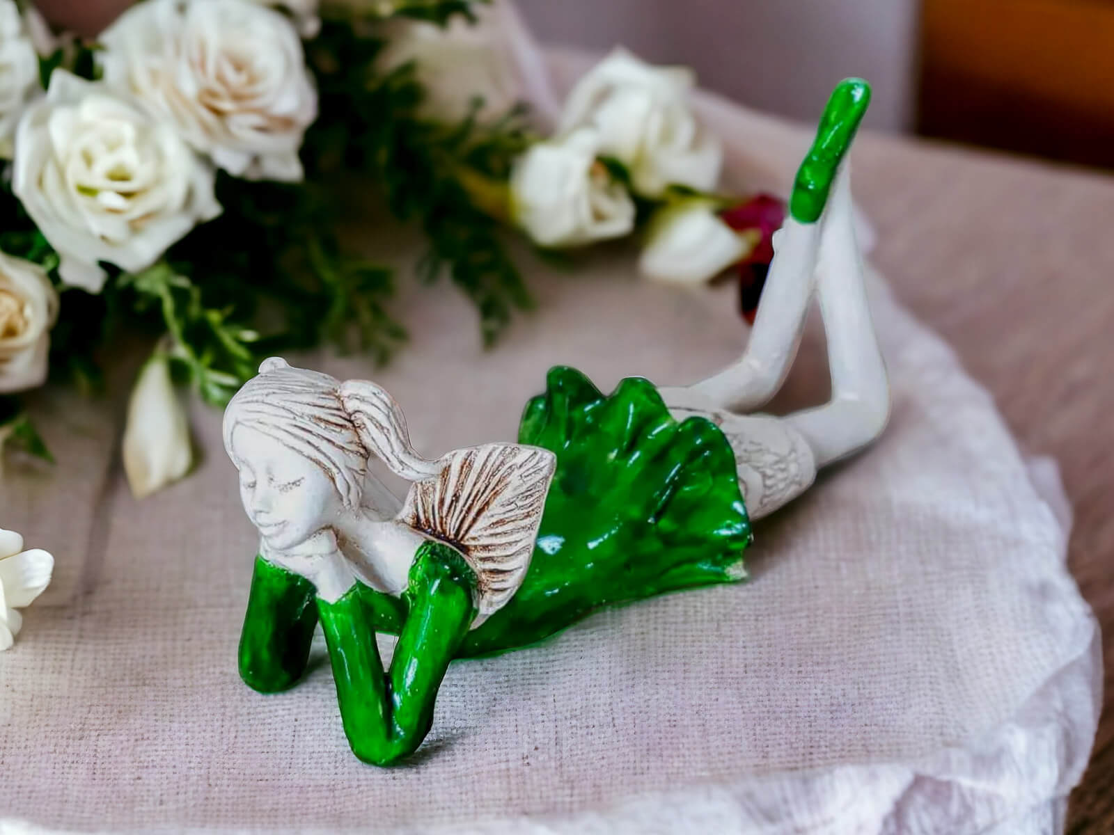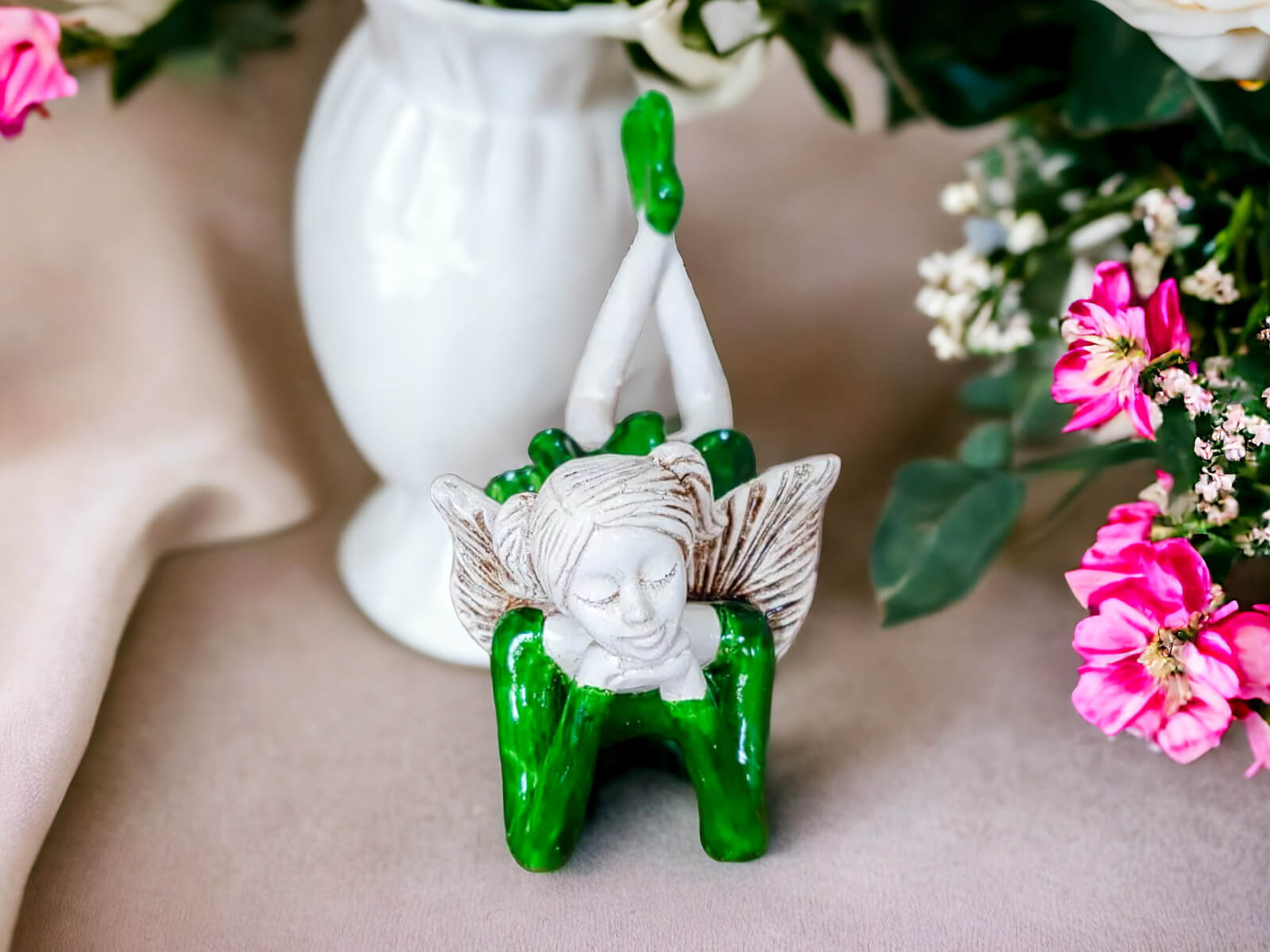 Aniołek Dixie w zielonej sukience to urocza, uśmiechnięta dziewczyna. Jej włosy, upięte w małe kucyki, kojarzą się z beztroską dziecięcych lat i przywołują wspomnienia. Dziewczynka jest zamyślona, pewnie marzy o lataniu w przestworzach, co jest możliwe dzięki jej niewielkim, zgrabnym skrzydłom. Kolor jej sukienki wzmacnia to wrażenie. Aniołek Dixie jest świetnym pomysłem na prezent nie tylko dla małej dziewczynki.