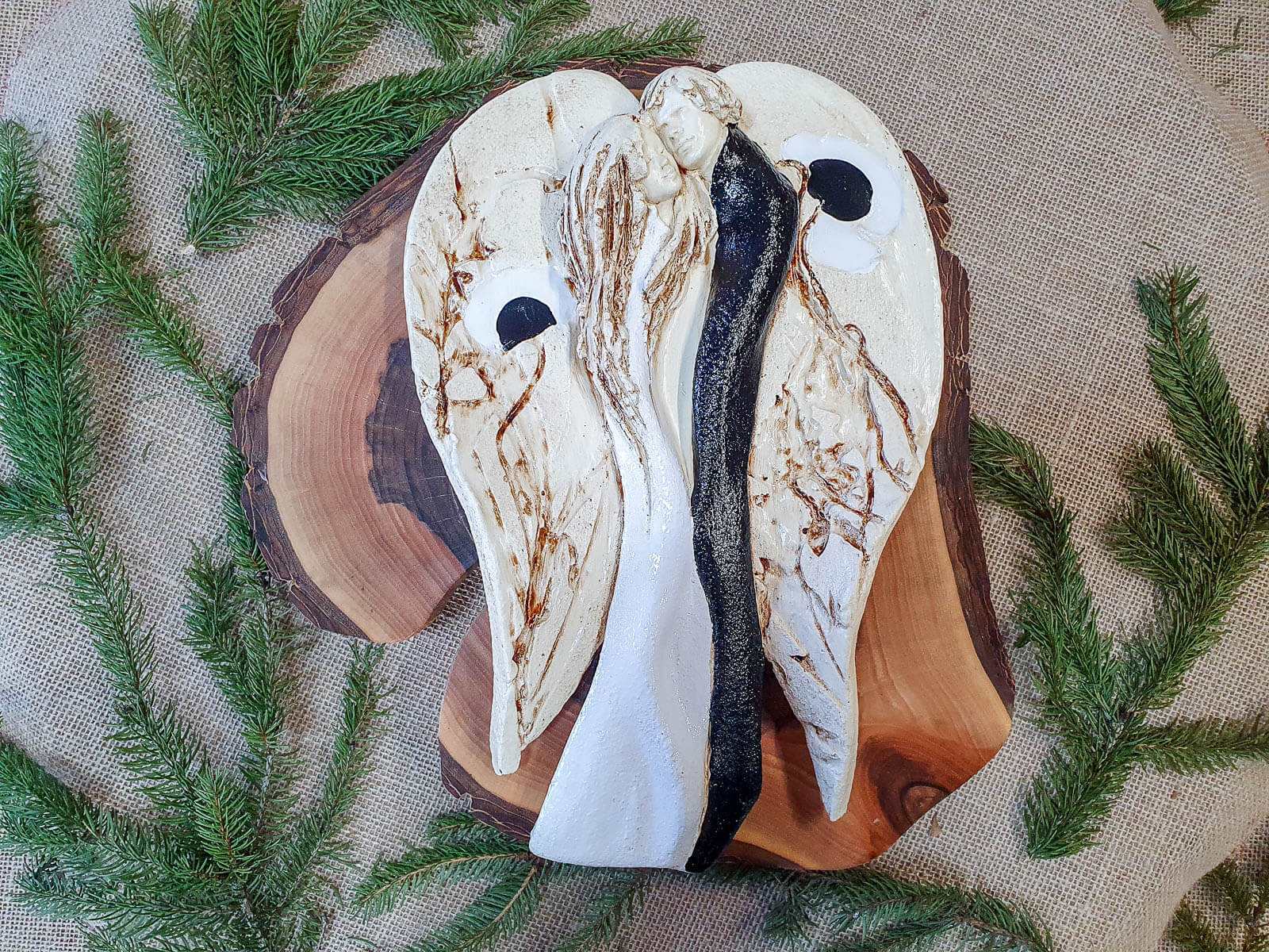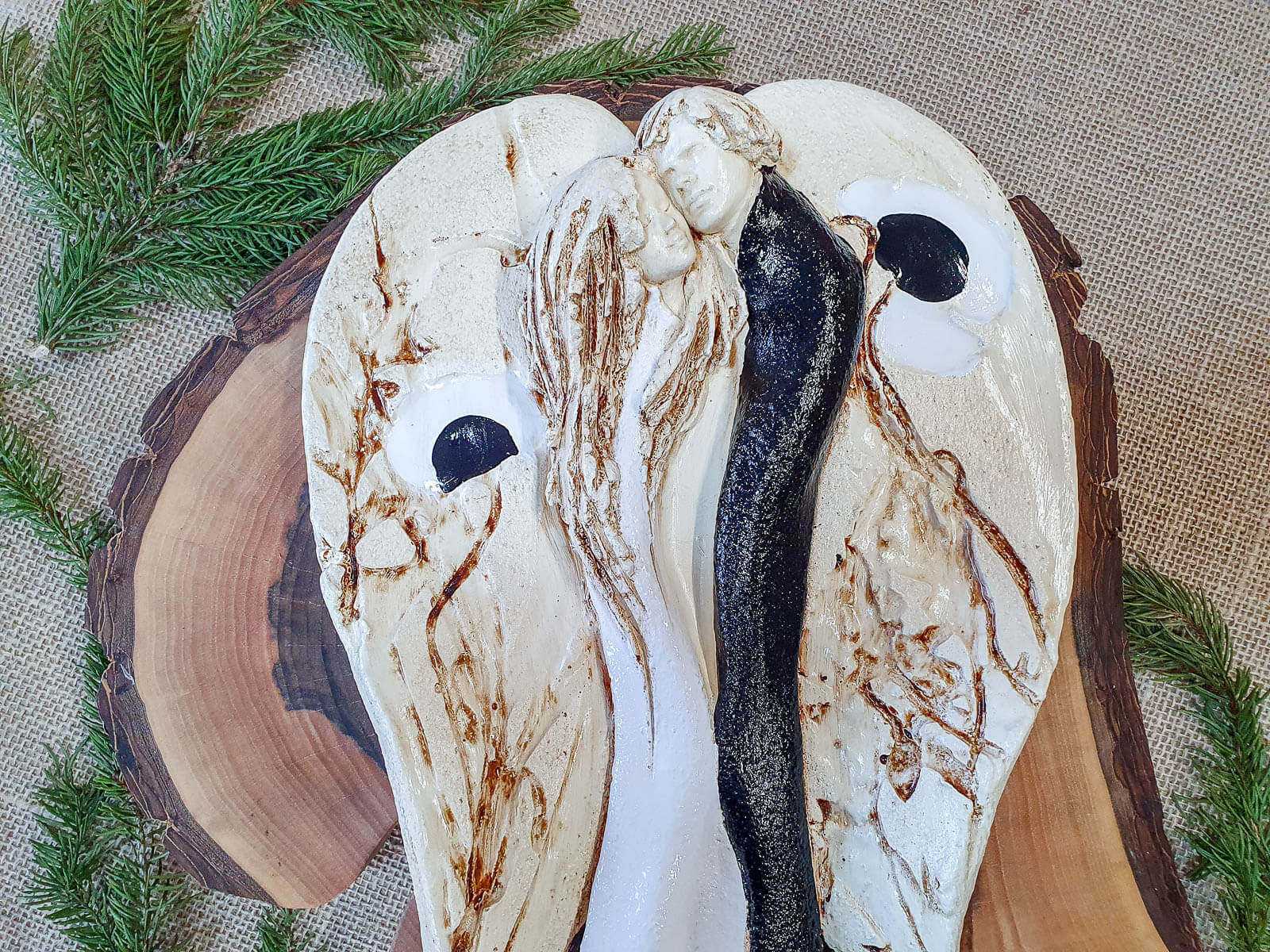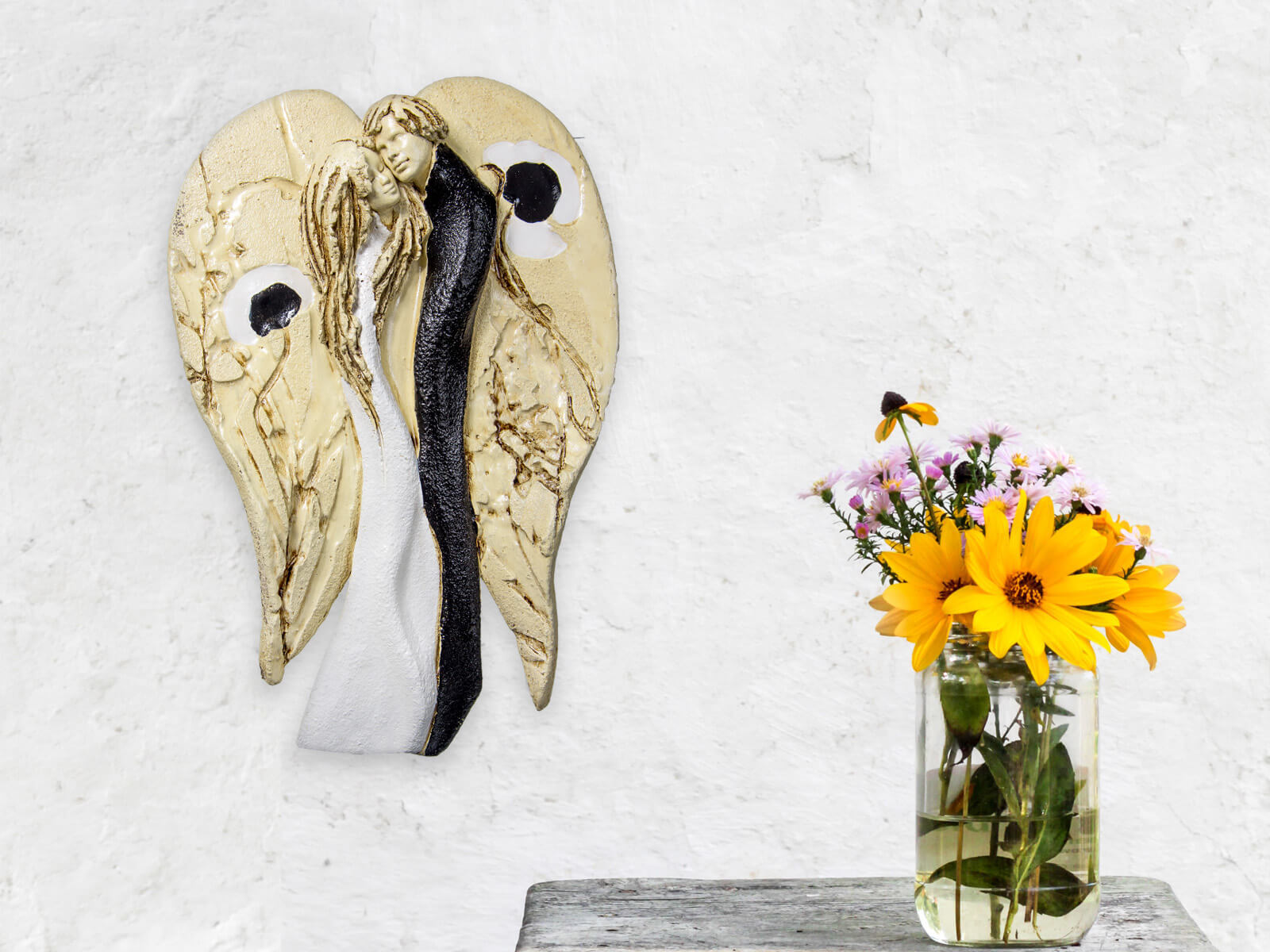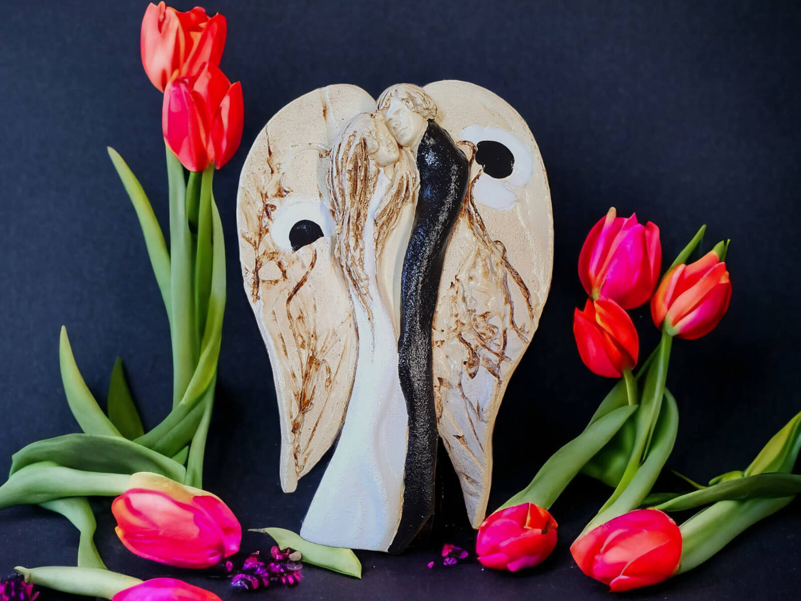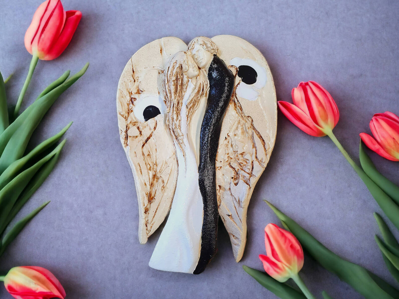 Kochające anioły to ręcznie wykonana, wisząca figurka dwóch aniołów. Anioły w objęciu tworzą jedność, są scalone miłością. Figurka jest ręcznie malowana i idealnie nadaje się na prezent ślubny dla młodej pary, rocznicę ślubu i inne ważne wydarzenie. Anioły w rzeczywistości prezentują się dużo lepiej niż na zdjęciach, a obdarowane osoby z reguły są zachwycone z prezentu. Anioły oferowane są również w wersji z eleganckim, drewnianym pudełkiem. Tutaj przeczytasz więcej o harmonii Yin Yang.