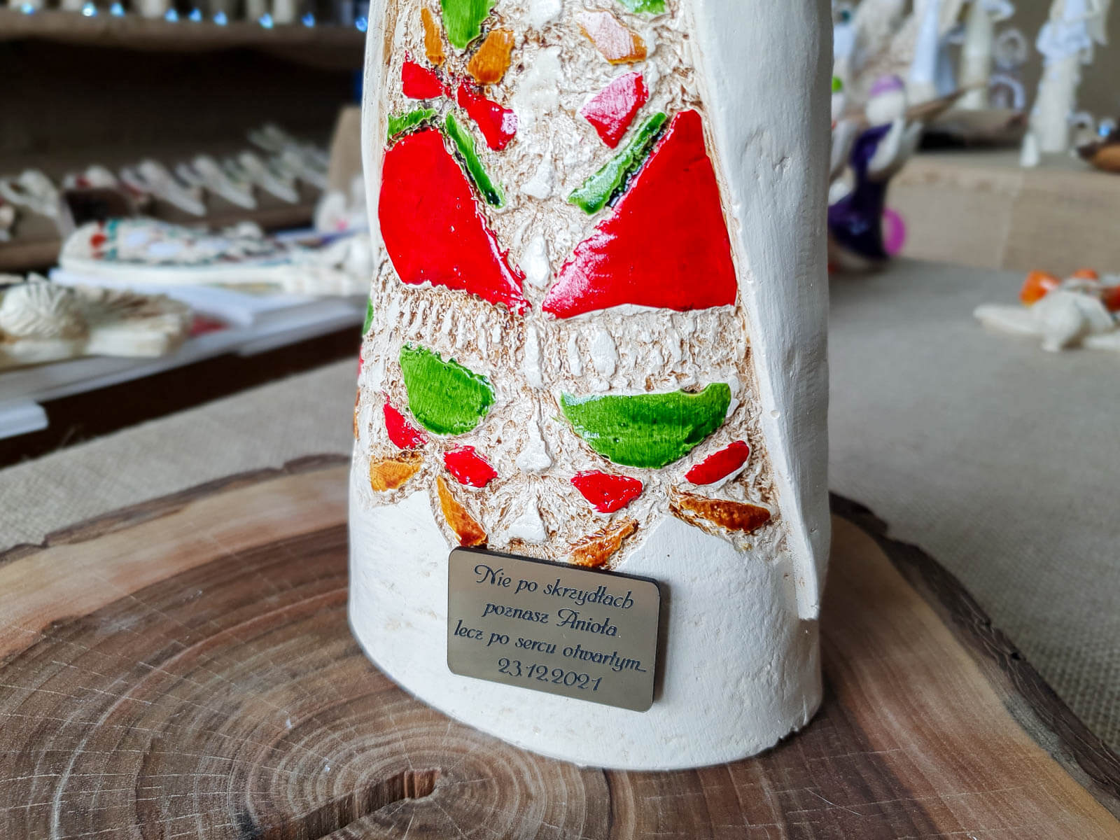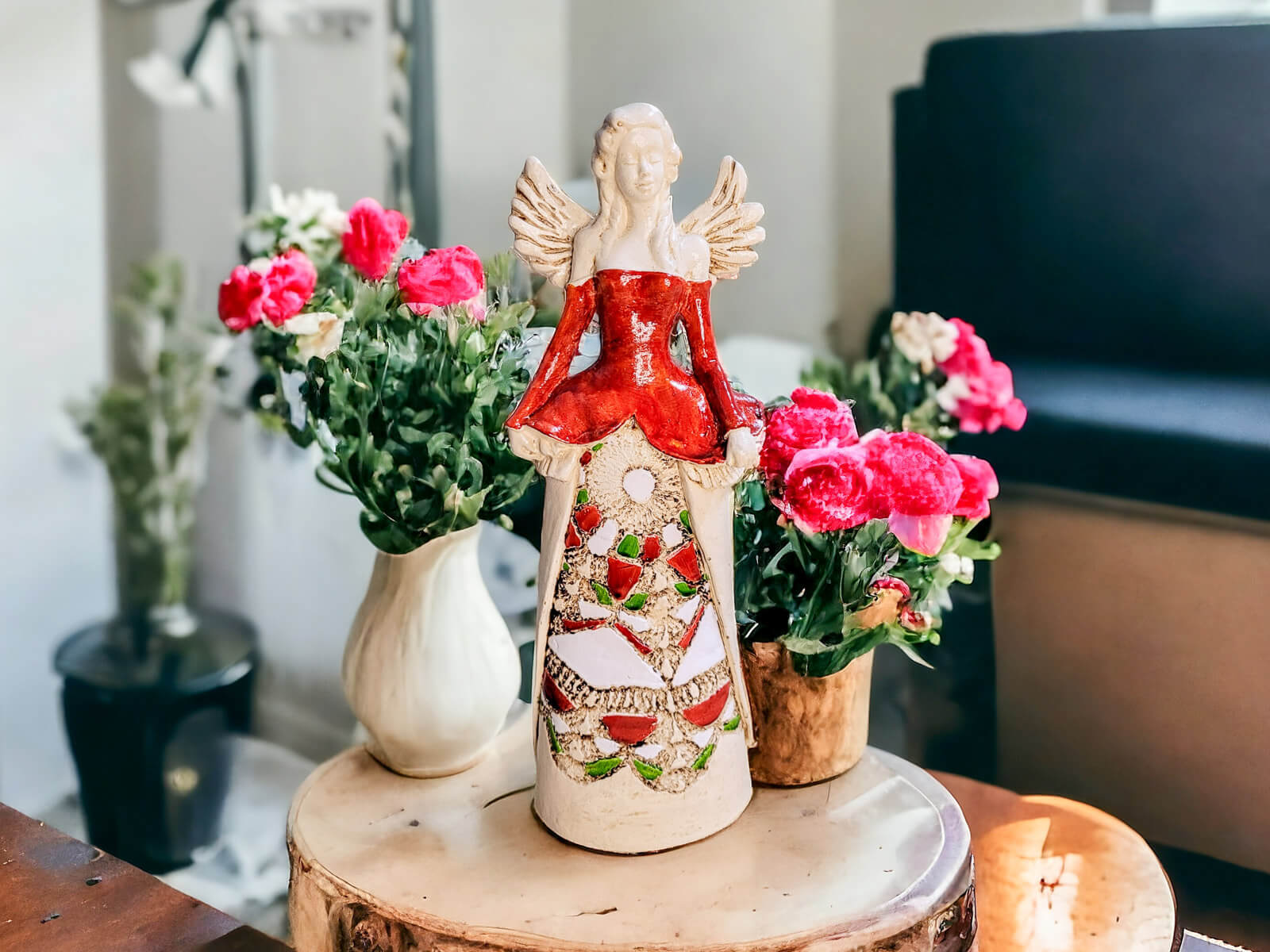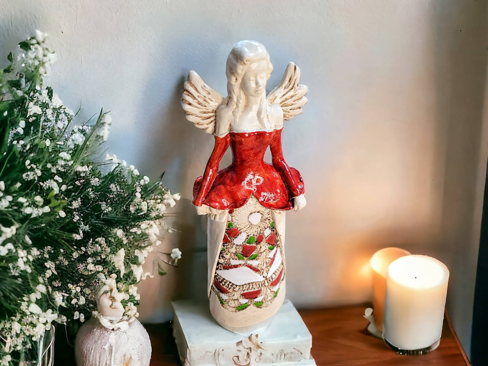Anioł Anna jest ręcznie wykonaną ozdobą z gipsu. Można go postawić w różnych miejscach, ponieważ jest stojący. Przedstawia kobietę w pięknej, kolorowej sukni. Góra sukni jest czerwona, a dół beżowy z kolorowymi wzorami. Ma on jasne, kręcone włosy i małe skrzydła skierowane ku górze. Idealnie nadaje się na prezent dla kobiety - żony, matki, babci czy przyjaciółki. Jego niespotykany wygląd przyciąga wzrok w salonie lub innym pomieszczeniu i stanowi doskonały dodatek dekoracyjny.