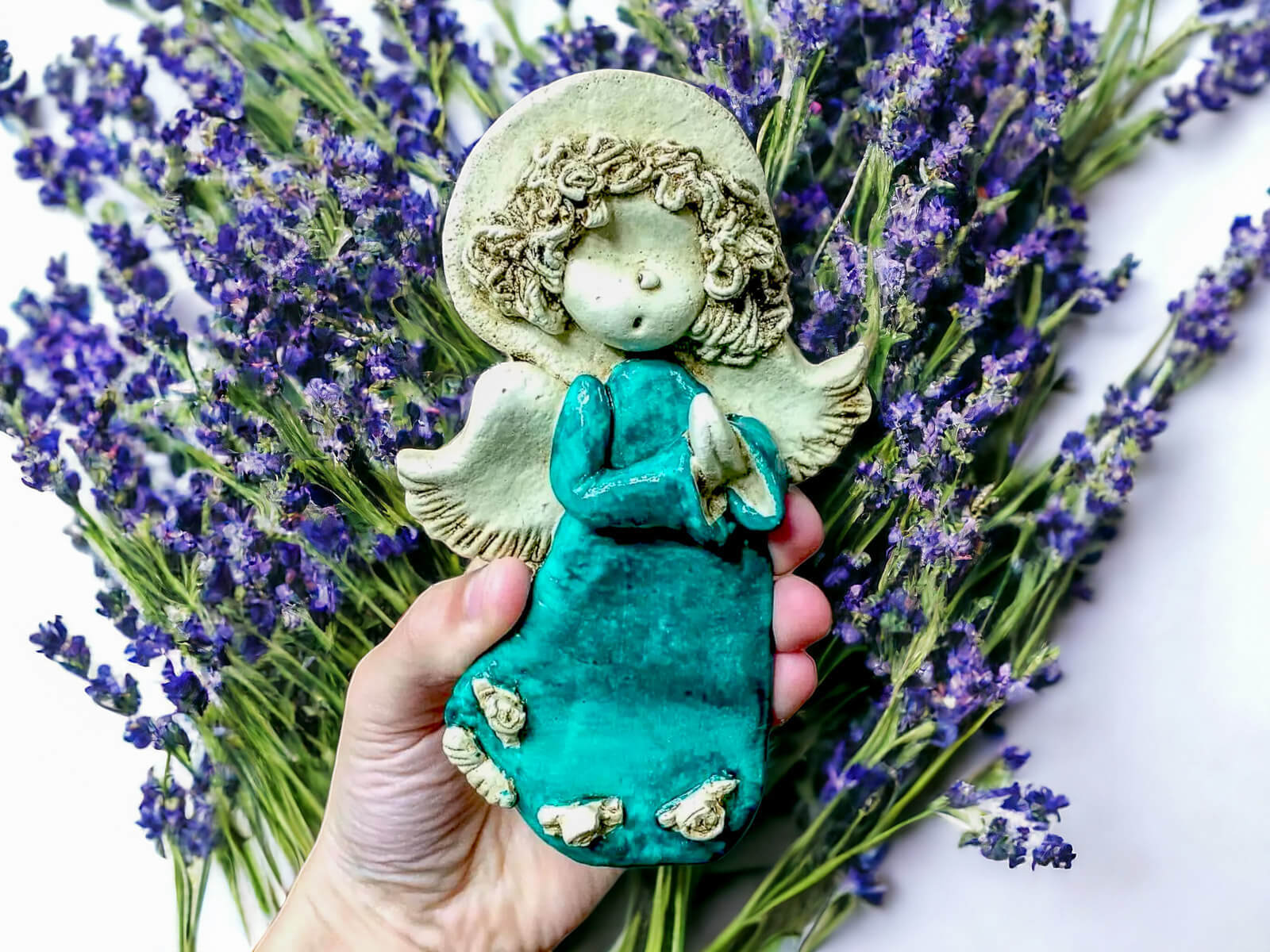 Śliczna figurka dekoracyjna aniołka Marzyciela w kolorze turkusu. Lilionek jest młodym chłopcem, który żyje marzeniami. Zawsze jest w błogim nastroju oraz cieszy się z życia. Zawsze jest zamyślony i patrzy przez różowe okulary. Jest ubrany w turkusową szatę. Kolor turkusowy jest symbolem szczęścia i powodzenia. Figurka idealnie nadaje się na prezent dla dziecka. Aniołek postawiony w każdym miejscu w domu będzie czuwał nad domownikami.