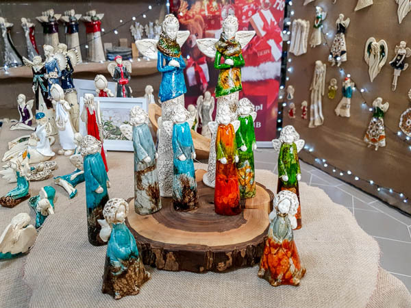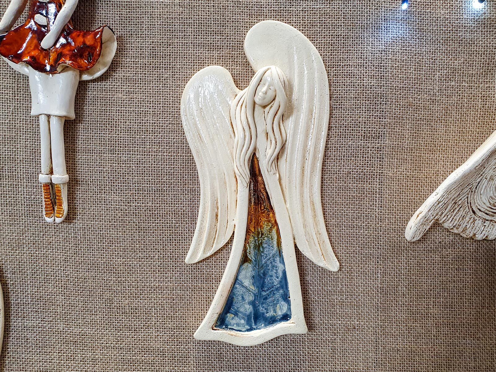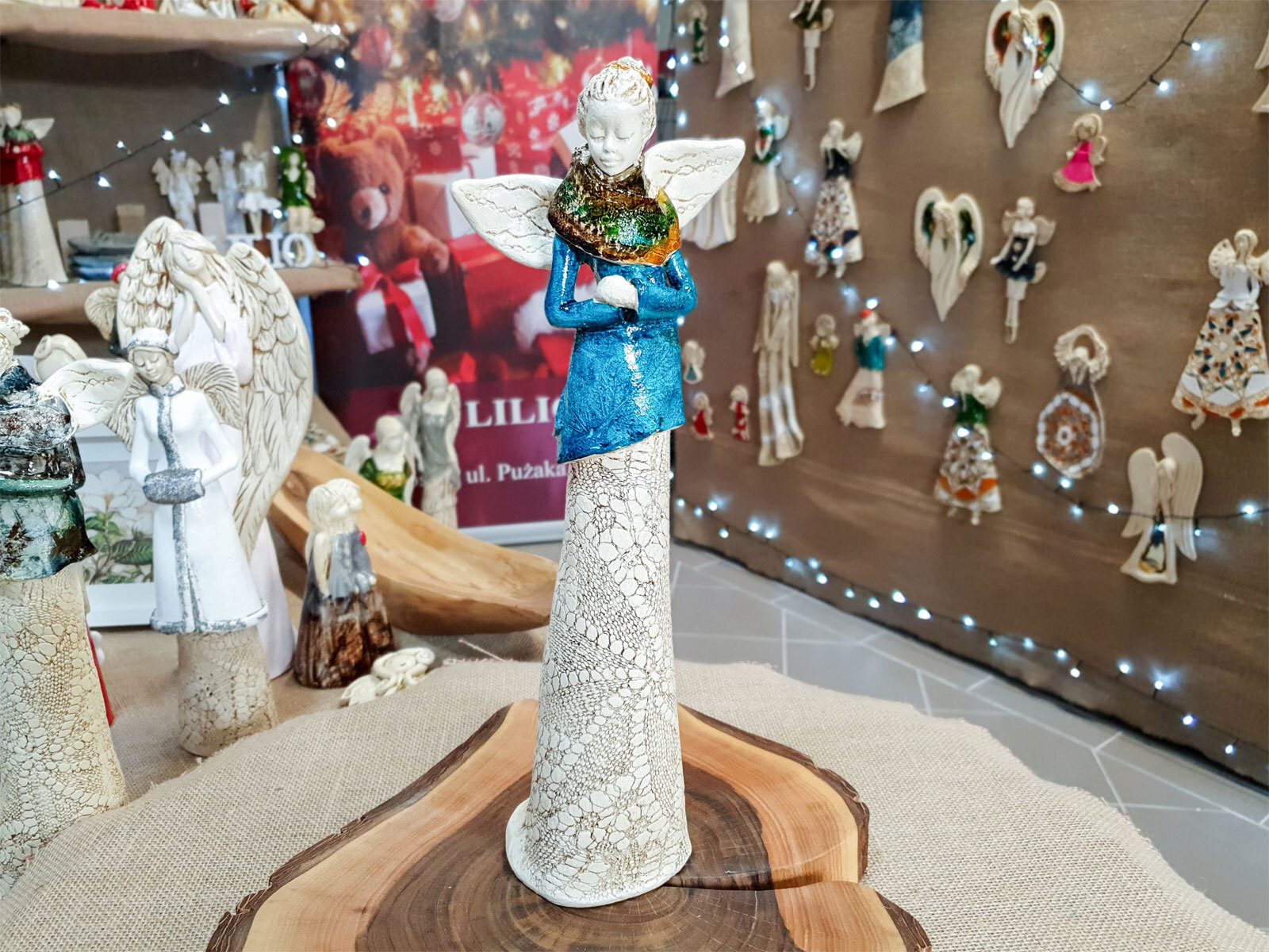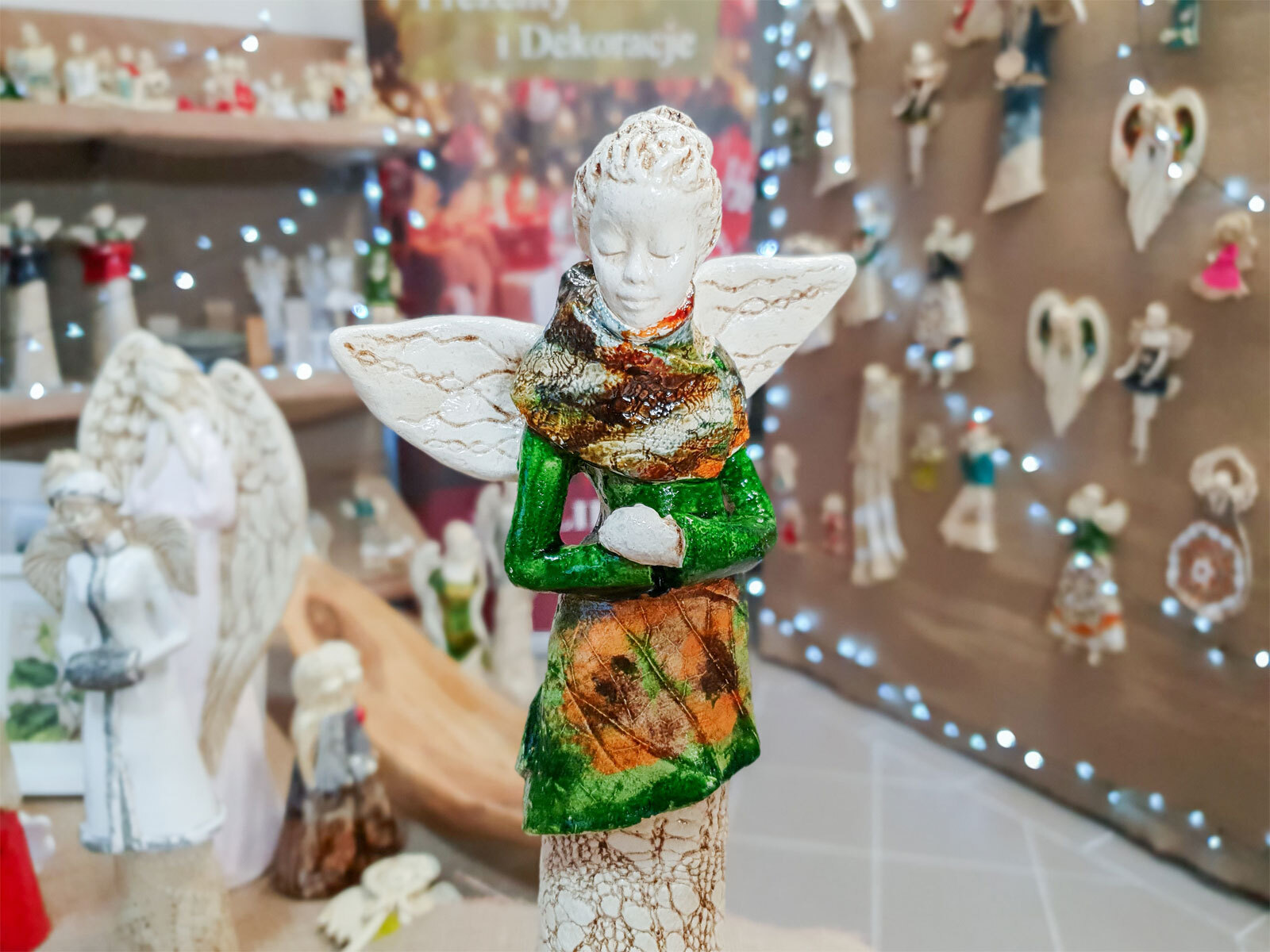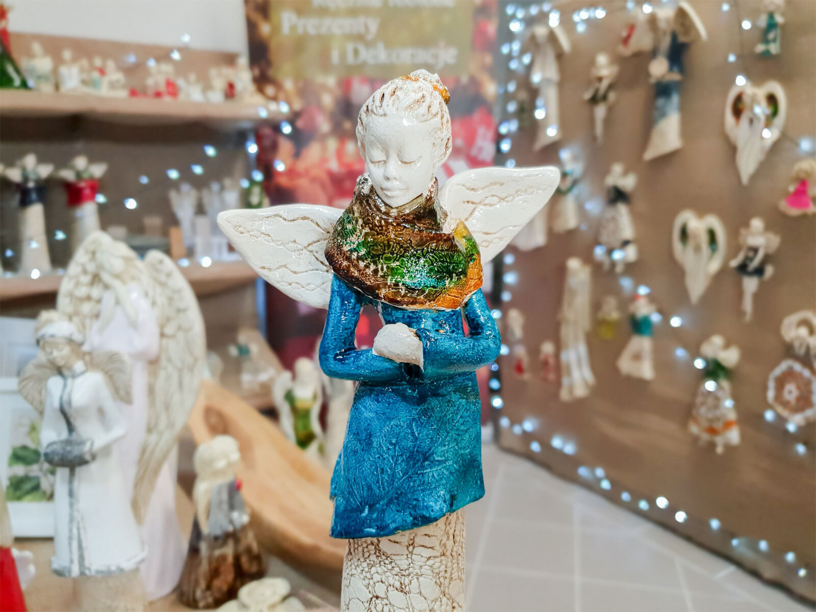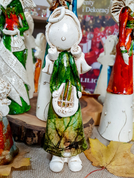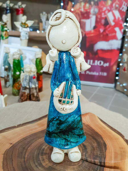 Druga propozycja dla dzieci to śliczne, siedzące małe aniołki z malutkimi skrzydełkami. Górna część figurek jest gładka, a dół sukienek jest jakby otulony wzorem z odciśniętych liści. Wygląda to uroczo i bardzo ciekawie. Aniołki mają niebieski kolor z brązowym wzorem lub szary z rudym zdobieniem. To świetna propozycja dla najmłodszych.