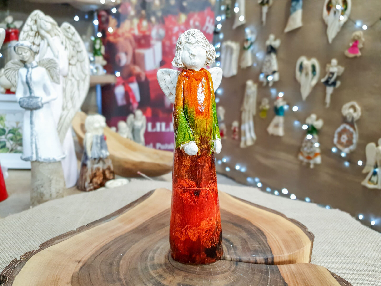 Ręcznie robione anioły z kolekcji Leaf to niepowtarzalne i przepiękne figurki. Zdobienia z odciśniętych liści oraz cieniowania kolorów tworzą wyjątkowy i ażurowy efekt. Kawałek prawdziwej przyrody odciśnięty na kolorowych częściach figurek to niecodzienna i bardzo unikalna dekoracja. Spośród tak ozdobionych aniołów z różnych serii każdy znajdzie dla siebie wyjątkowego jesiennego anioła.