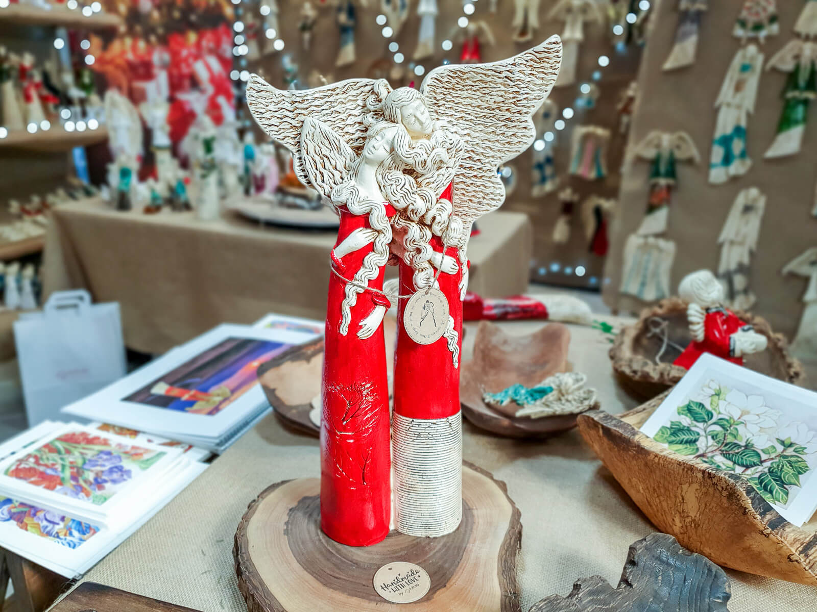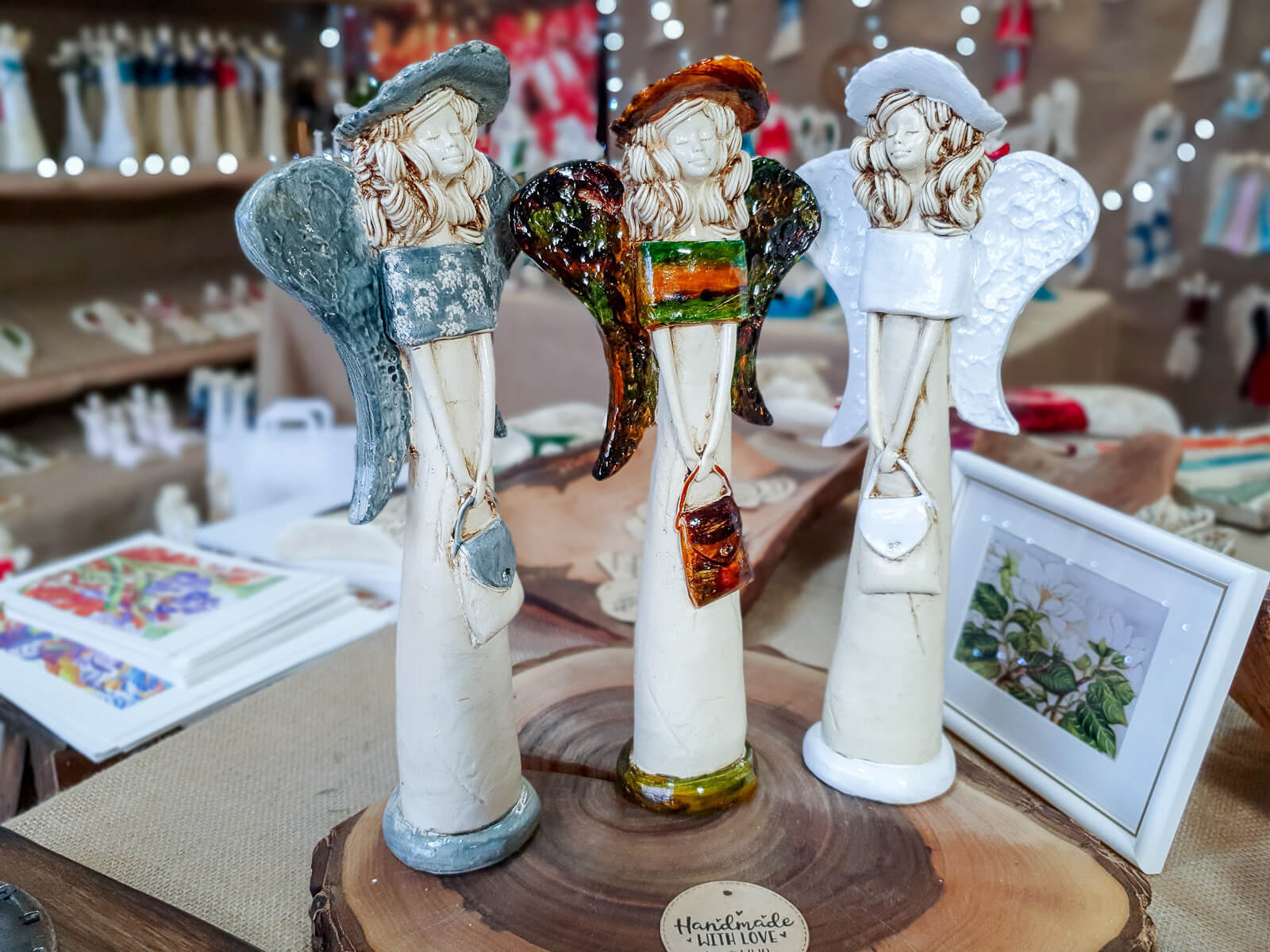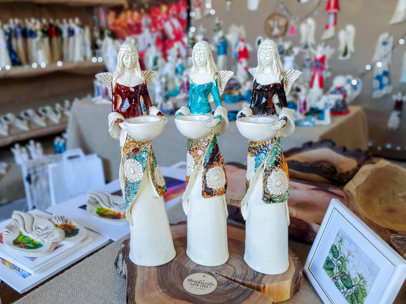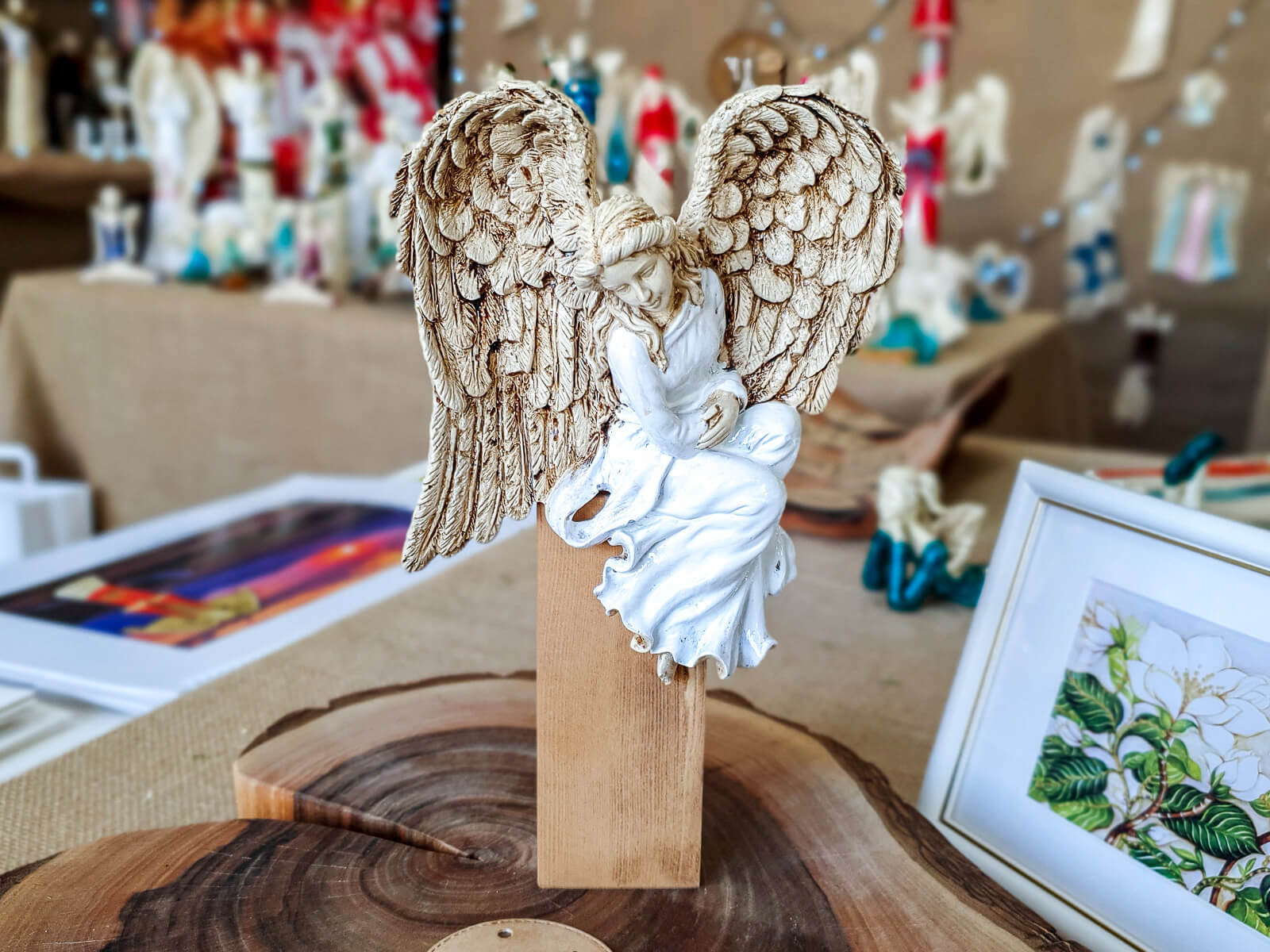 Nasze ręcznie robione anioły tworzymy z masy gipsowej przygotowanej według własnej techniki, a unikalne kompozycje farb sprawiają, że ozdoby pięknie lśnią zachwycając swoim blaskiem. Anioły są różnych rozmiarów, od kilkunastu cm do ponad 60 cm. Mamy anioły do postawienia, siedzące, do powieszenia lub przyklejenia na ścianie czy ramce o bardzo zróżnicowanej formie, kolorystyce i zdobieniach.